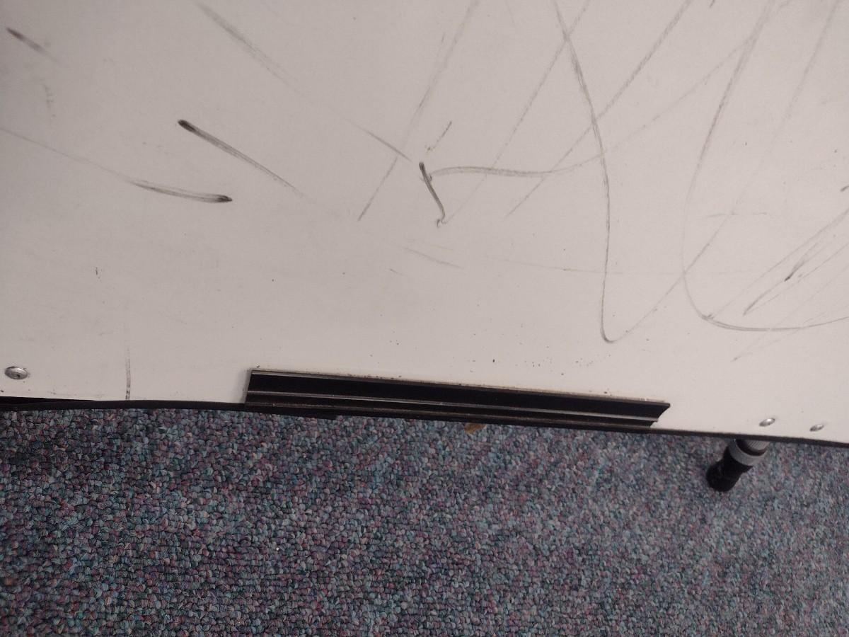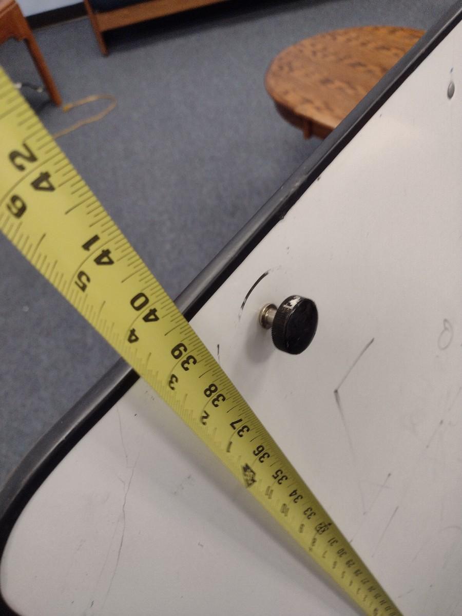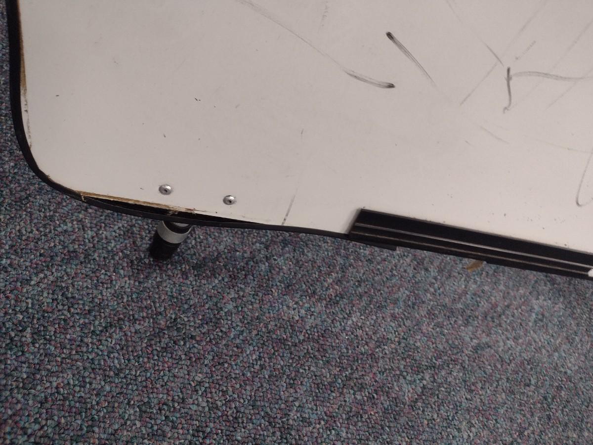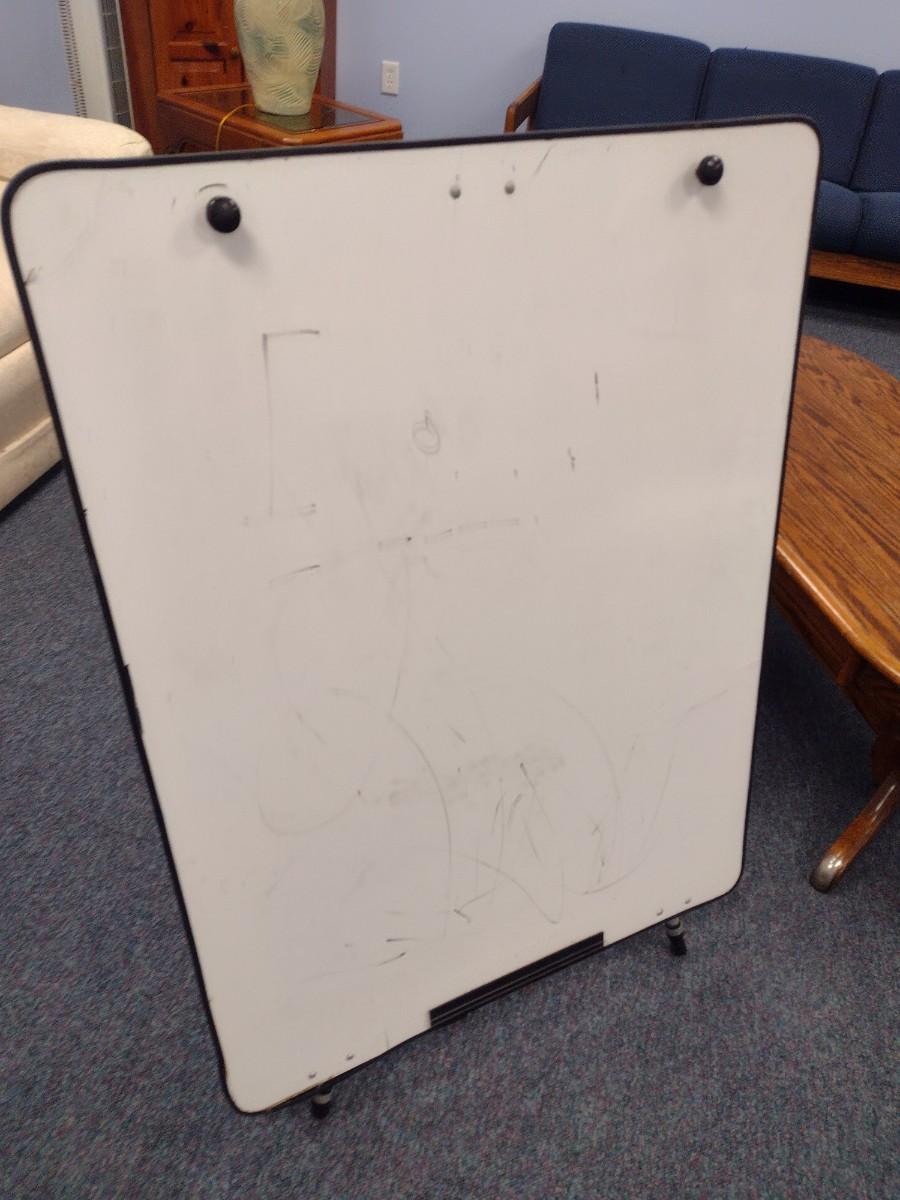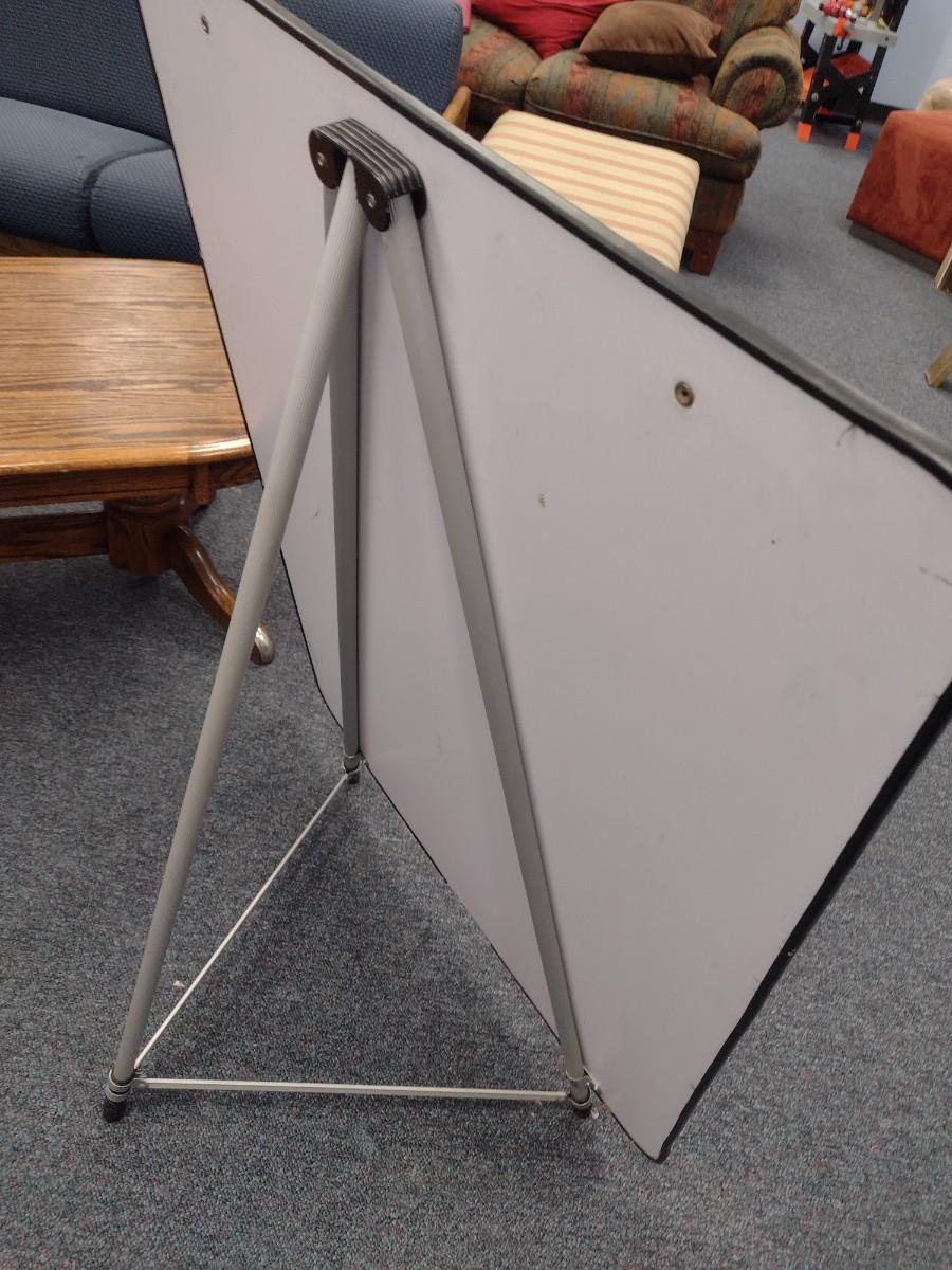 Dry Erase Board on Aluminum Tripod. Eraser and Marker Tray is missing. See pictures for condition issues.