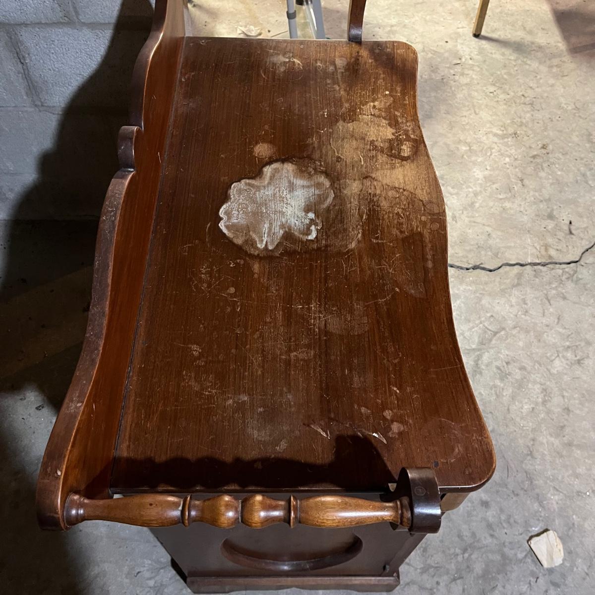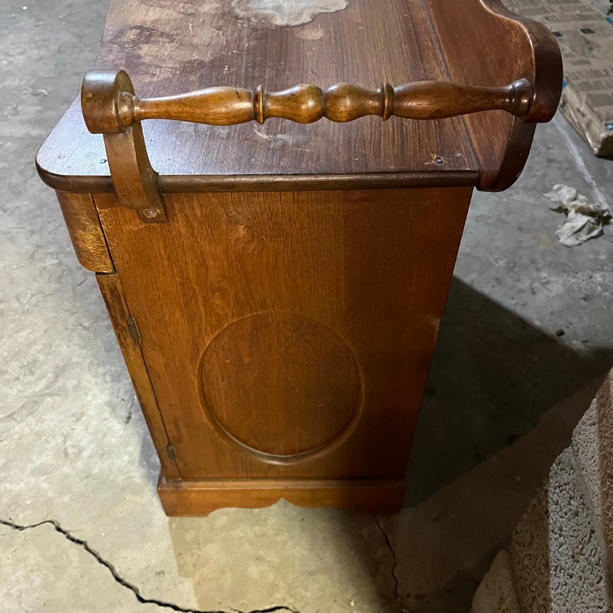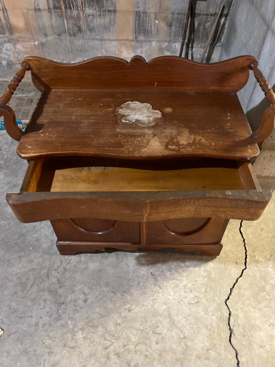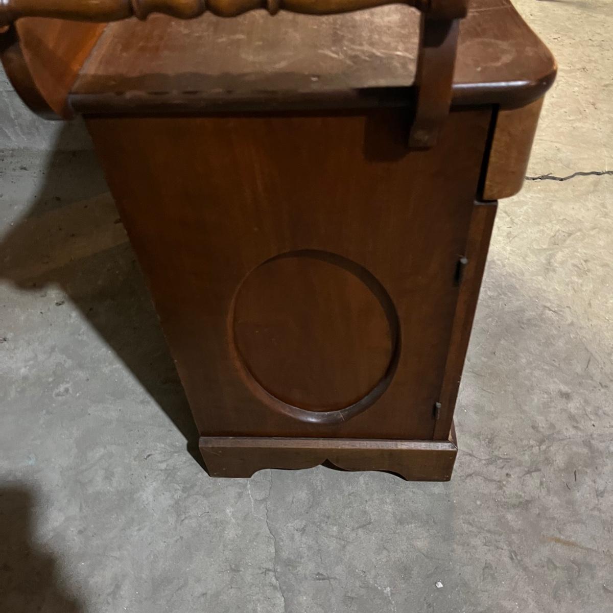 Lot includes a solid wood dry sink with towel rails. Top of piece has stains, see pictures. No key. Piece measures 17” x 36” x 32”.