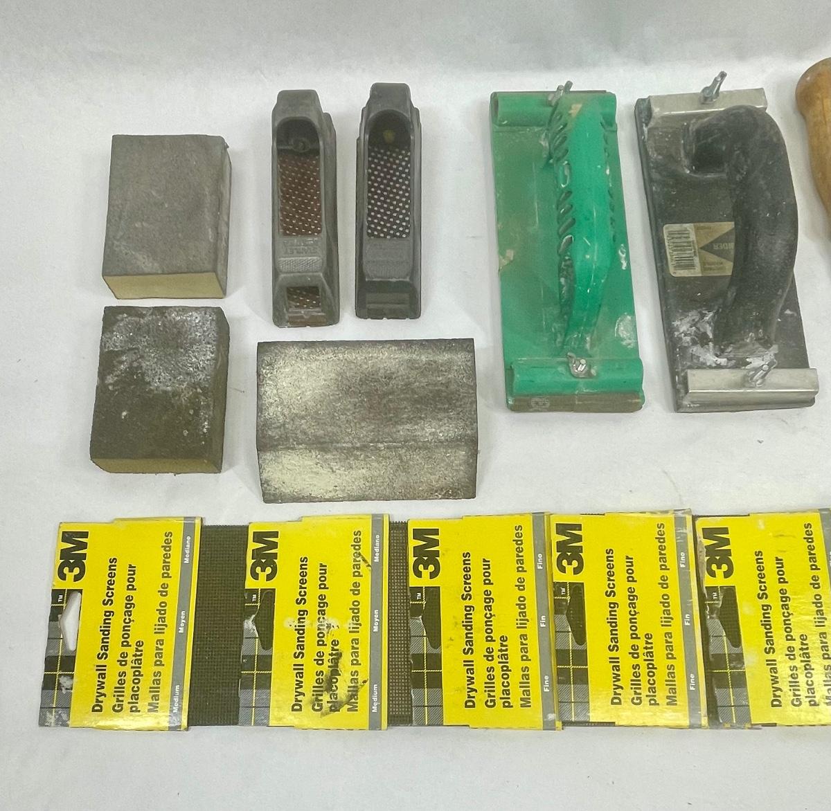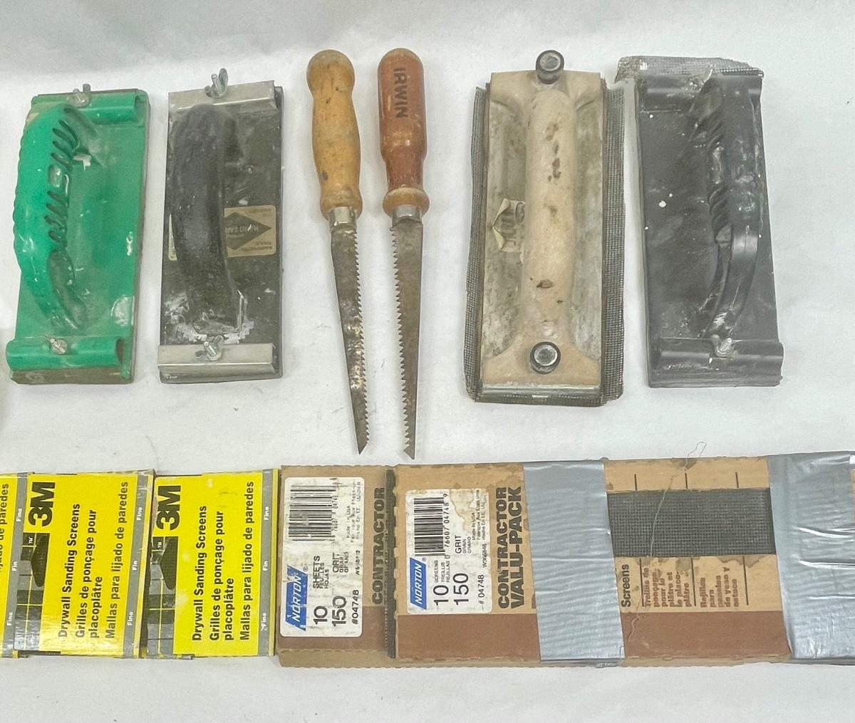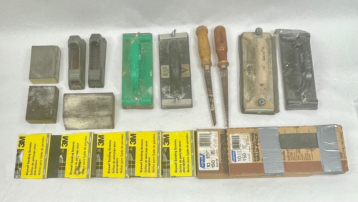 2 drywall small-hole saws, 3 sanding blocks, 2 cheese-grater sanding blocks, 4 hand-held sanders, and 7 packs of various-grit sanding pads. Tools are all in fair used condition. Sanding pads appear to be new in box.
