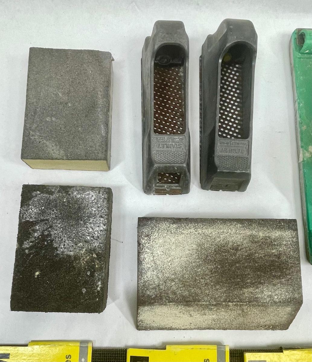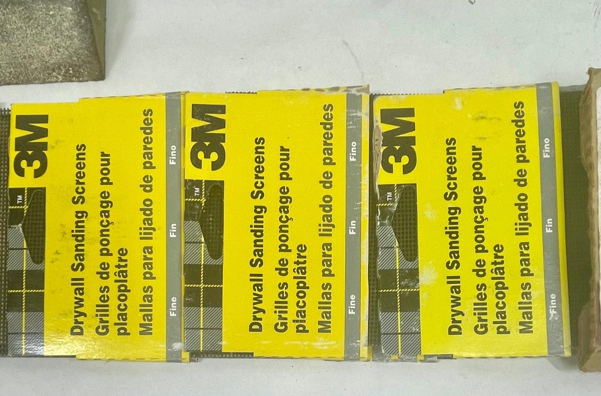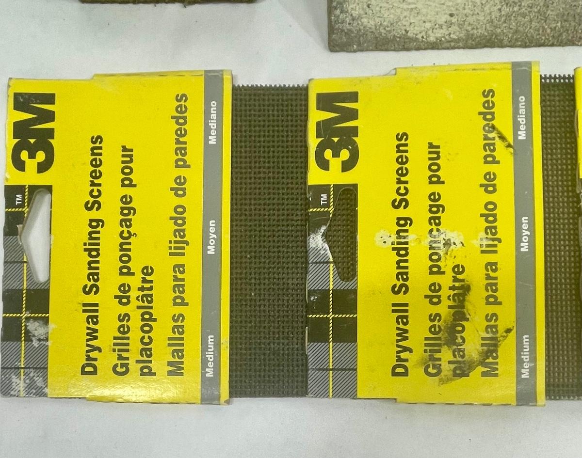 2 drywall small-hole saws, 3 sanding blocks, 2 cheese-grater sanding blocks, 4 hand-held sanders, and 7 packs of various-grit sanding pads. Tools are all in fair used condition. Sanding pads appear to be new in box.