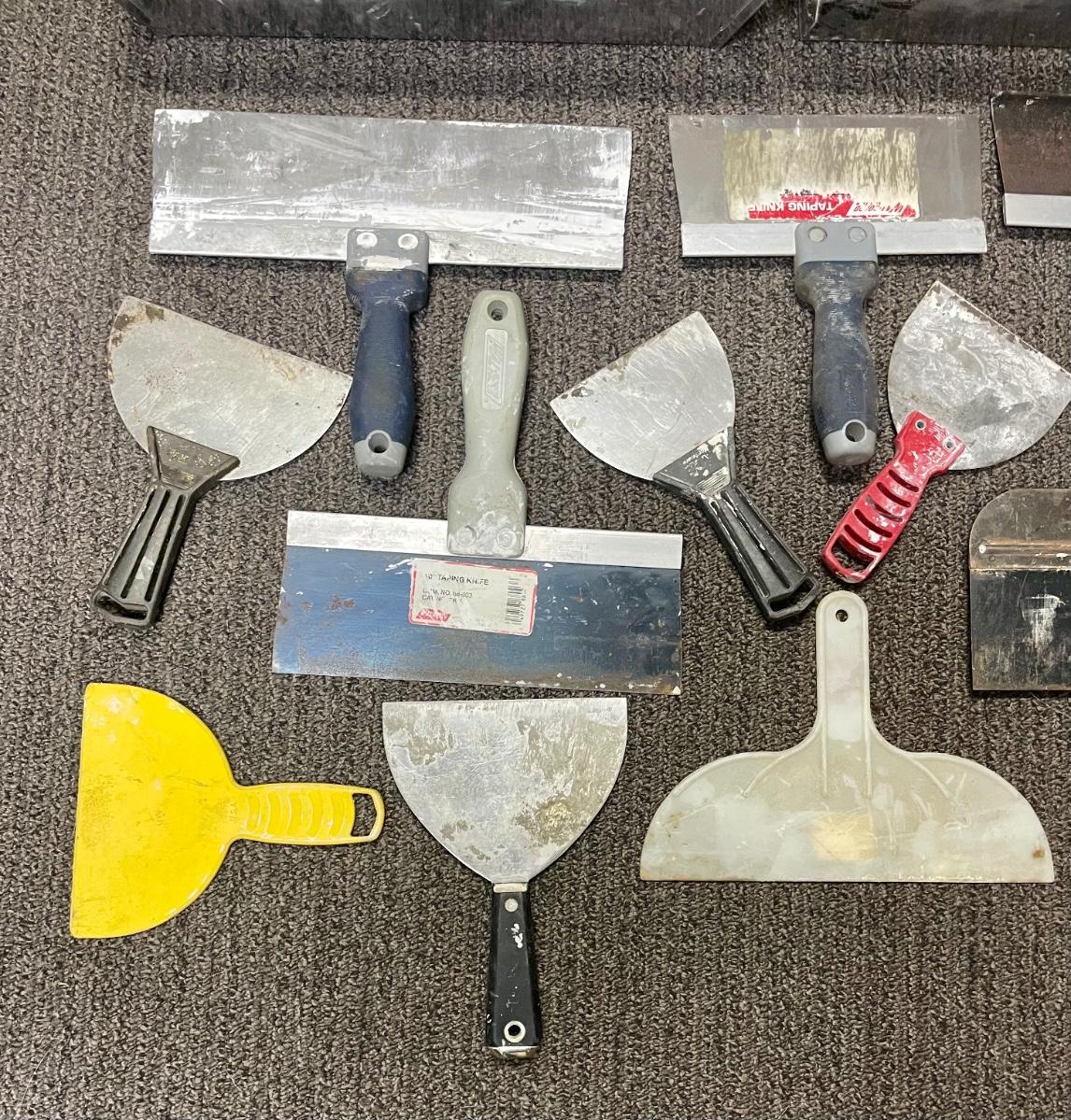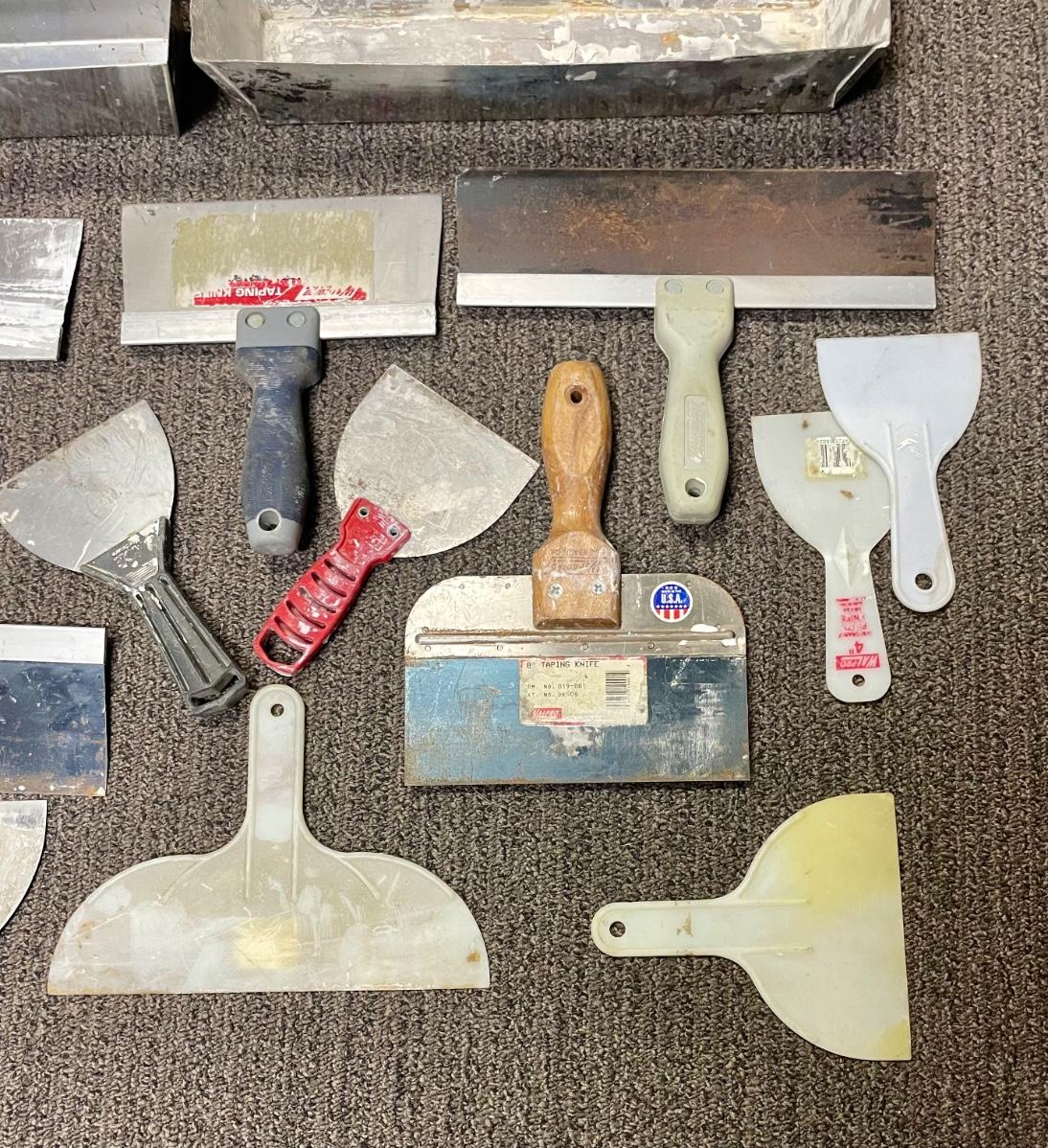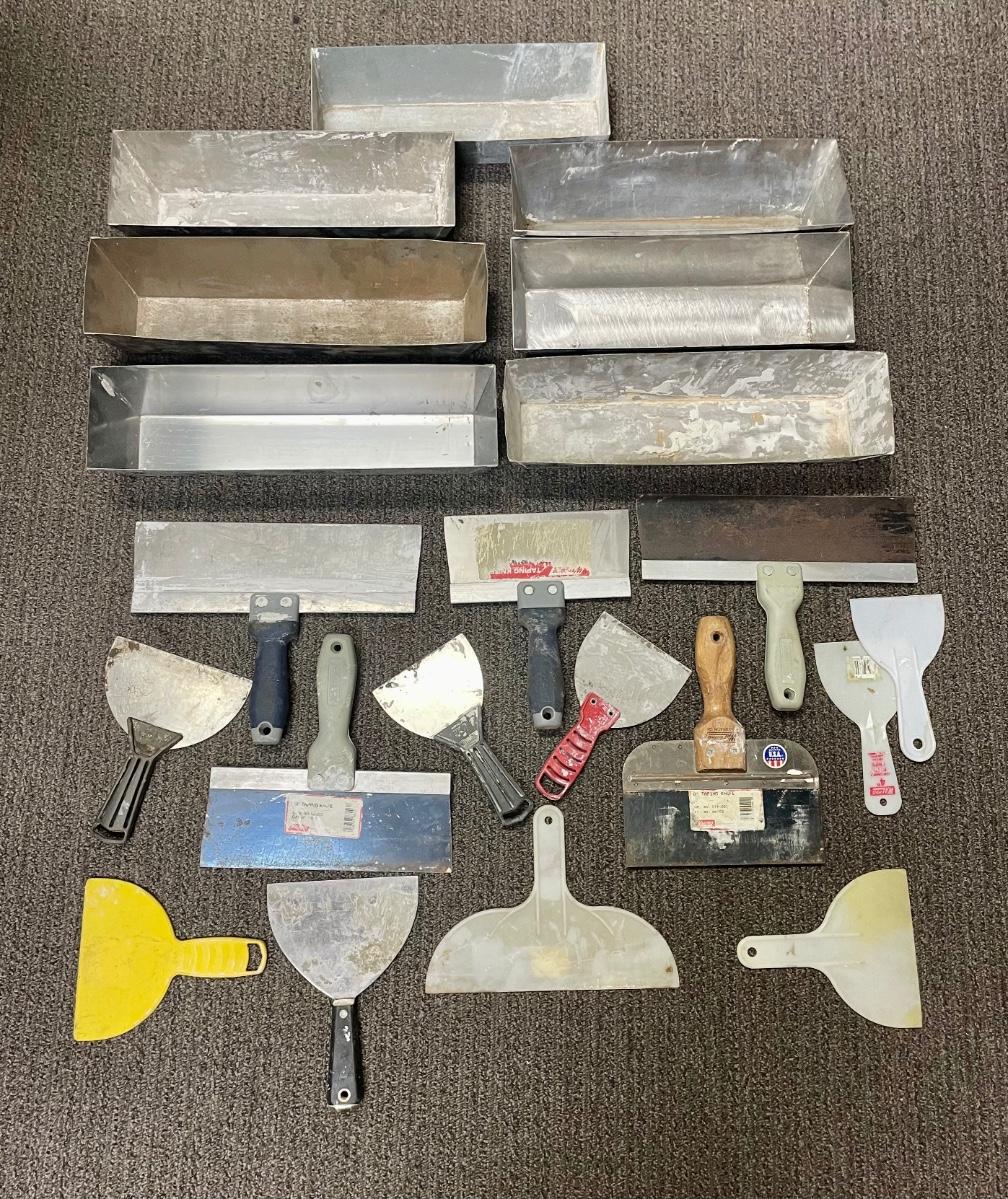 Stainless steel mud pans, different sized tape knives, putty knives, and plastic scrapers. More than xx pieces. Good used condition.