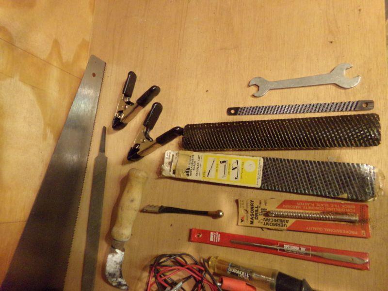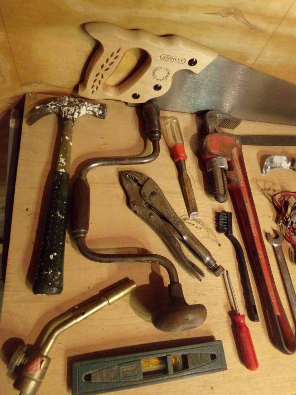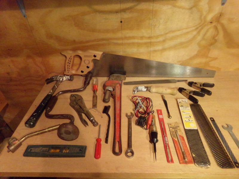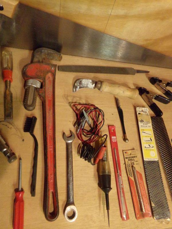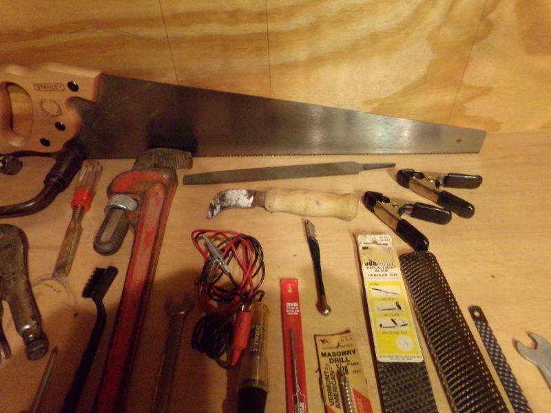 PIPE WRENCH, SAW, FILE, HAMMER, LEVEL AND LOTS OF OTHER TOOLS.