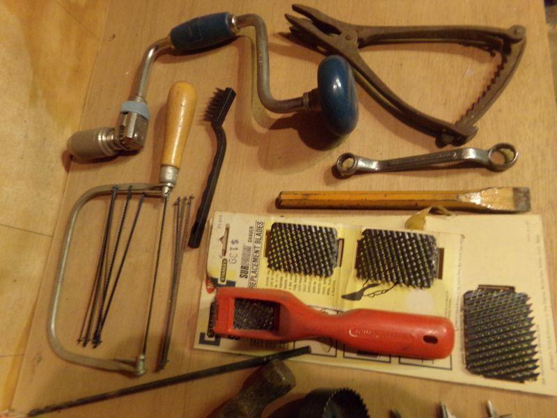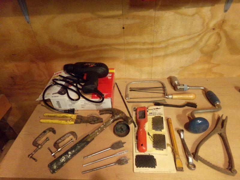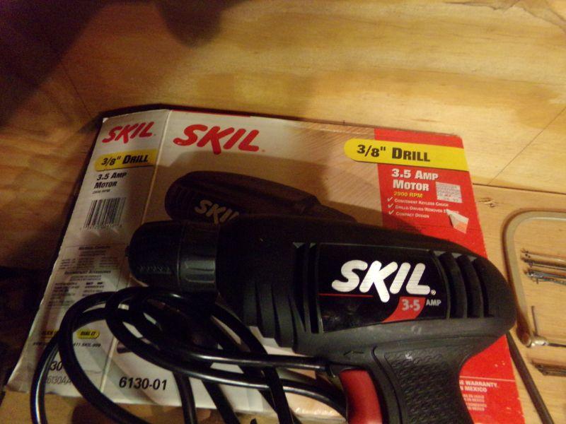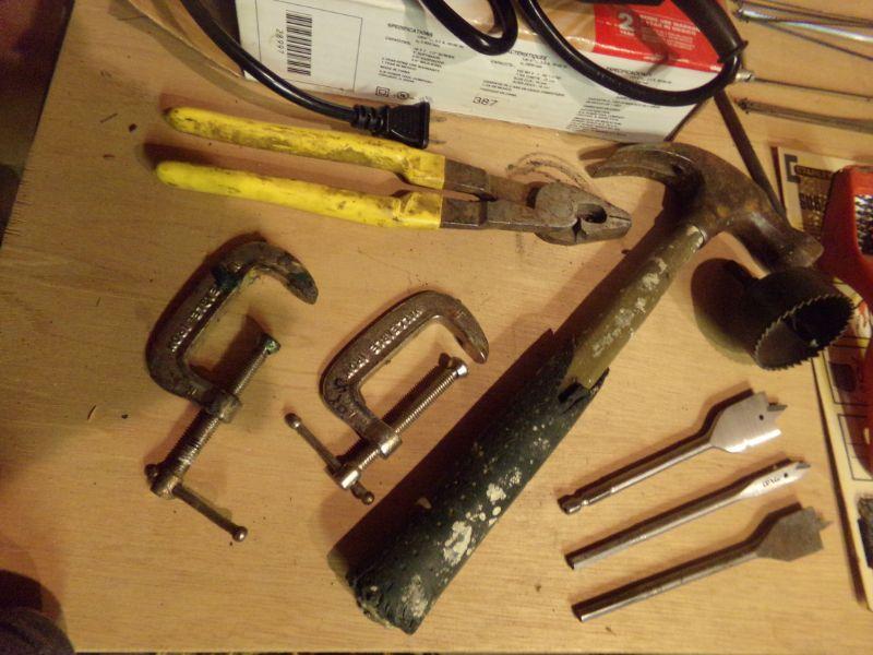 SKILL 1/8" DRILL, C-CLAMPS, HAMMER AND OTHER TOOLS.