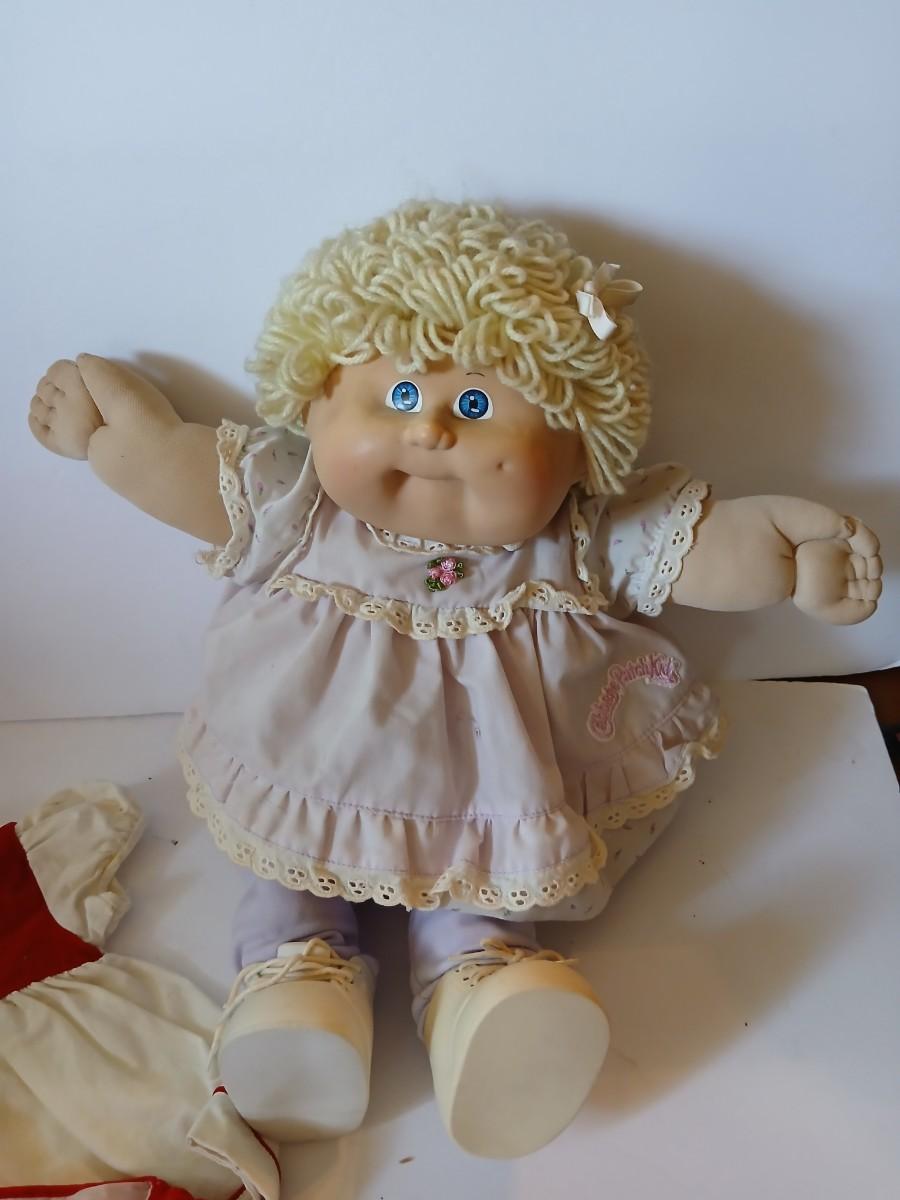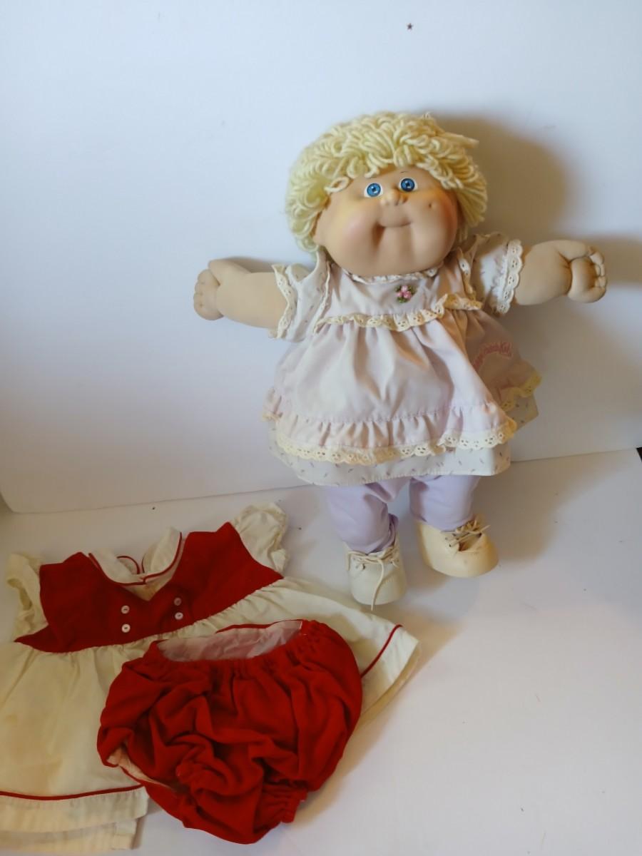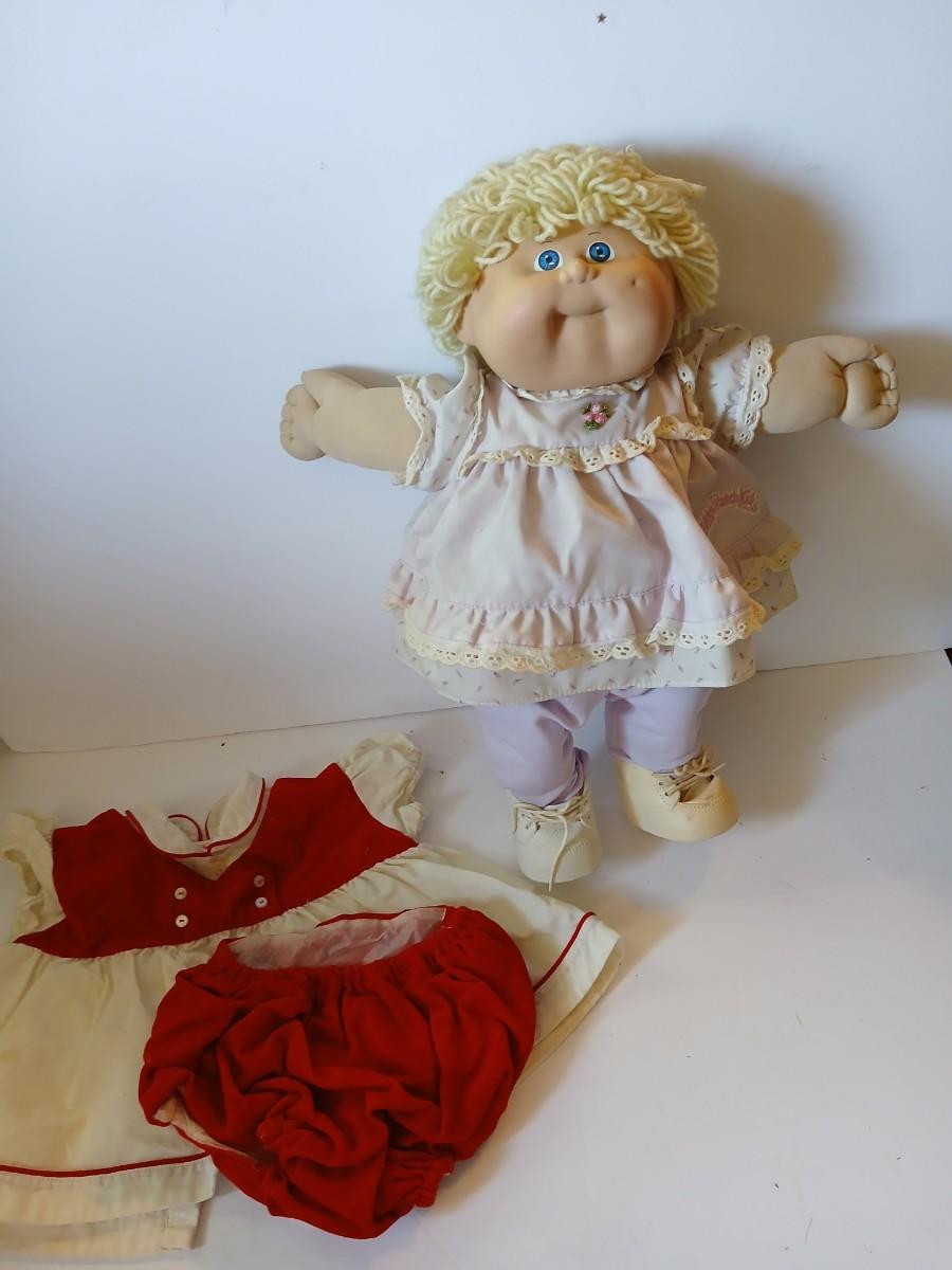 This adorable 1980s Cabbage Patch Kids™ girl doll by Coleco features soft blonde yarn hair, bright blue eyes, and rosy cheeks. She is signed in pink by Xavier Roberts on her bottom and includes both an outfit she's wearing (light pink floral dress) and a bonus red and white 2-piece vintage dress set with matching bloomers.