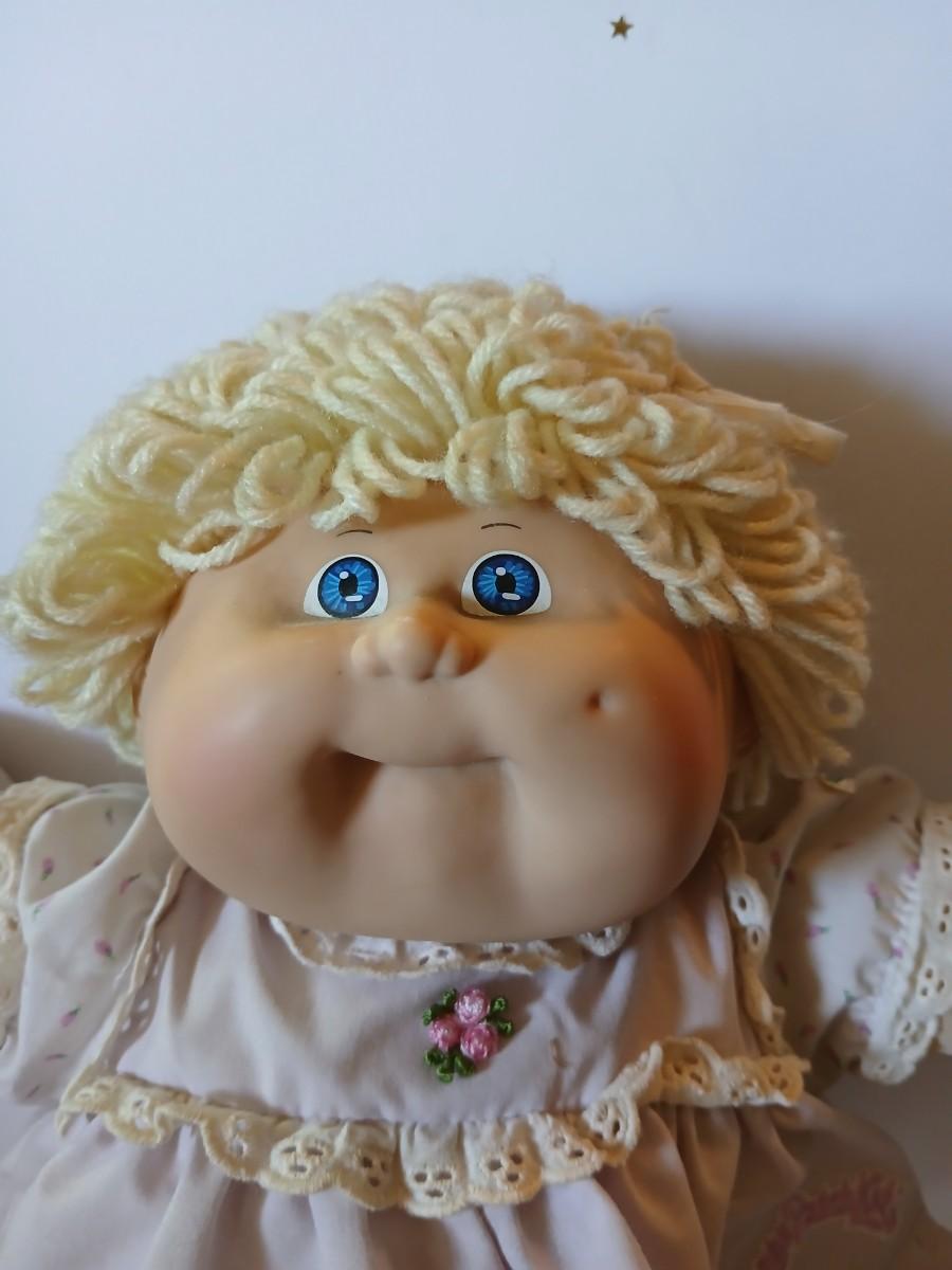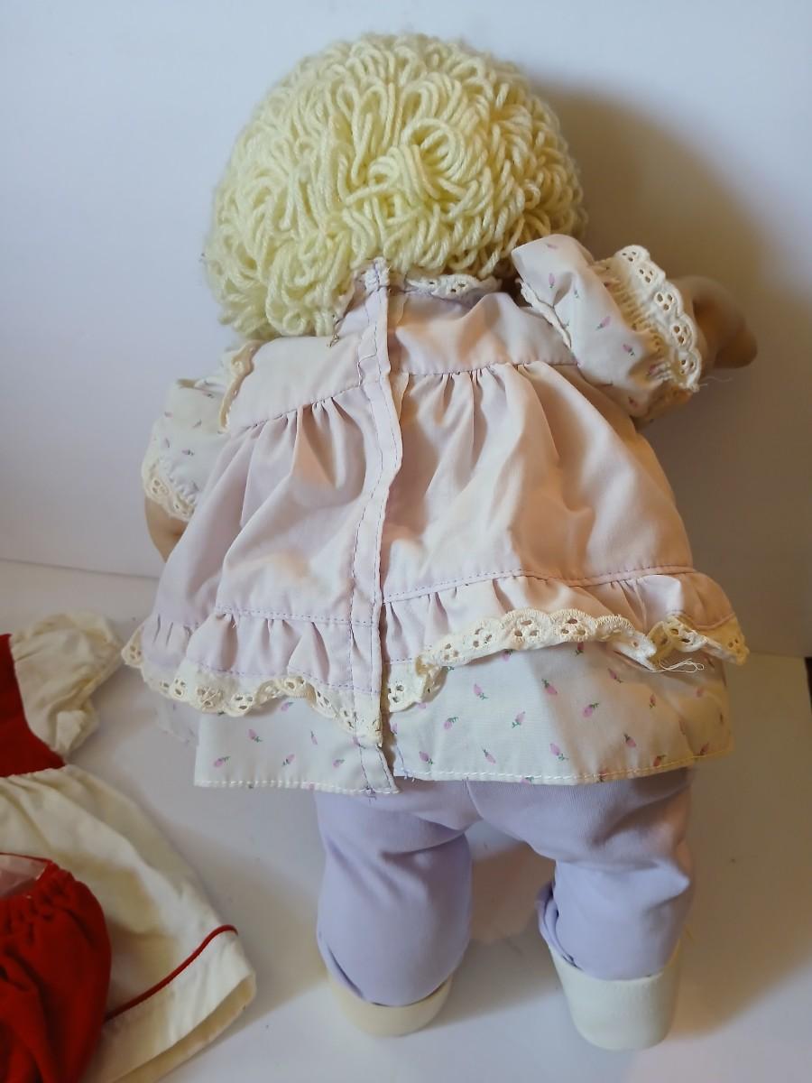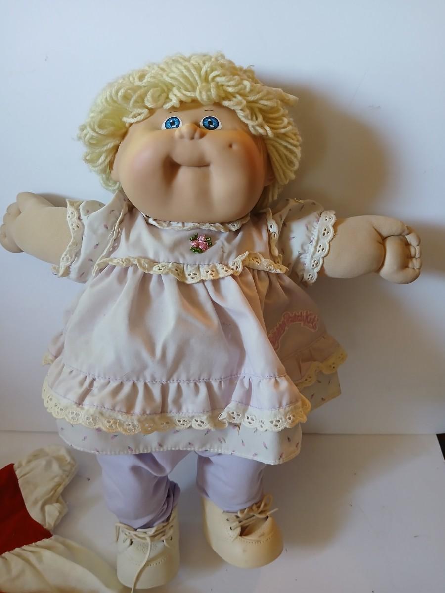 This adorable 1980s Cabbage Patch Kids™ girl doll by Coleco features soft blonde yarn hair, bright blue eyes, and rosy cheeks. She is signed in pink by Xavier Roberts on her bottom and includes both an outfit she's wearing (light pink floral dress) and a bonus red and white 2-piece vintage dress set with matching bloomers.