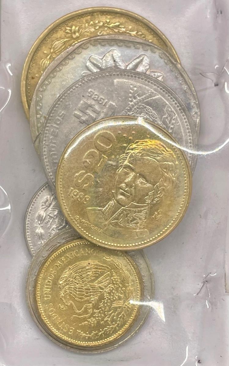 Includes 7 coins. Visible is a 1988 20 Peso coin.