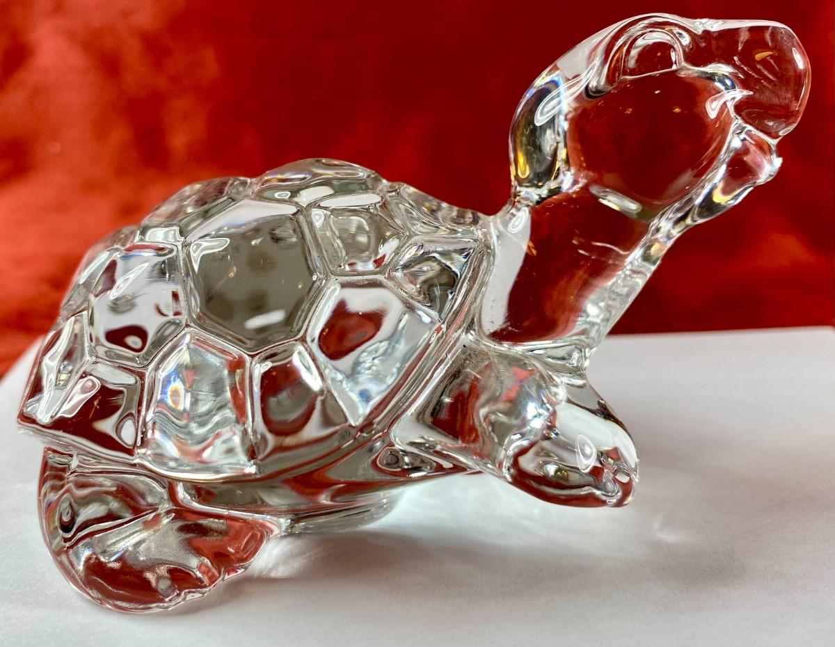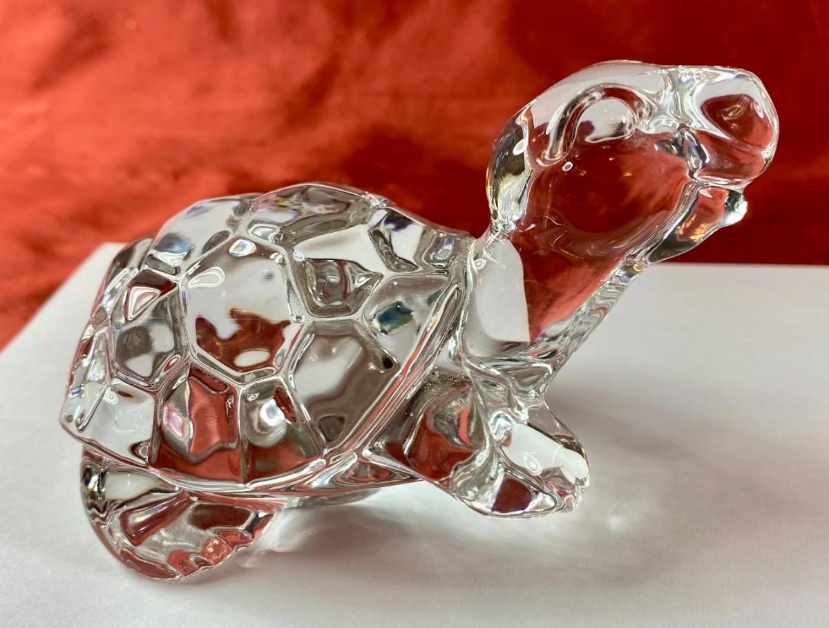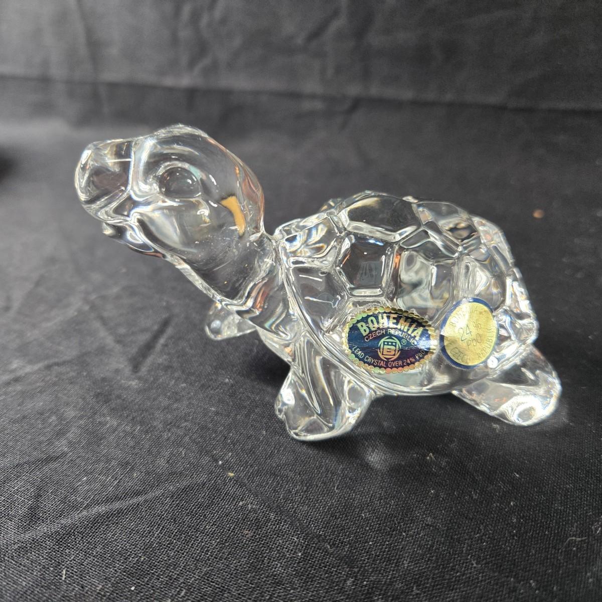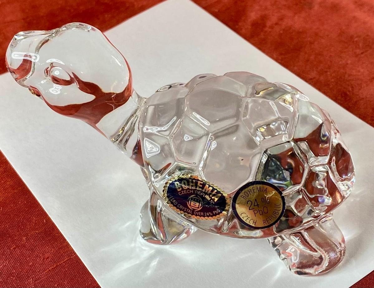 This auction lot is for a Bohemian Crystal Turtle. He is heavy - enough for a paper weight, but is also great as just an added object for a glass collection. He is about 4-inches long x 2.25 inches tall. Appears new with original stickers stating Bohemia Czech Republic and 24% Lead Crystal.