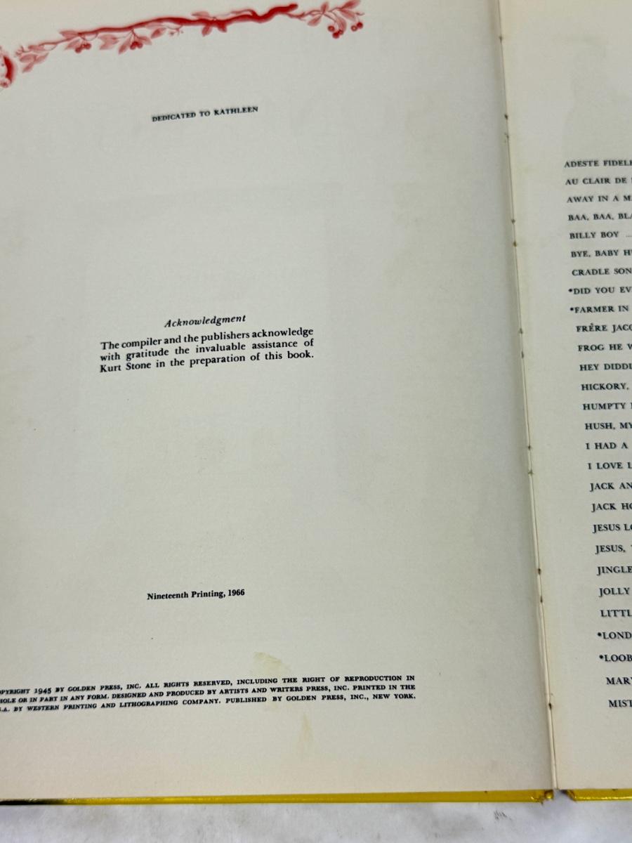 Some spine damage, see photos. Printed in 1966. Songs include classic favorites like "Hickory, Hickory Dock", "Row, Row, Row Your Boat", "Mary Had a Little Lamb", "Three Blind Mice" and more.