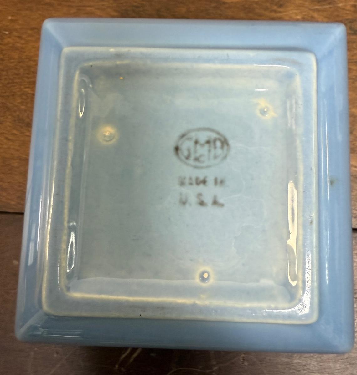 mark "GMB" indicates it was made by Gladding, McBean & Co., who produced Catalina Pottery on Catalina Island, California. The "MADE IN U.S.A." stamp further confirms its origin. The piece is likely from the 1920s-1930s when the pottery was popular. It has some chips shown in photos. We did not try to remove green spongy material.