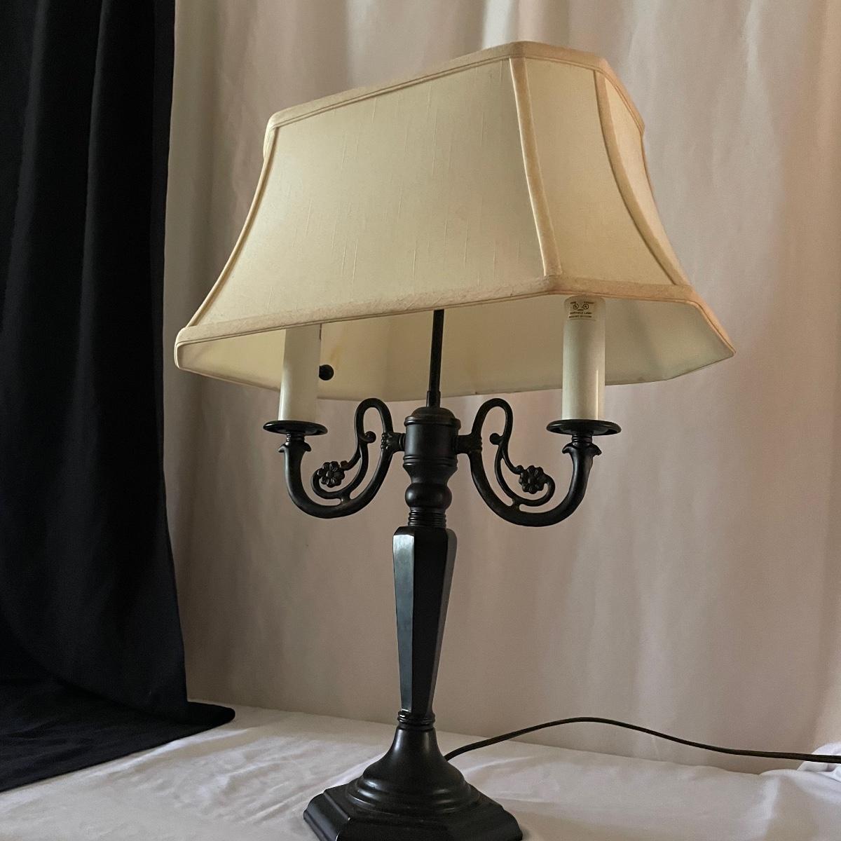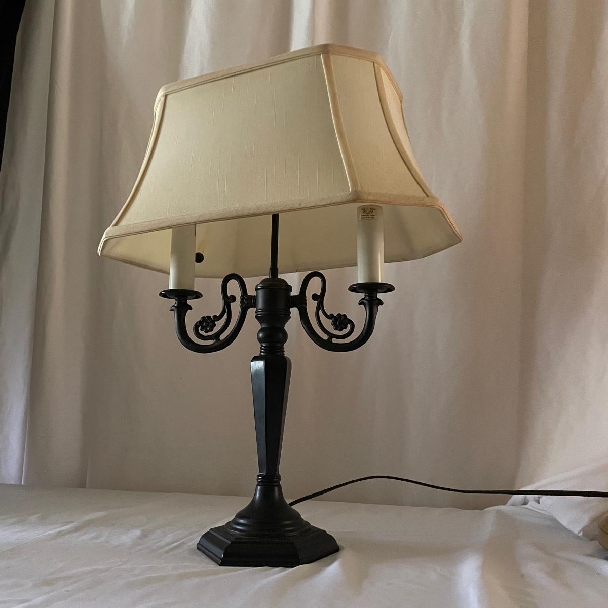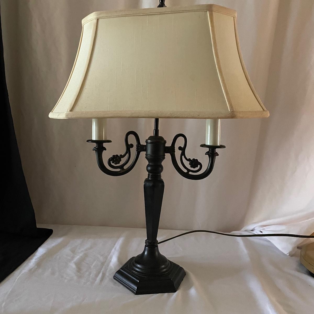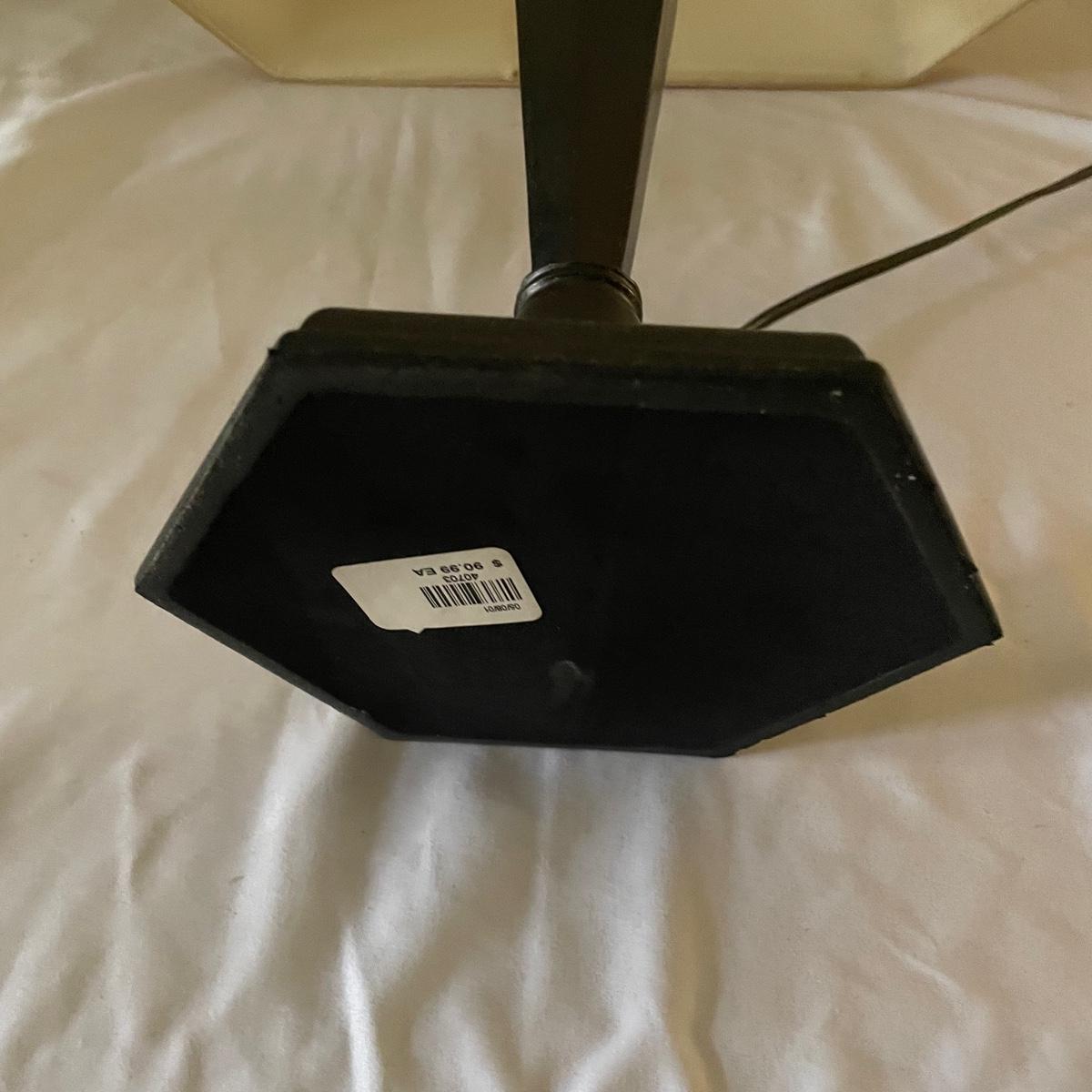 This handsome lamp has a metal dark bronze colored base with dual bulbs. The ivory shade is included.