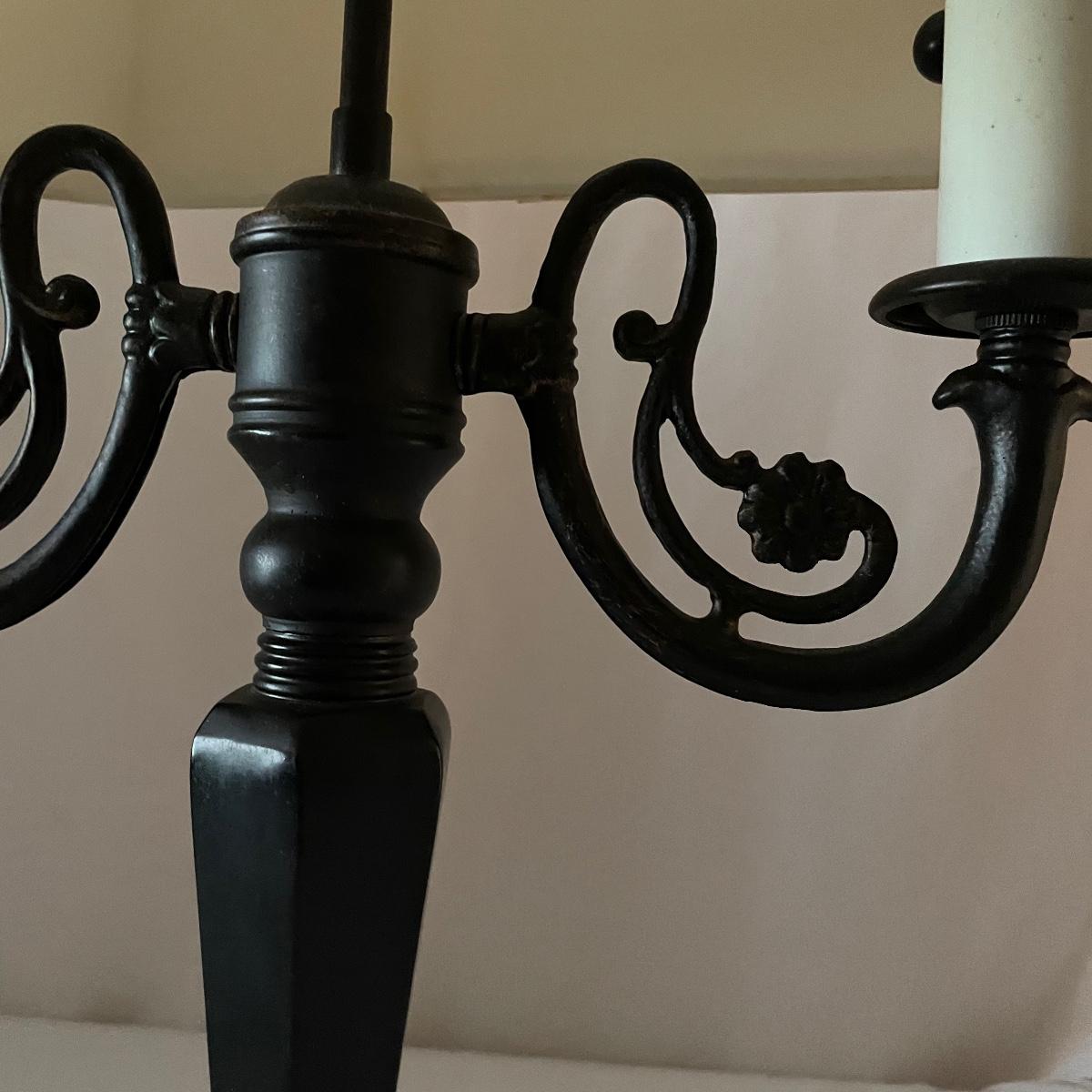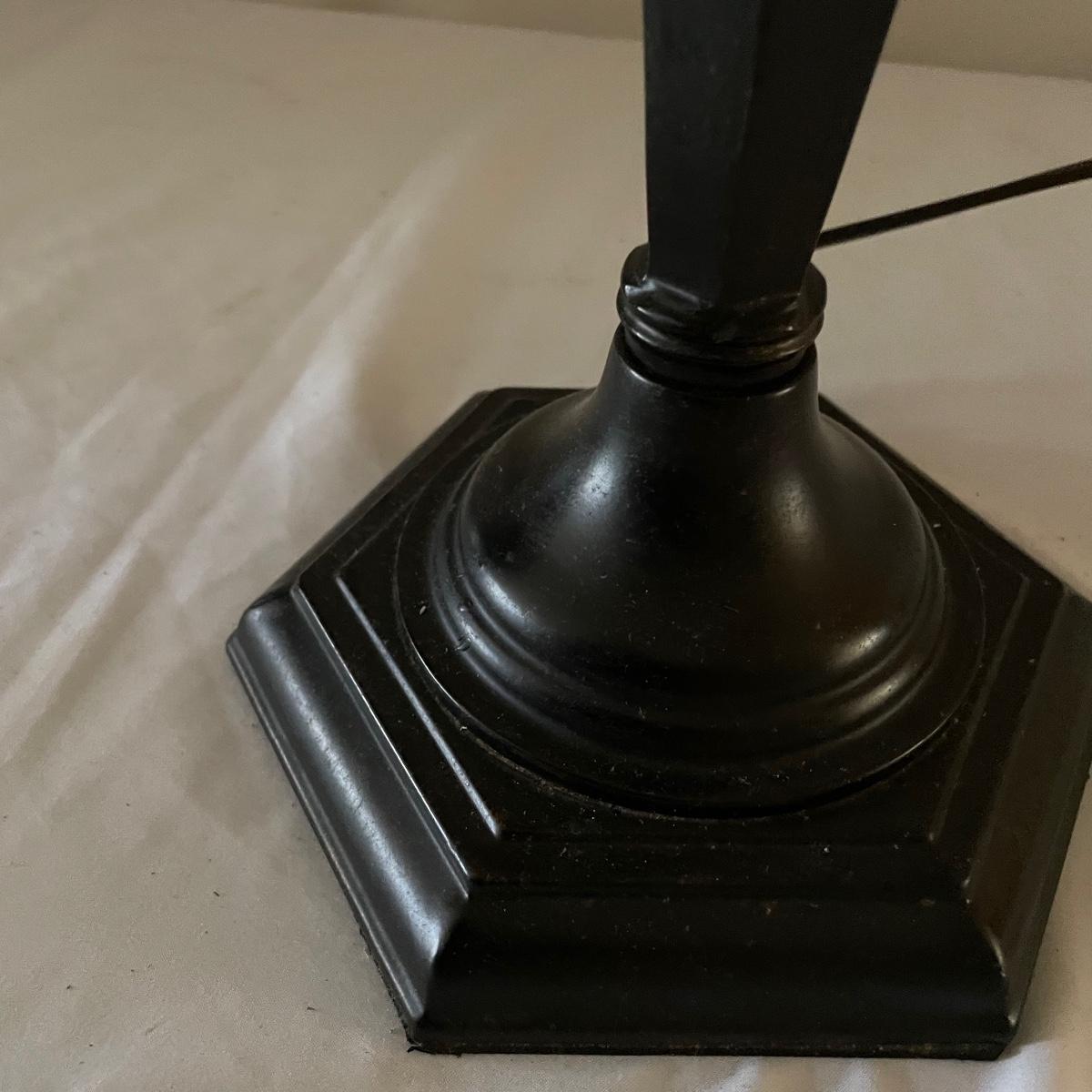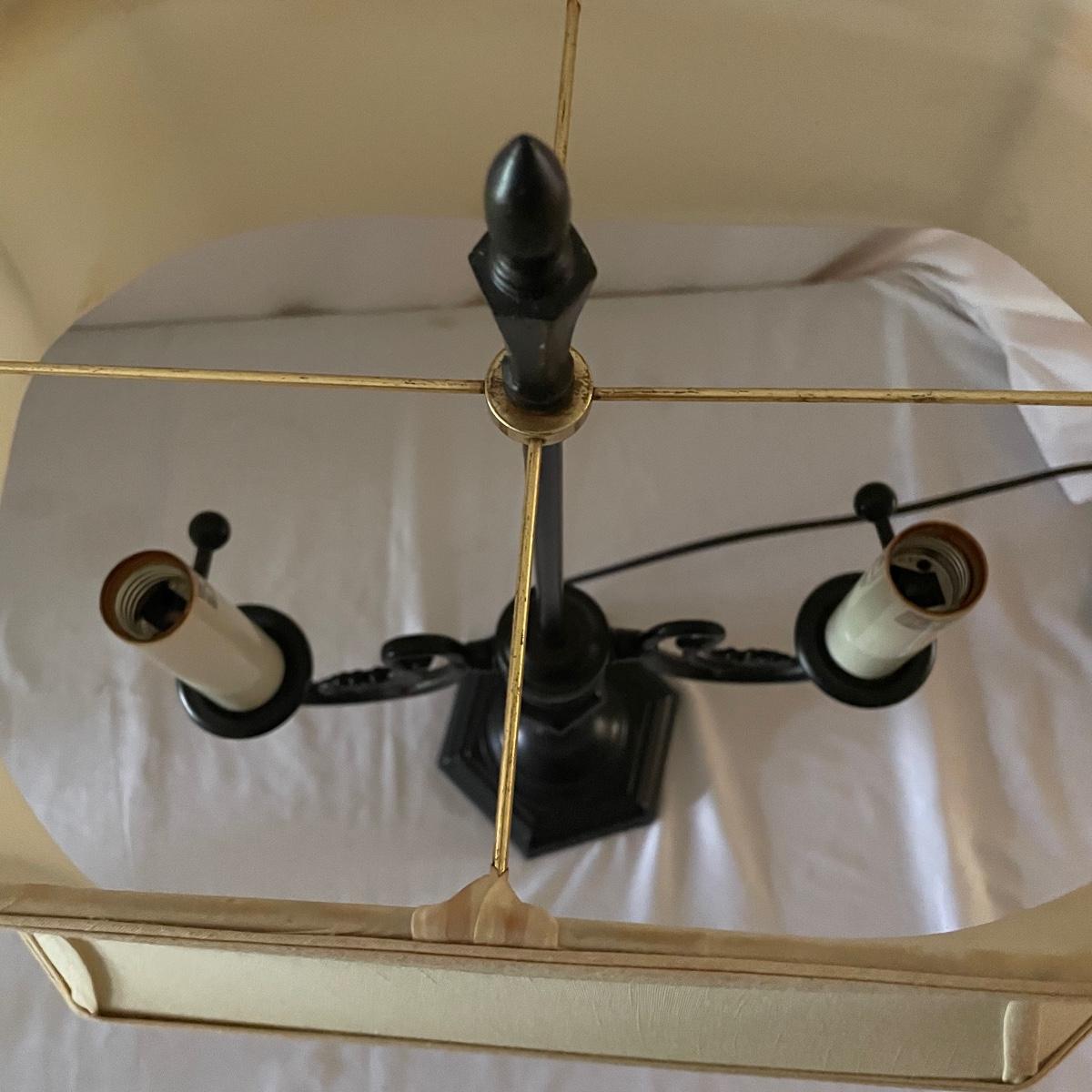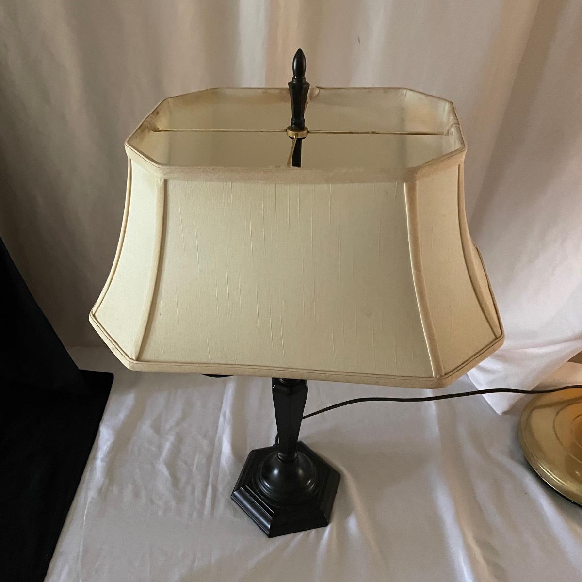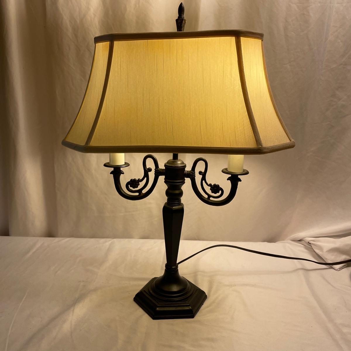 This handsome lamp has a metal dark bronze colored base with dual bulbs. The ivory shade is included.