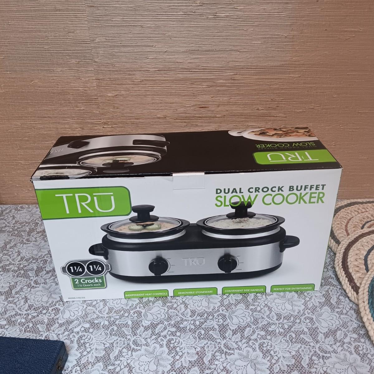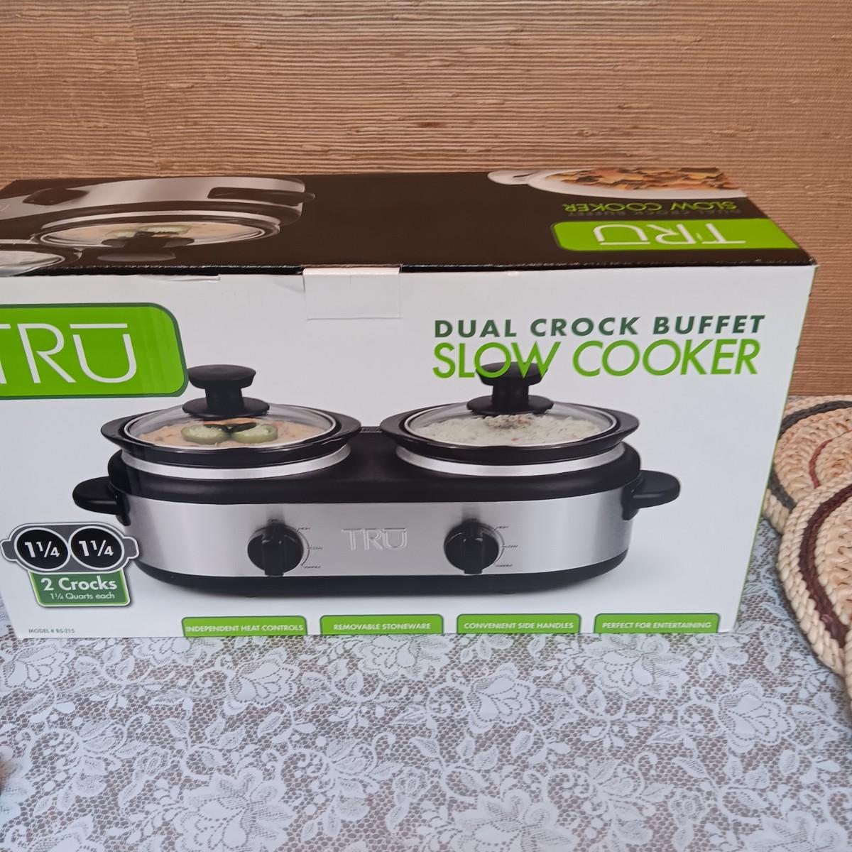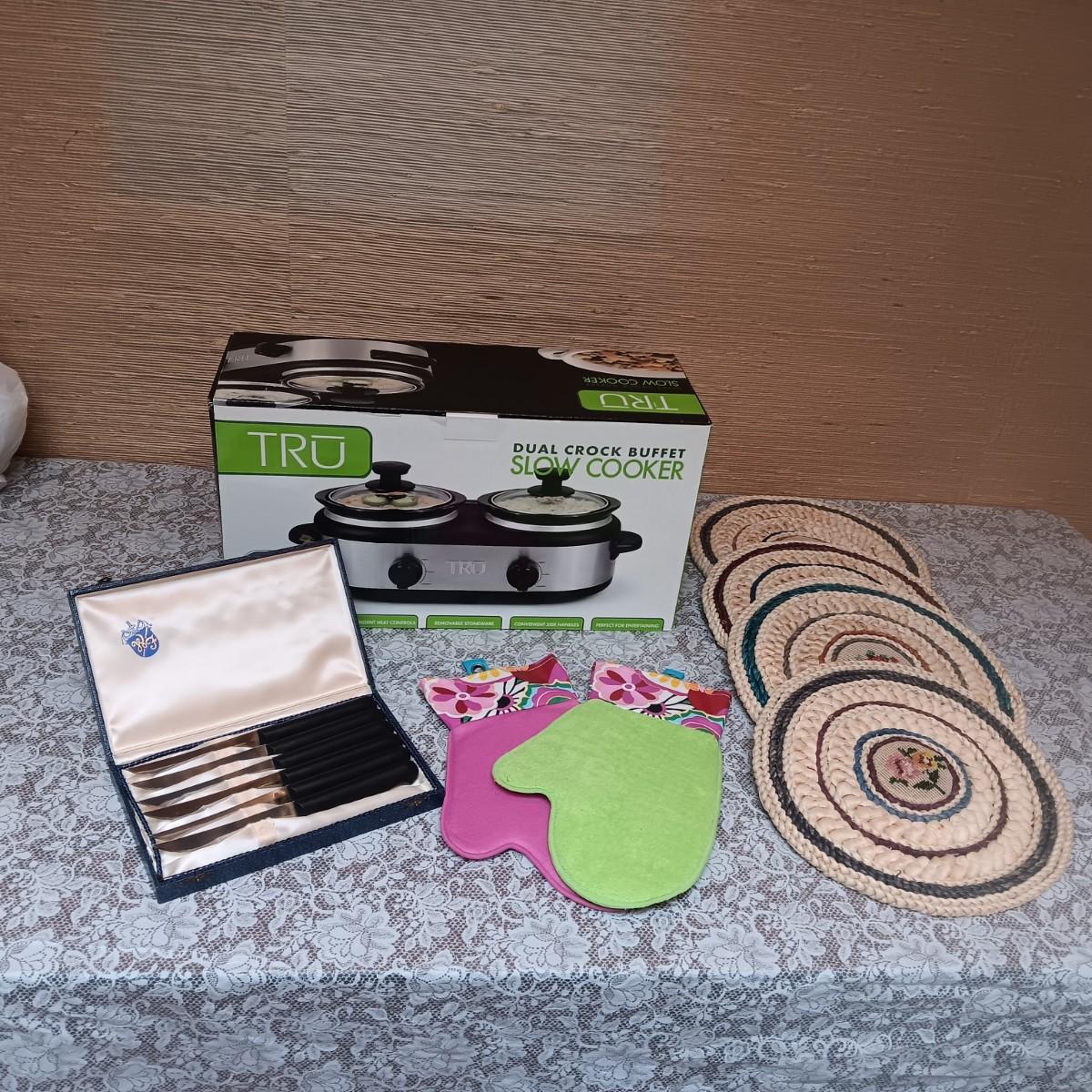 DUAL CROCK BUFFET SLOW COOKER, STEAK KNIVES, OVEN MITS AND HOT PADS