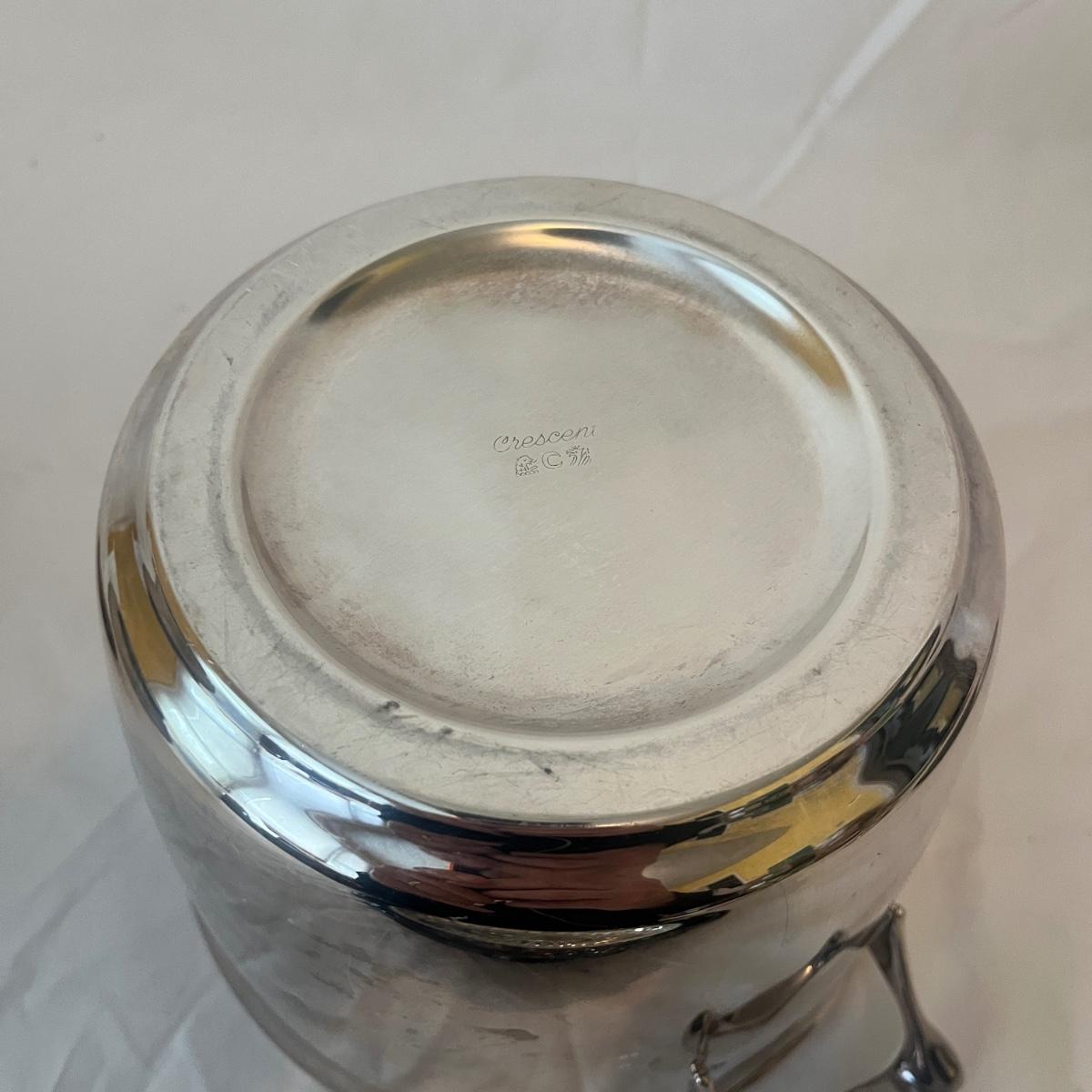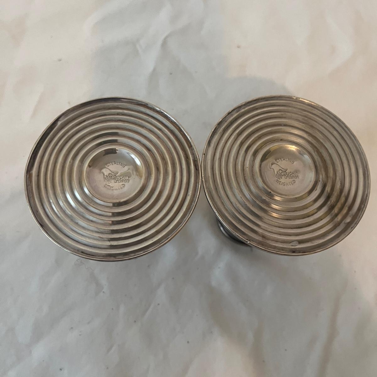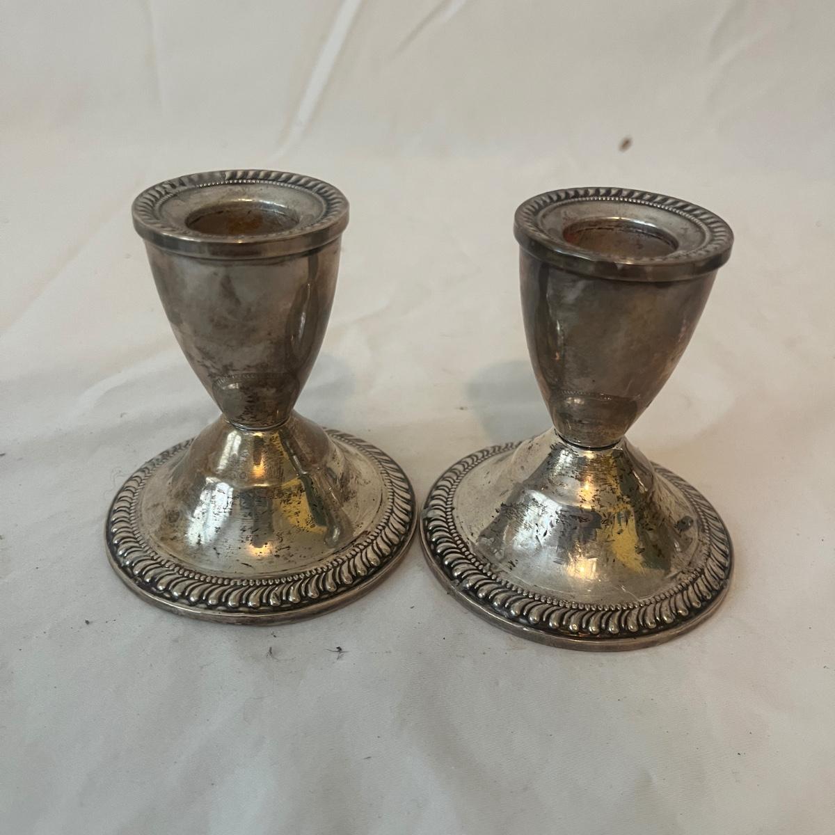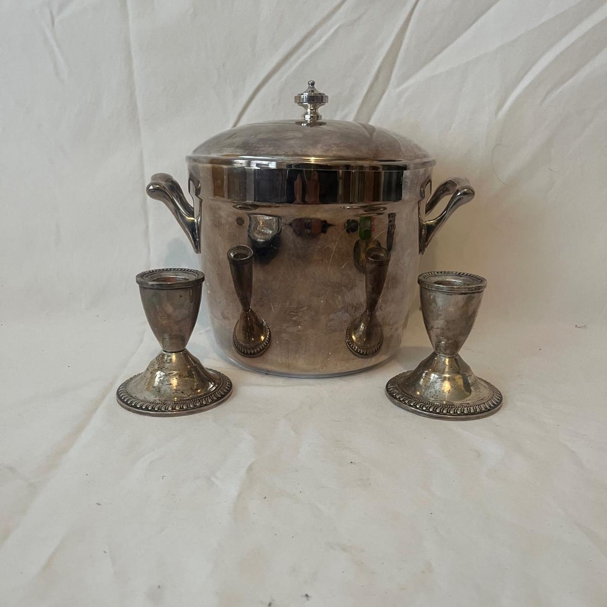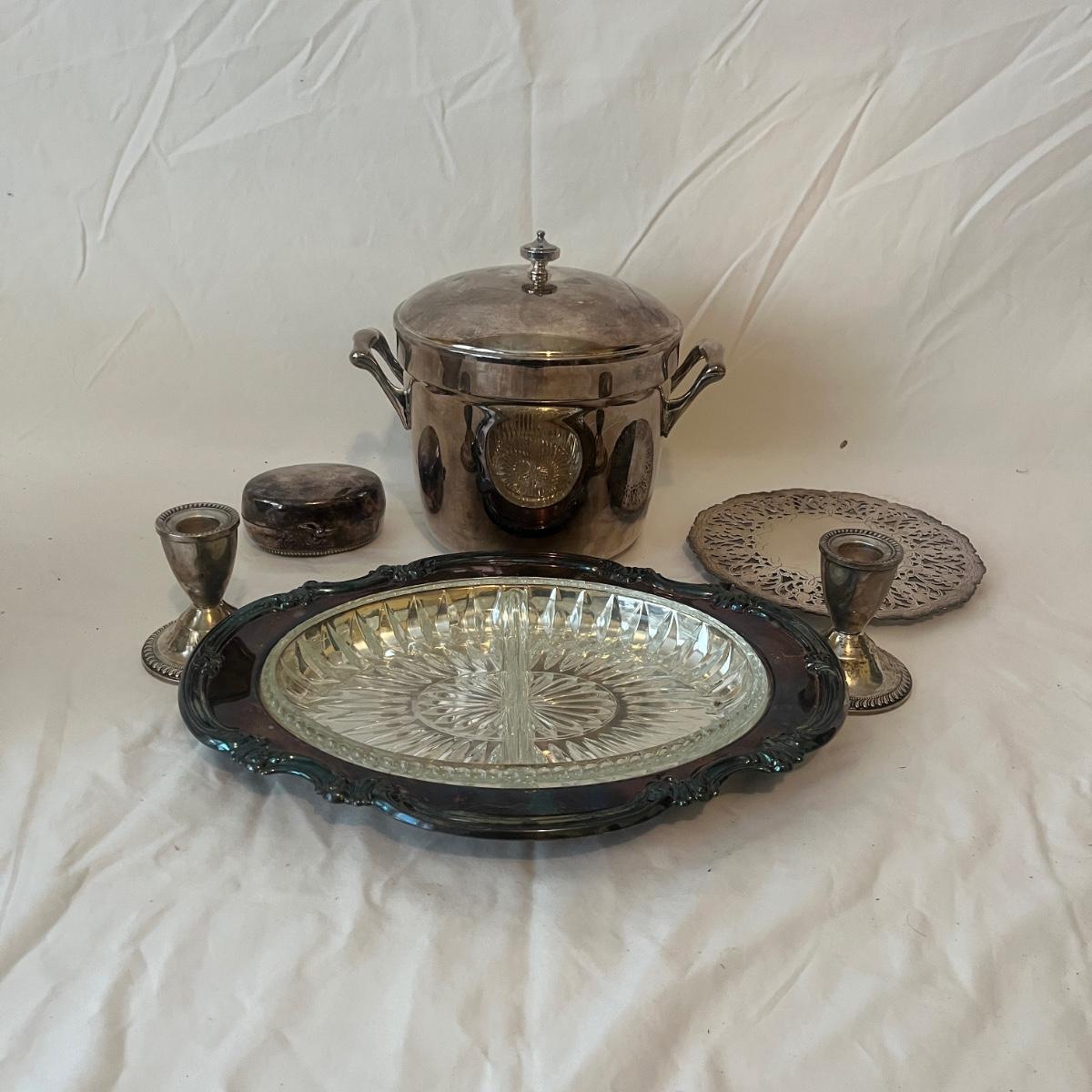 Lot includes a pair of Duchin candleholders marked weighted sterling, lined silverplate ice bucket by Crescent, Gorham silverplate tray with glass insert, two silverplate trivets and a small silverplate box. Ice bucket measures 7”D x 8”H.