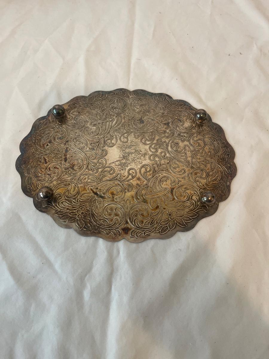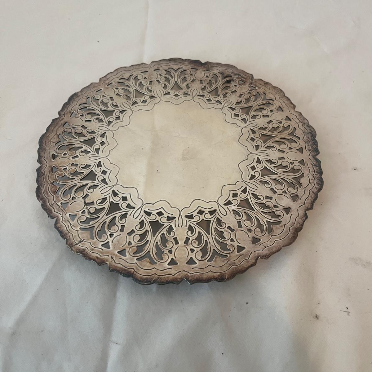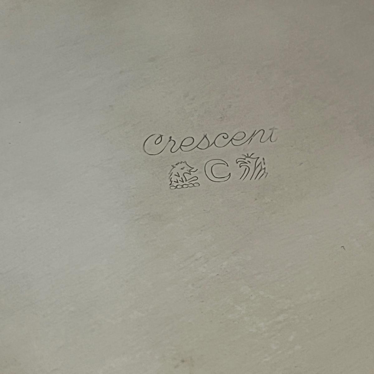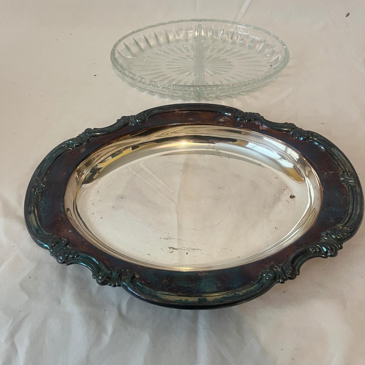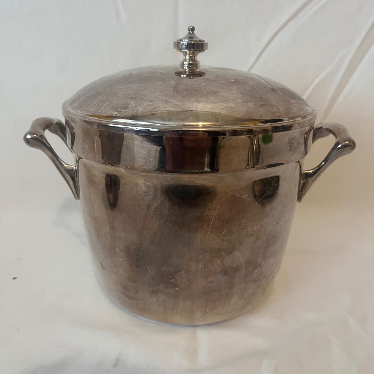Lot includes a pair of Duchin candleholders marked weighted sterling, lined silverplate ice bucket by Crescent, Gorham silverplate tray with glass insert, two silverplate trivets and a small silverplate box. Ice bucket measures 7”D x 8”H.