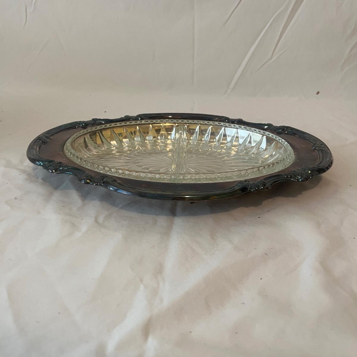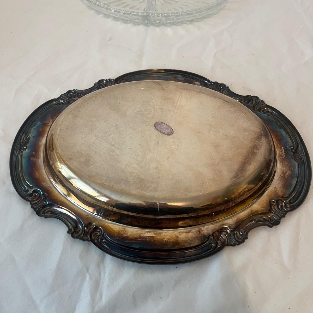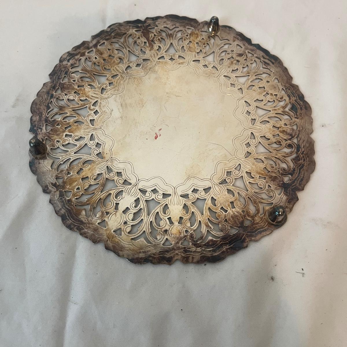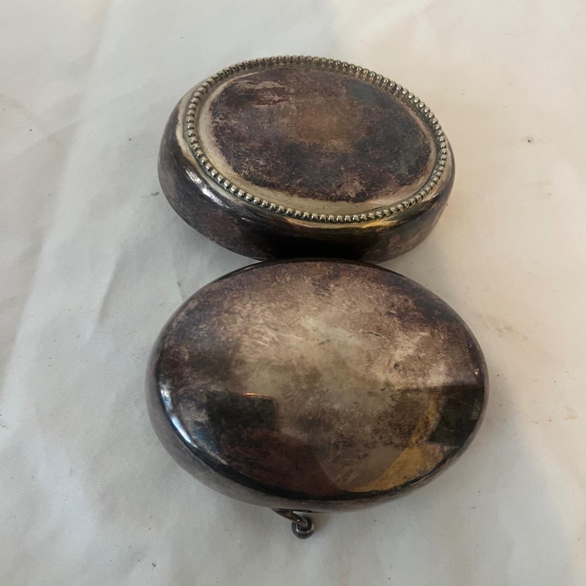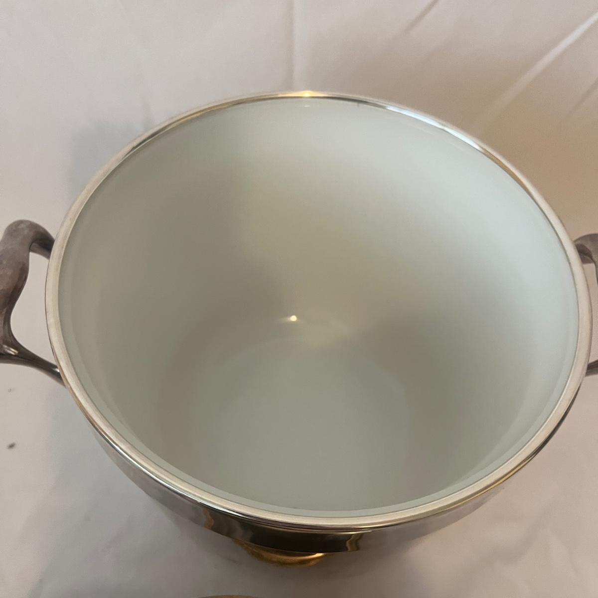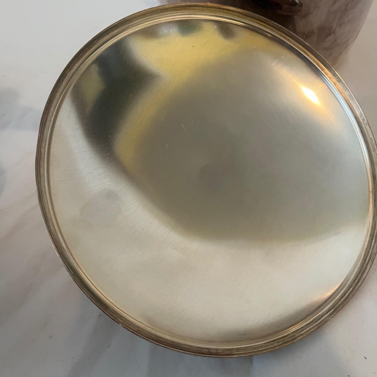 Lot includes a pair of Duchin candleholders marked weighted sterling, lined silverplate ice bucket by Crescent, Gorham silverplate tray with glass insert, two silverplate trivets and a small silverplate box. Ice bucket measures 7”D x 8”H.