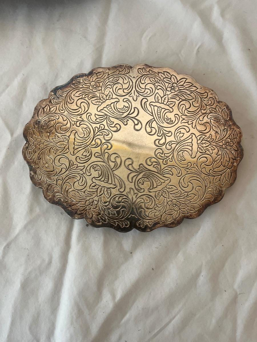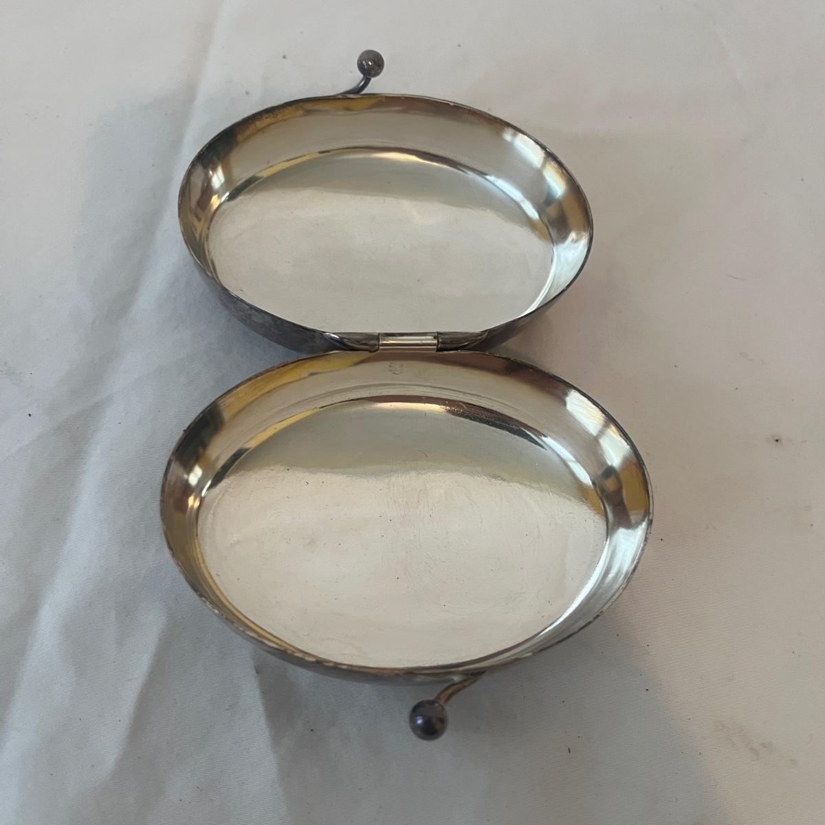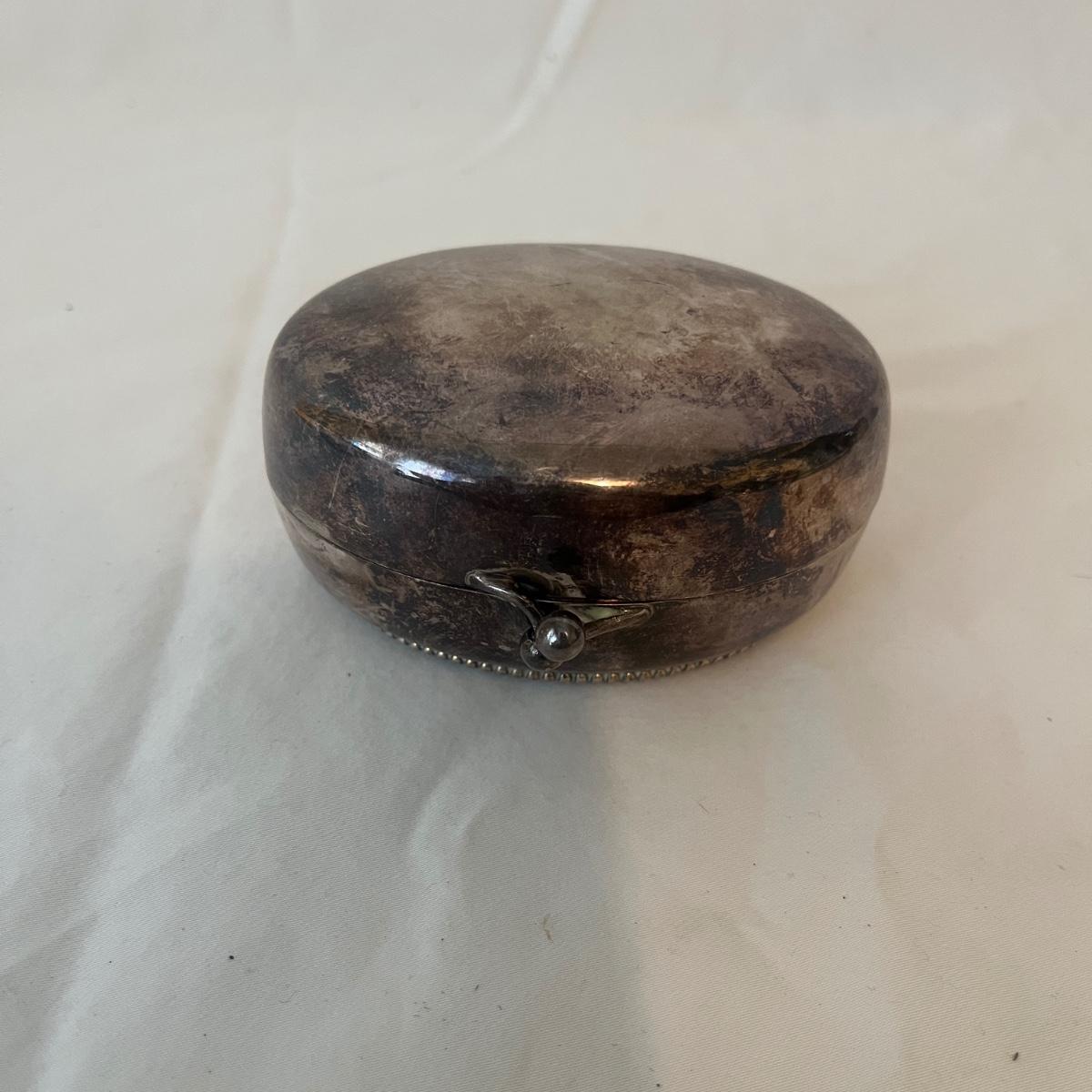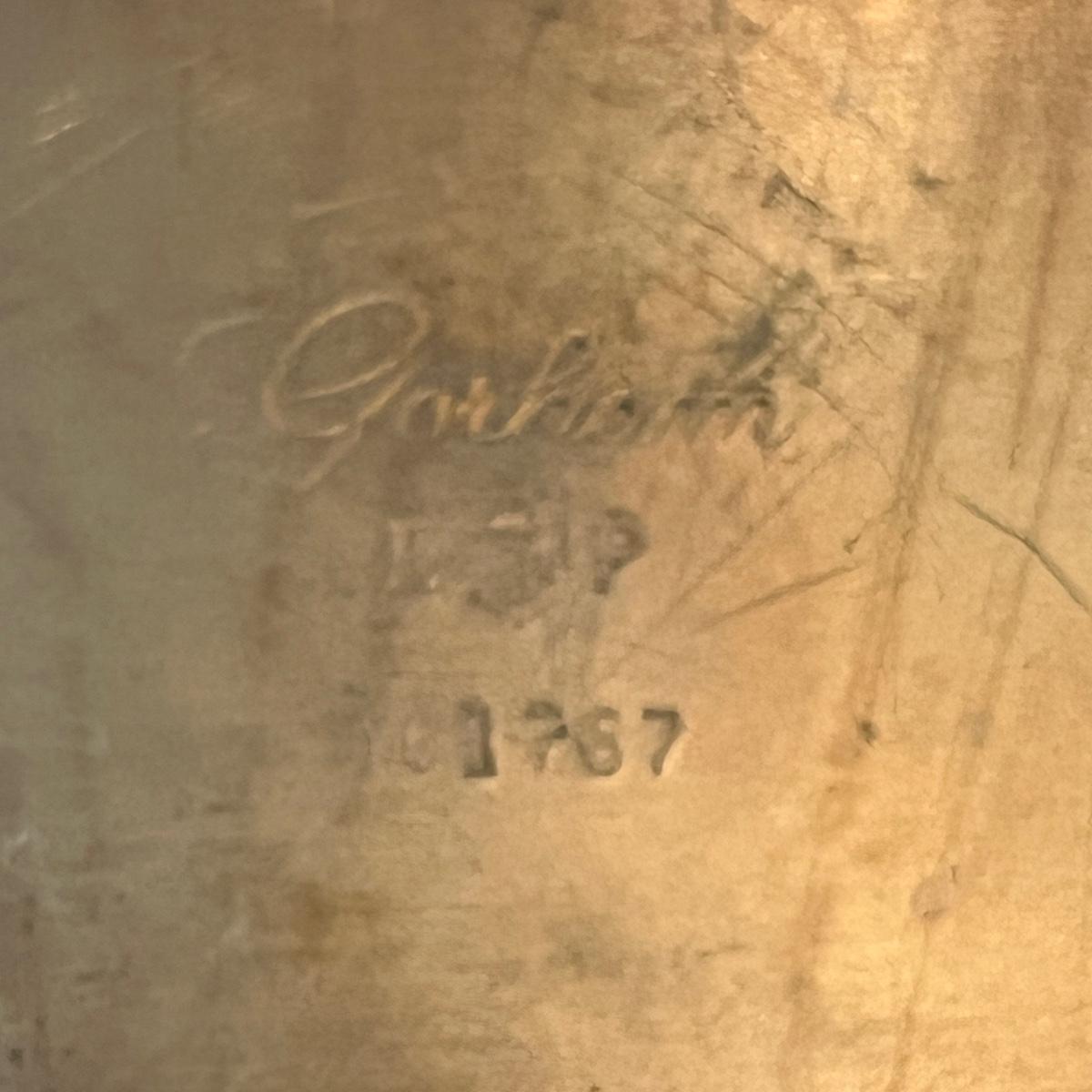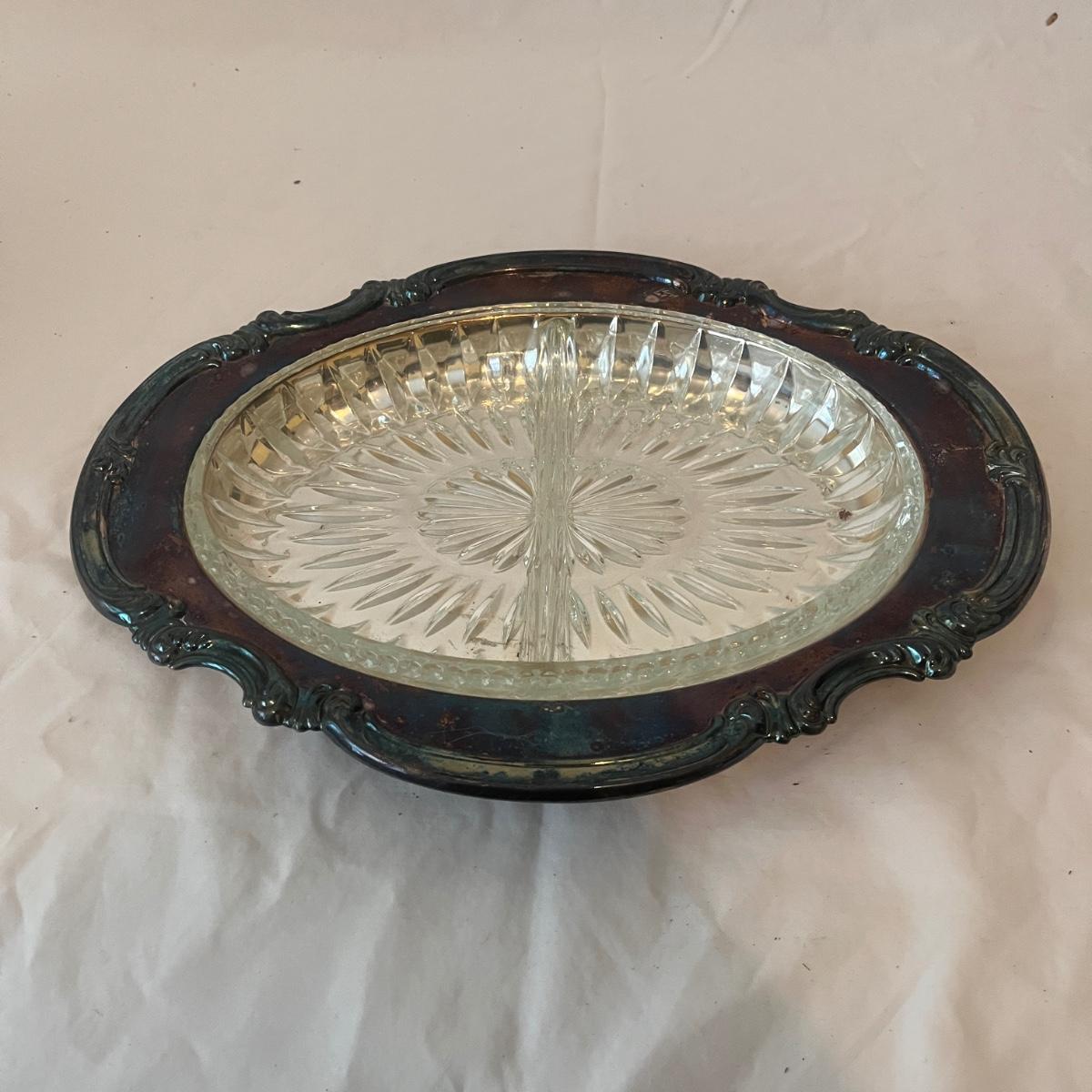 Lot includes a pair of Duchin candleholders marked weighted sterling, lined silverplate ice bucket by Crescent, Gorham silverplate tray with glass insert, two silverplate trivets and a small silverplate box. Ice bucket measures 7”D x 8”H.
