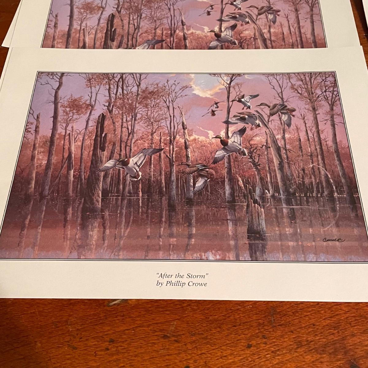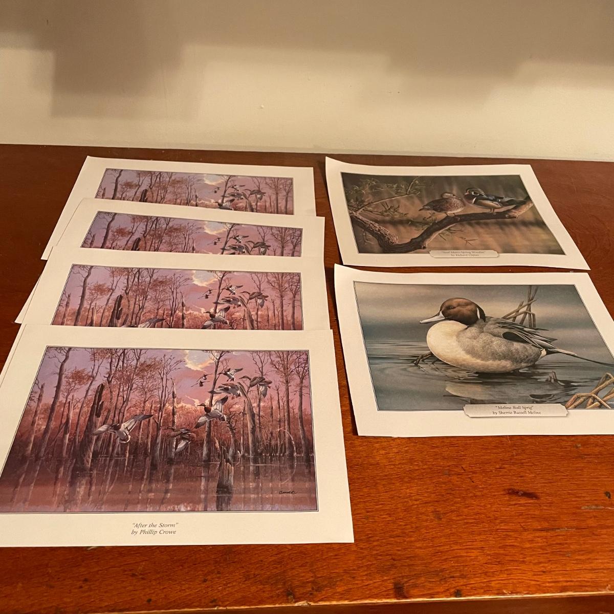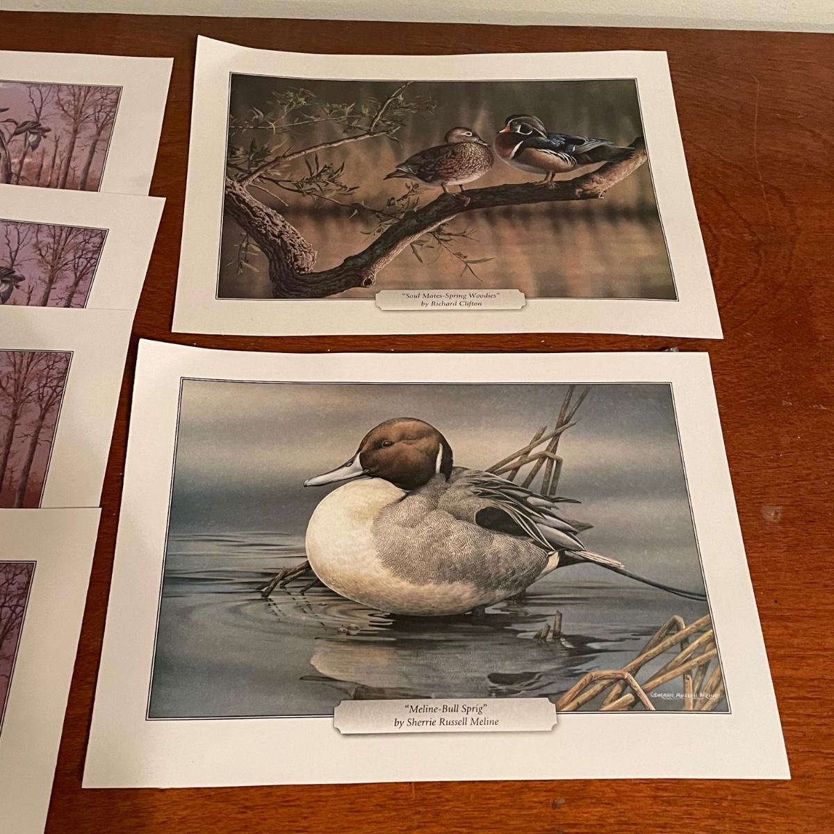 Six art prints of ducks (four are duplicates) by Phillip Crowe, Sherrie Russel Meline and Richard Clifton.