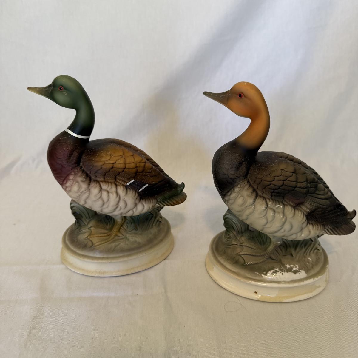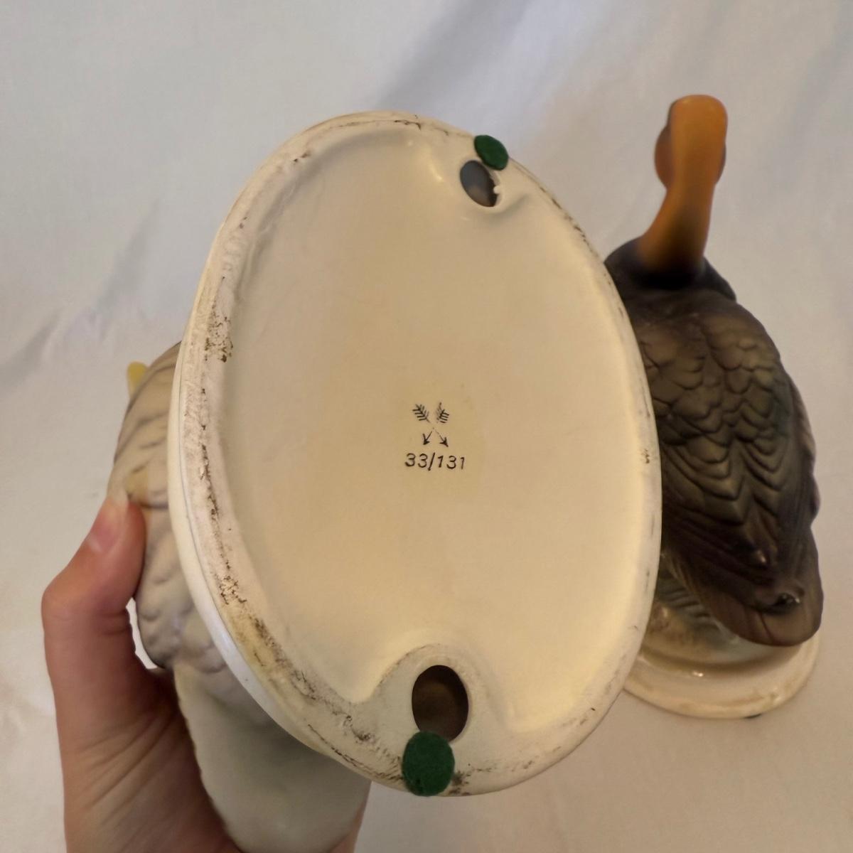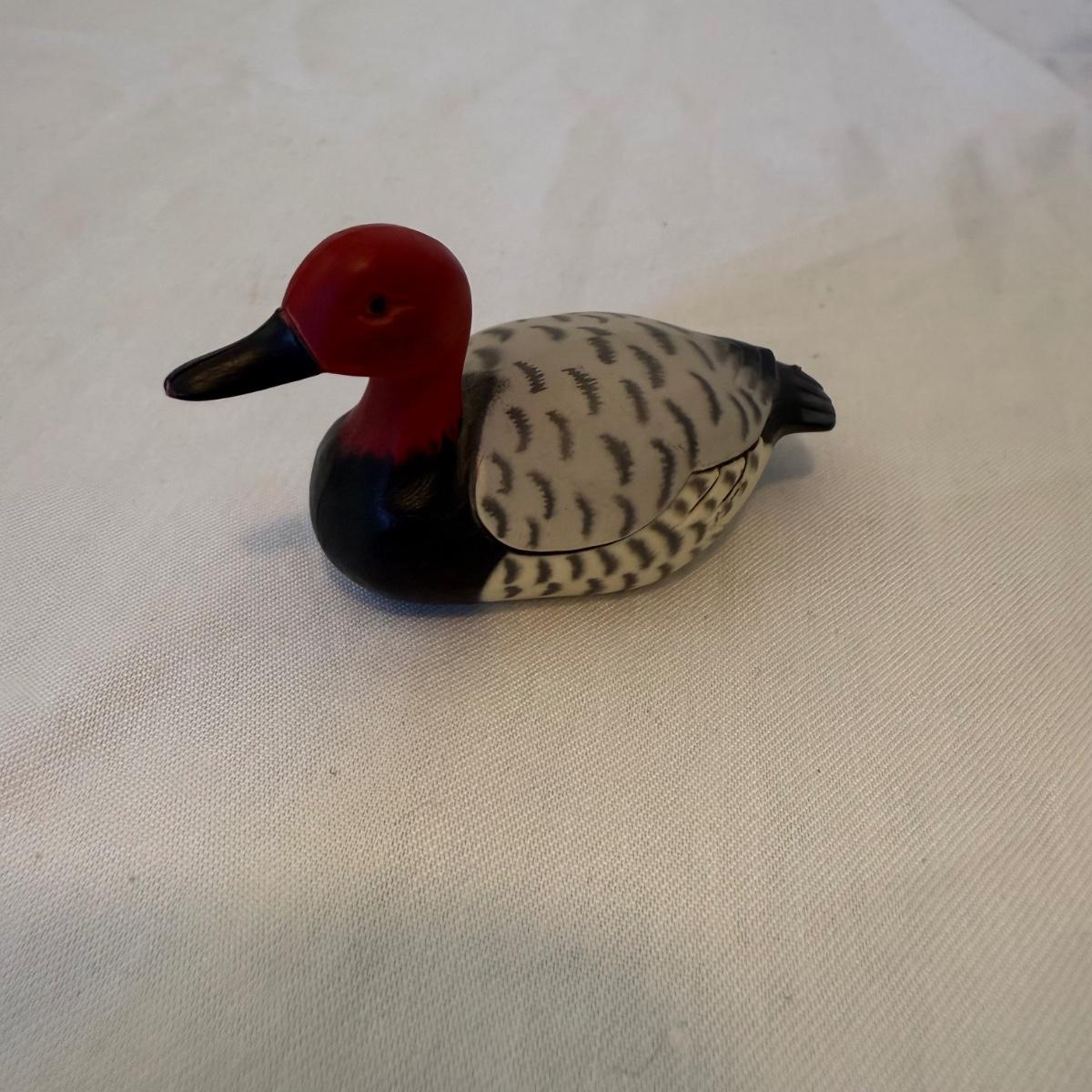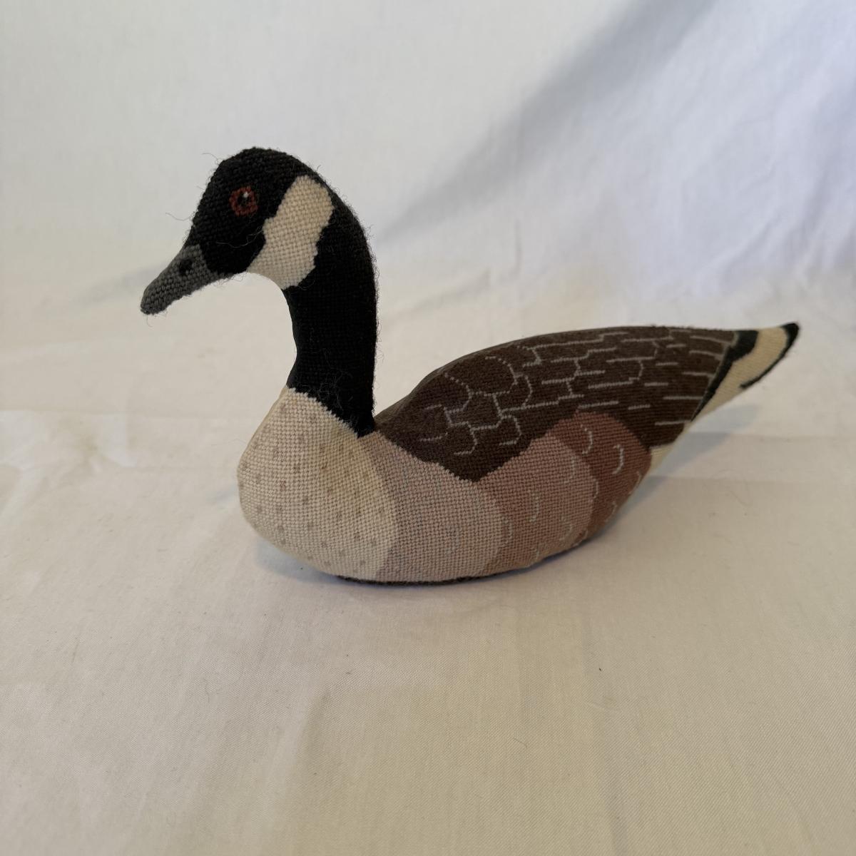 This lot contains six different duck or geese figurines! The first two patch and are ceramic ducks, one a mallard and with a yellow head. The yellow head mallard has some chipping in the glaze at the base, see pictures for details. They both measure 5.5” x 4.5” x 8.5”H and both numbered 33/131 on the bottom. Next is a precious but plain carved wooden duck. Next is a hand painted wooden mallard, see pictures for signature. Moving on we have a canadian goose whose half need-point and half painted fabric. This guys pretty heavy, he’s stuffed with something. And last a teeny resin duck figurine with a red head. This piece measures 3” x 1.5” x 1.5”H. Shipping available.