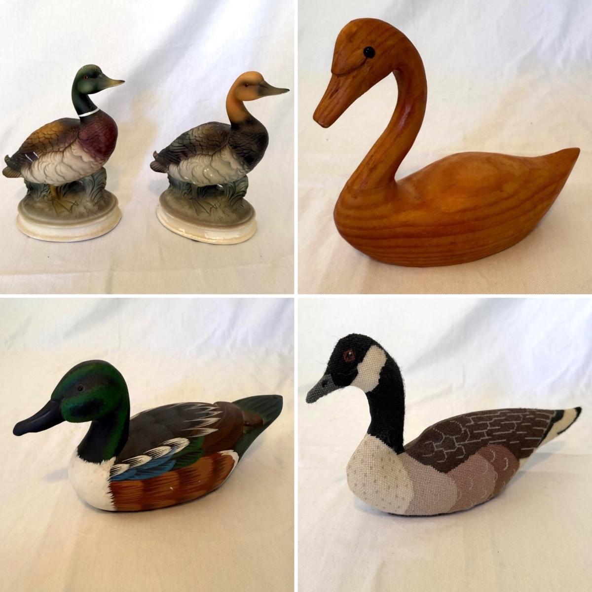 This lot contains six different duck or geese figurines! The first two match and are ceramic ducks, one a mallard and with a yellow head. The yellow head mallard has some chipping in the glaze at the base, see pictures for details. They both measure 5.5” x 4.5” x 8.5”H and both numbered 33/131 on the bottom. Next is a precious but plain carved wooden duck made by the seller. Next is a hand painted wooden mallard, see pictures for signature. Moving on we have a Canadian goose whose half needle-point and half painted fabric. This guy is pretty heavy, he’s stuffed with something. And last a teeny resin duck figurine with a red head. This piece measures 3” x 1.5” x 1.5”H. Shipping available.