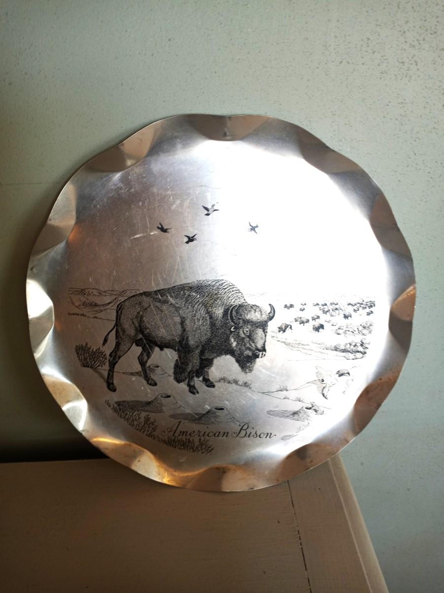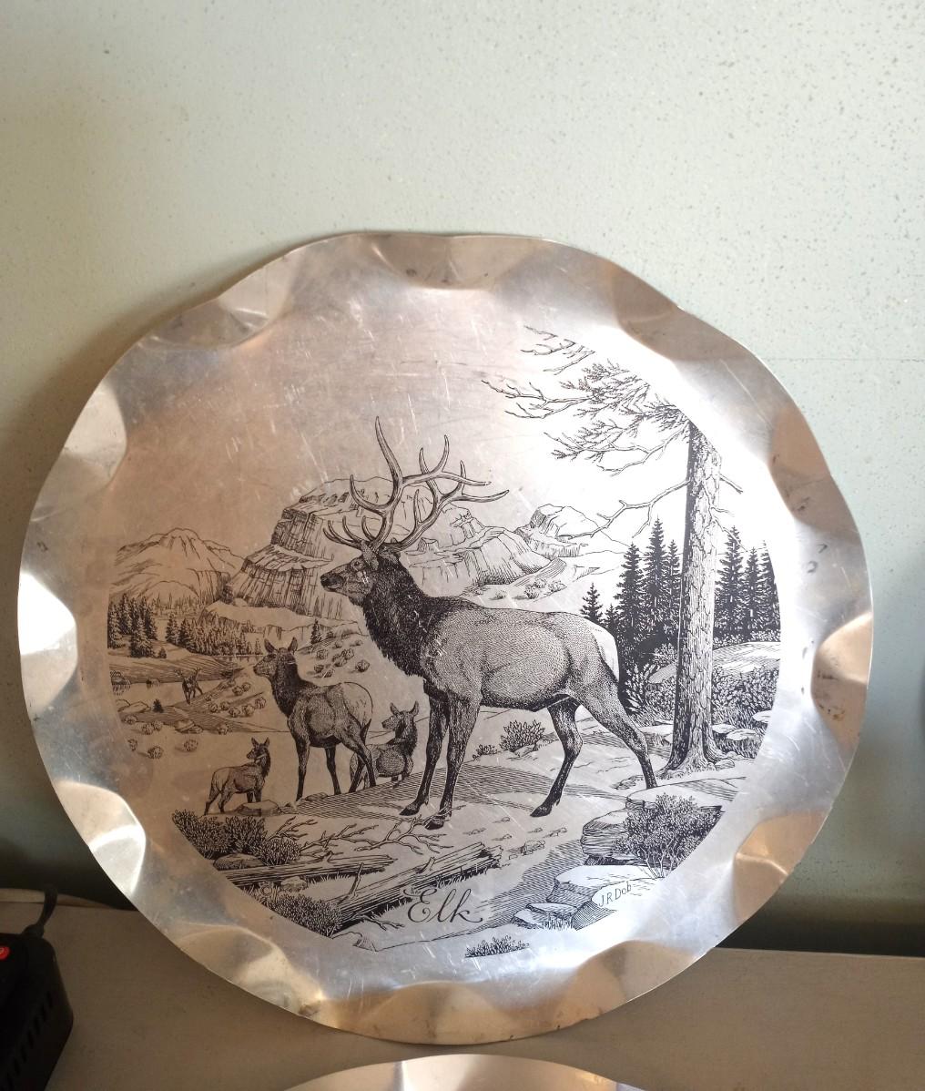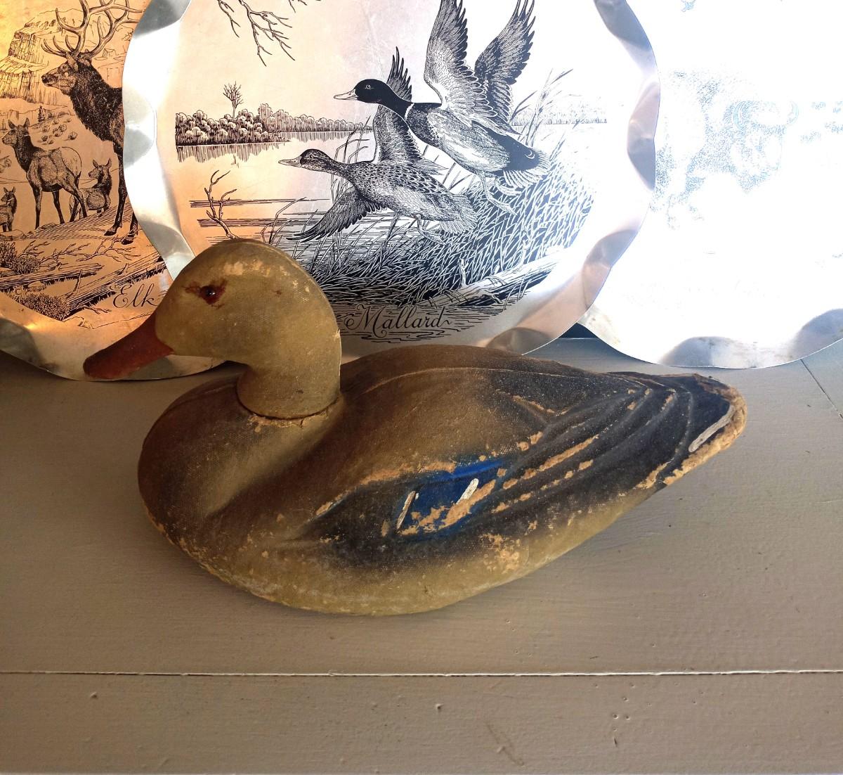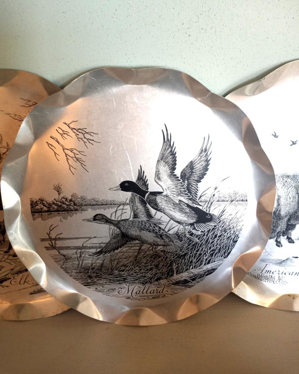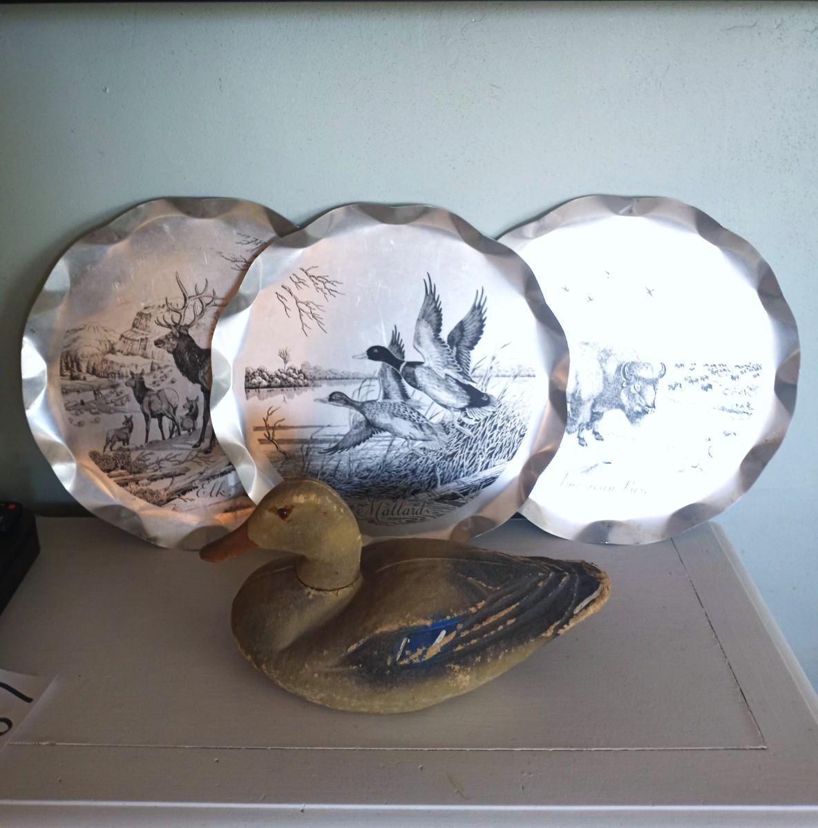 DUCK DECOY 13" LONG AND THREE WILDLIFE TIN PLATTERS 15" ROUND