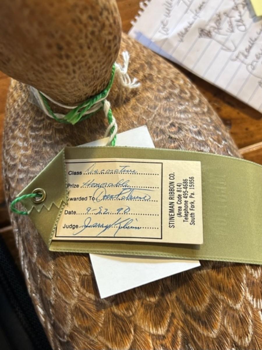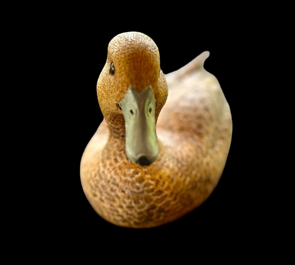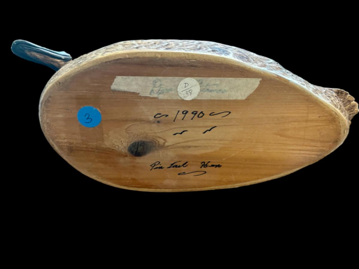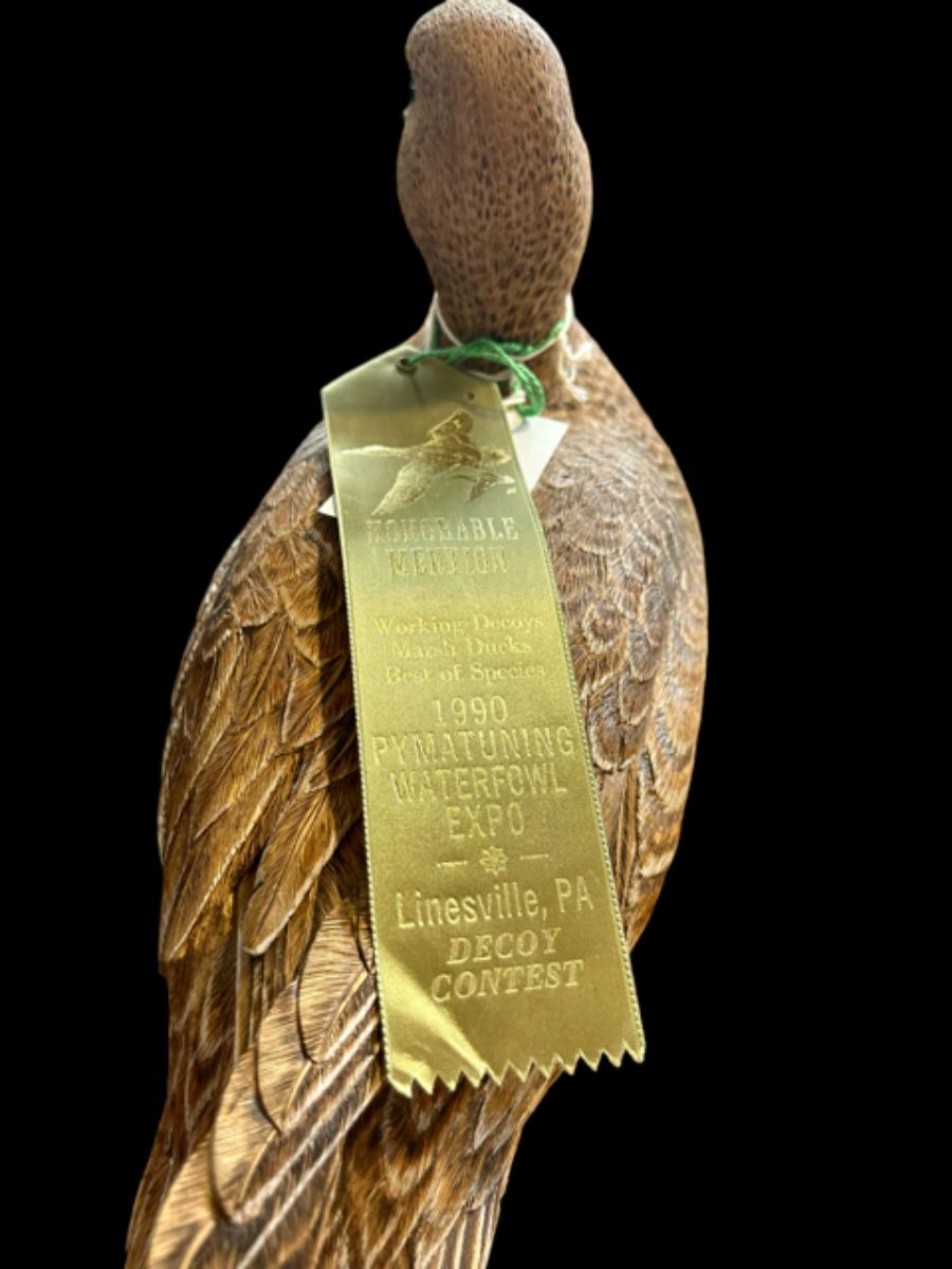 Beautifully hand carved wooden decorative pin tail hen decoy by Dom Petruso, 1990. Received Honorable Mention at 1990 Pymatuning Waterfowl Expo in Linesville, PA.