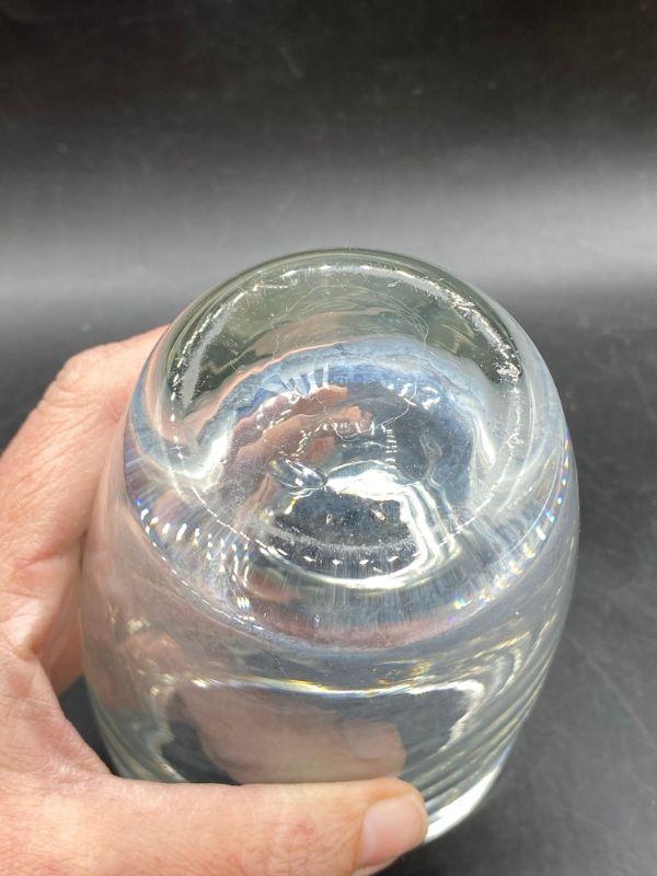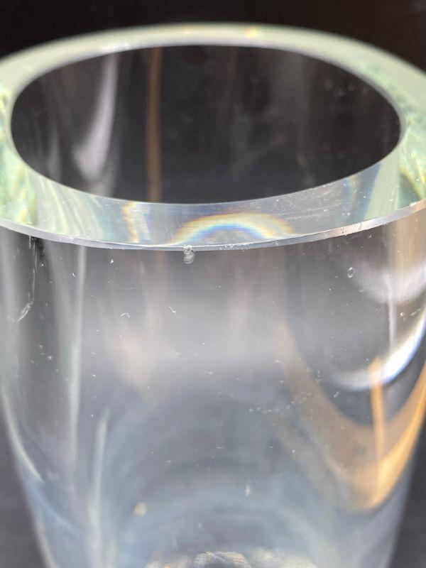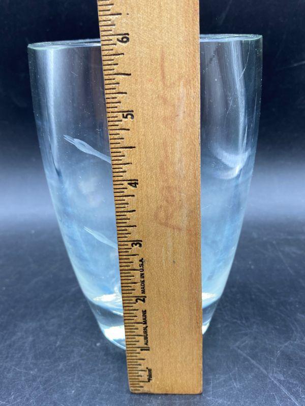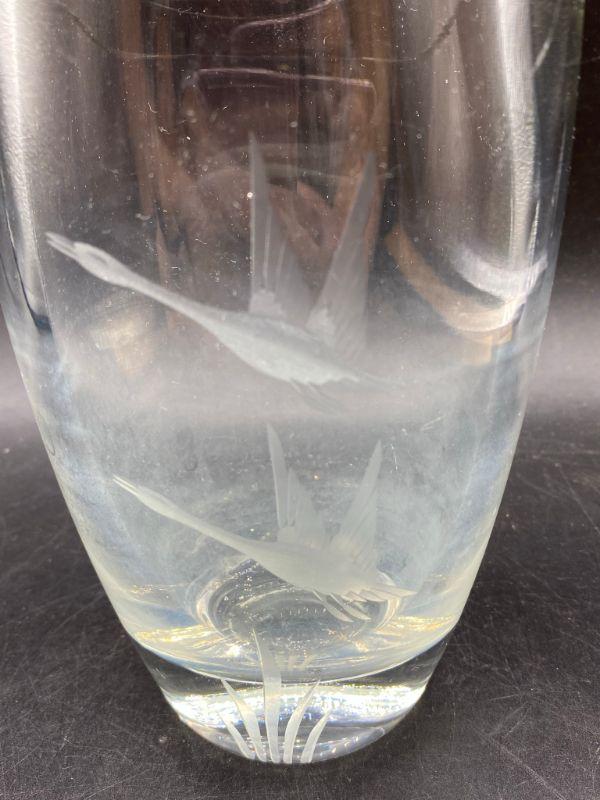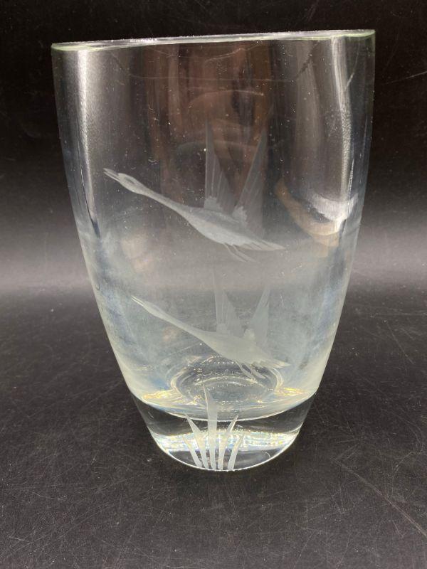 Duck etched crystal vase. Thick heavy glass. There is some fogging from use. Stands 6". I did find the smallest chip in the rim.