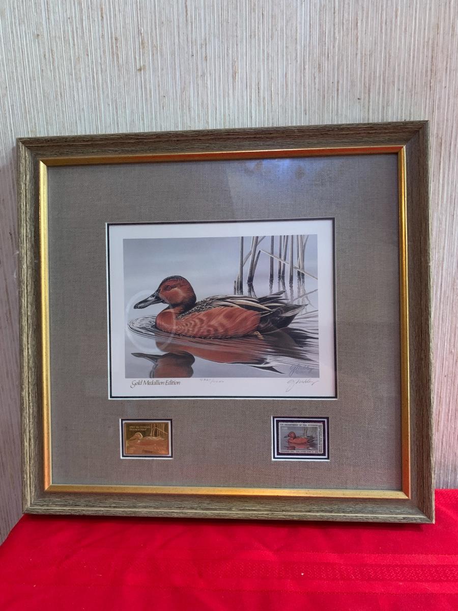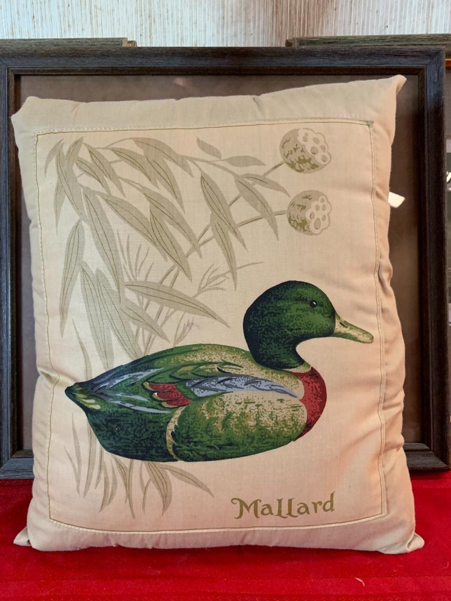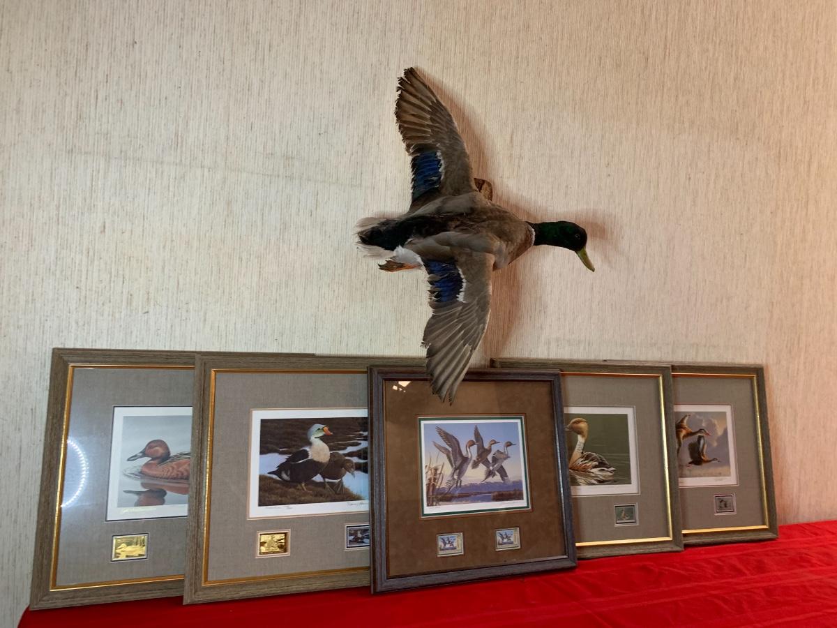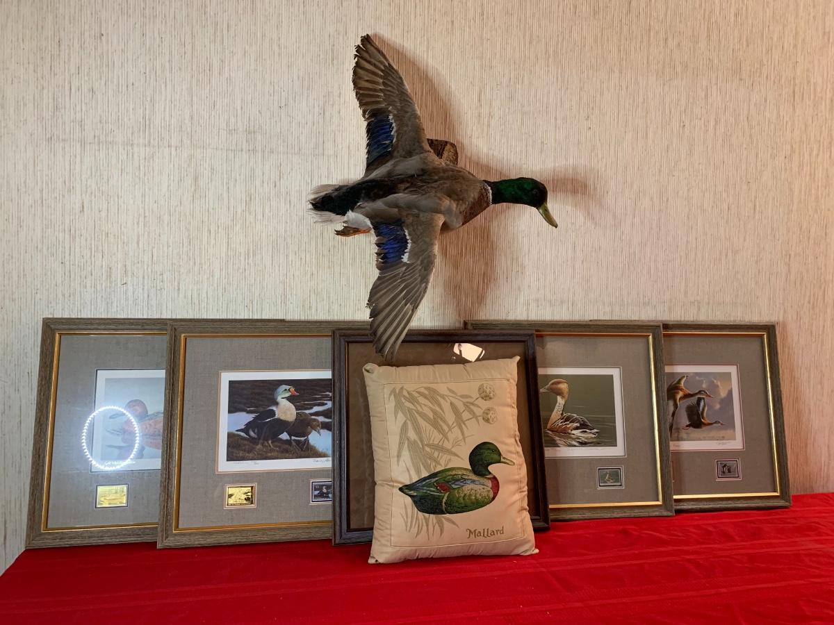 One taxidermy duck with 5 framed duck stamps with pictures and one decorative pillow