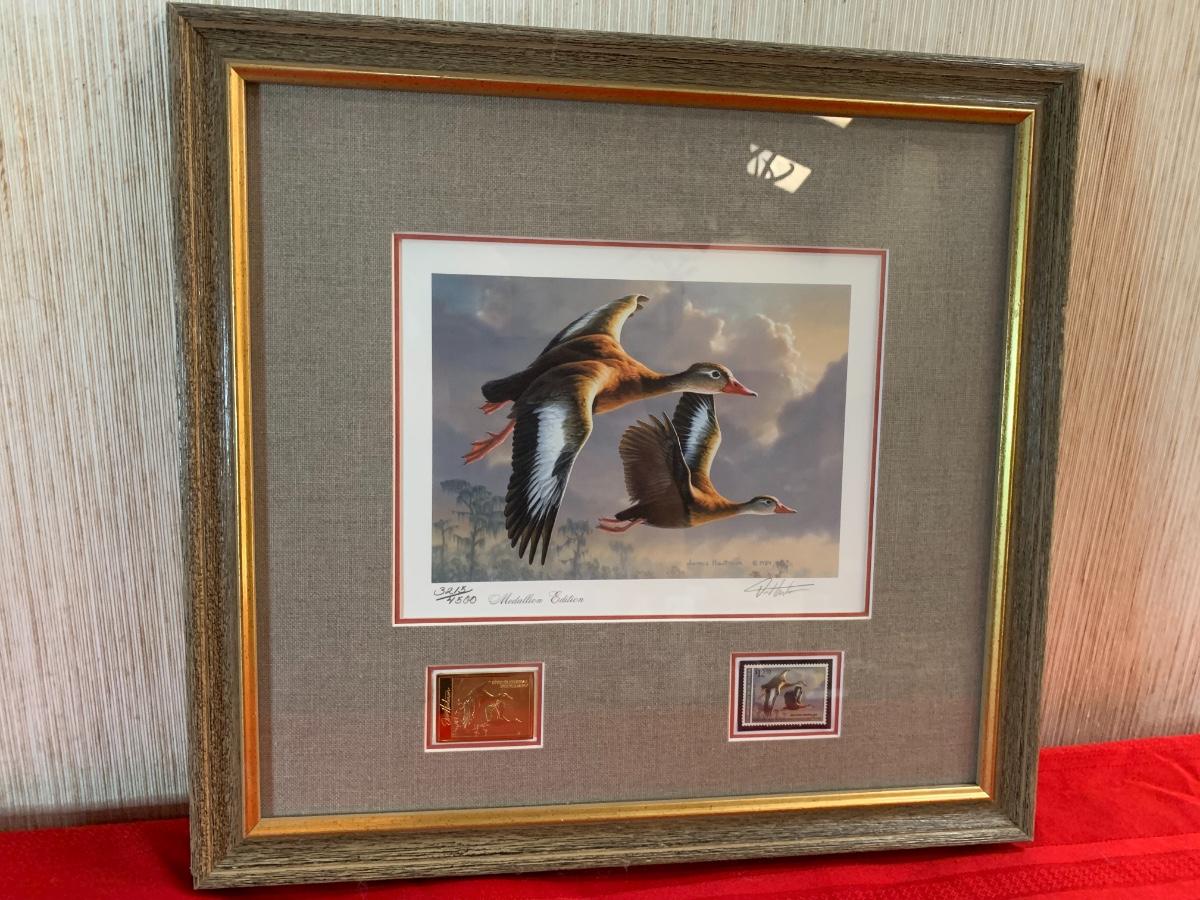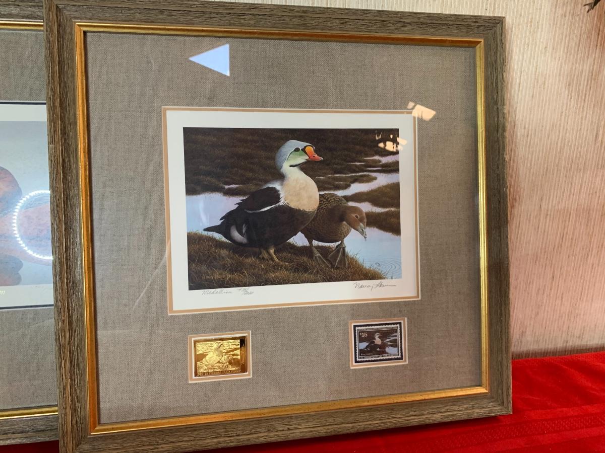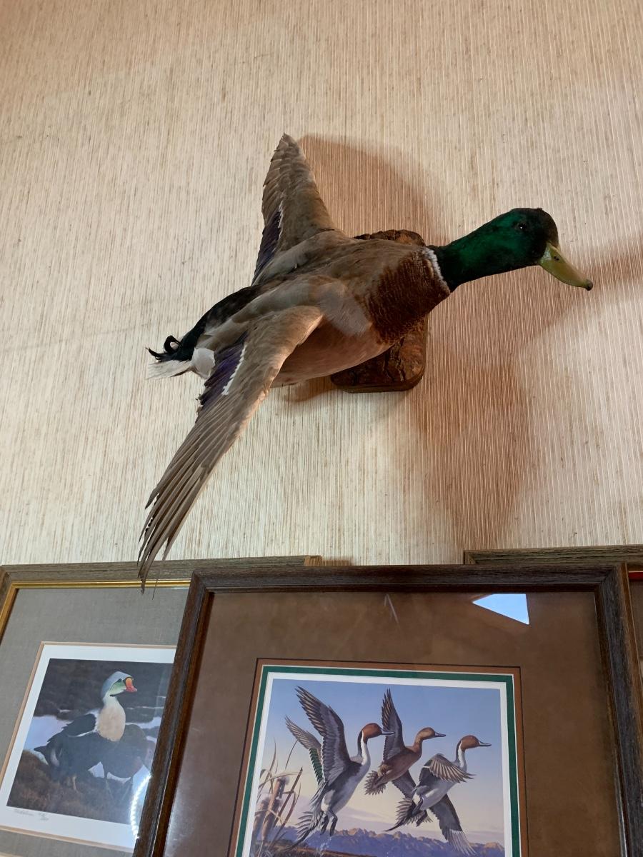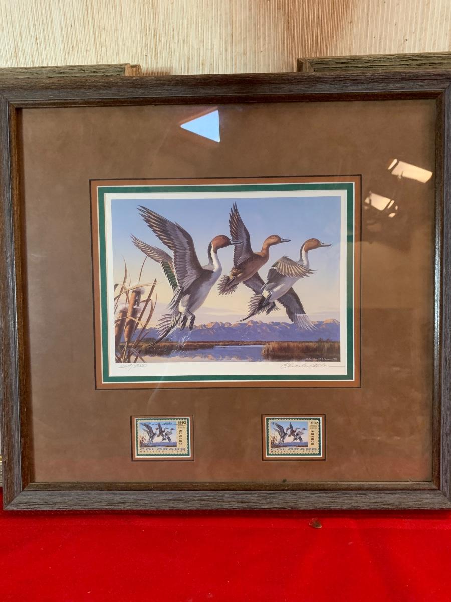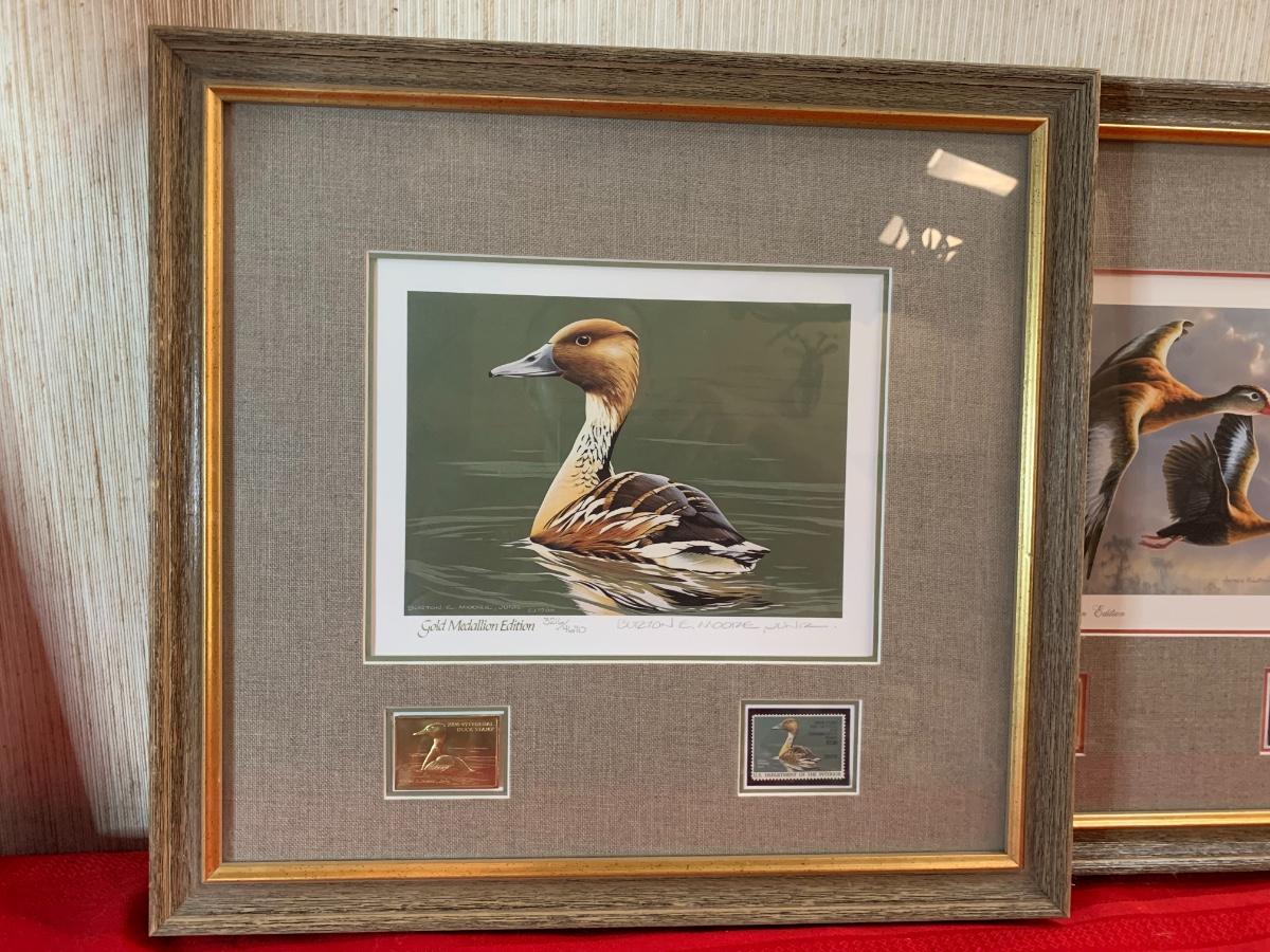 One taxidermy duck with 5 framed duck stamps with pictures and one decorative pillow