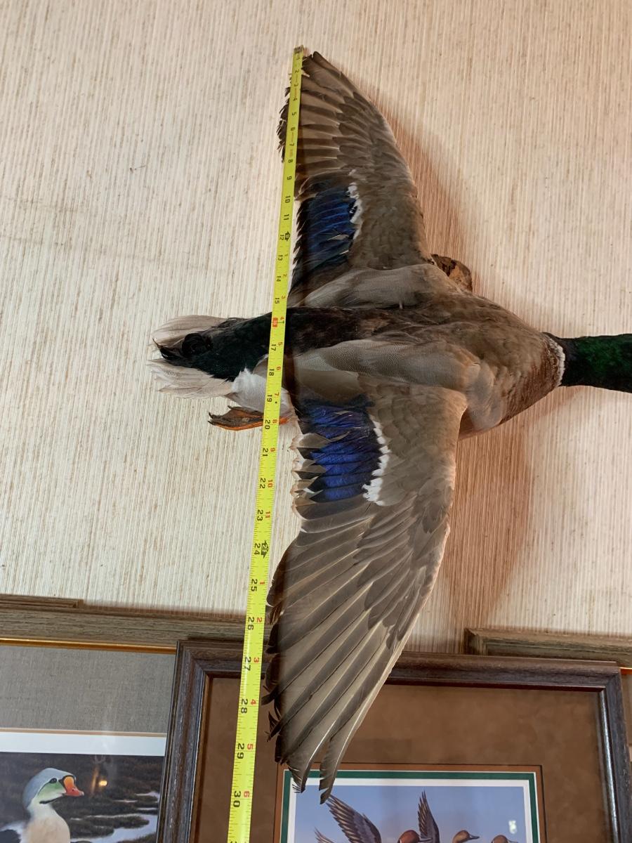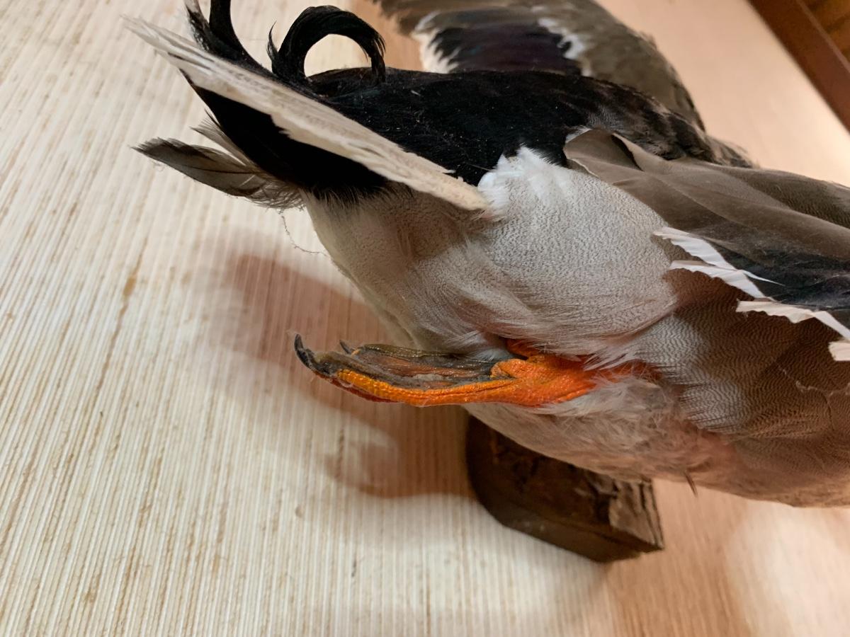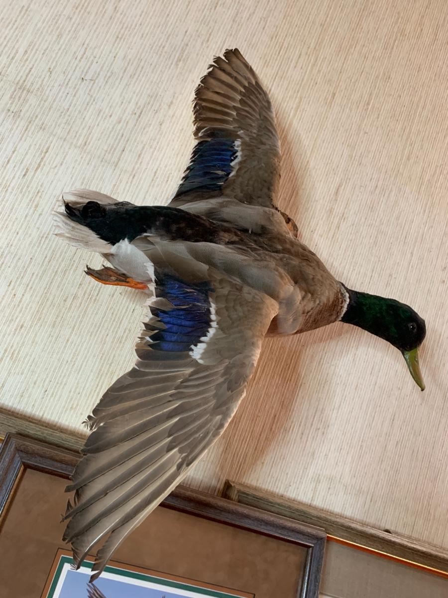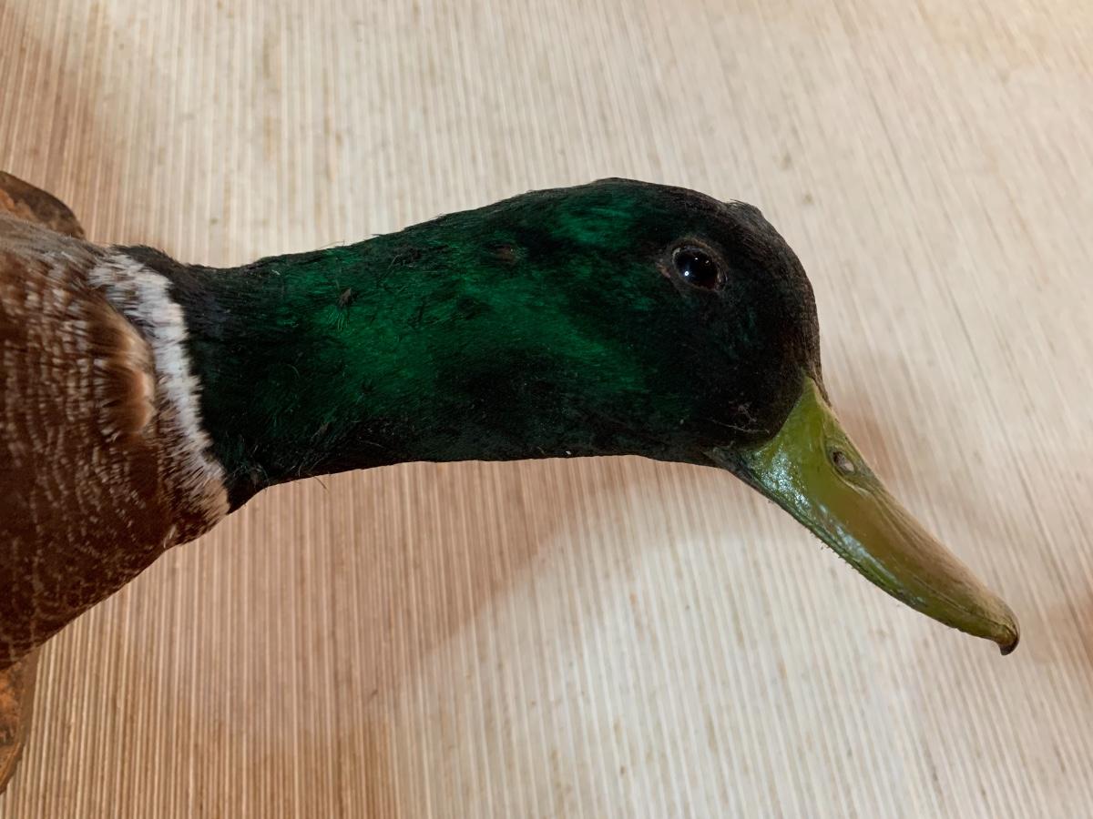 One taxidermy duck with 5 framed duck stamps with pictures and one decorative pillow