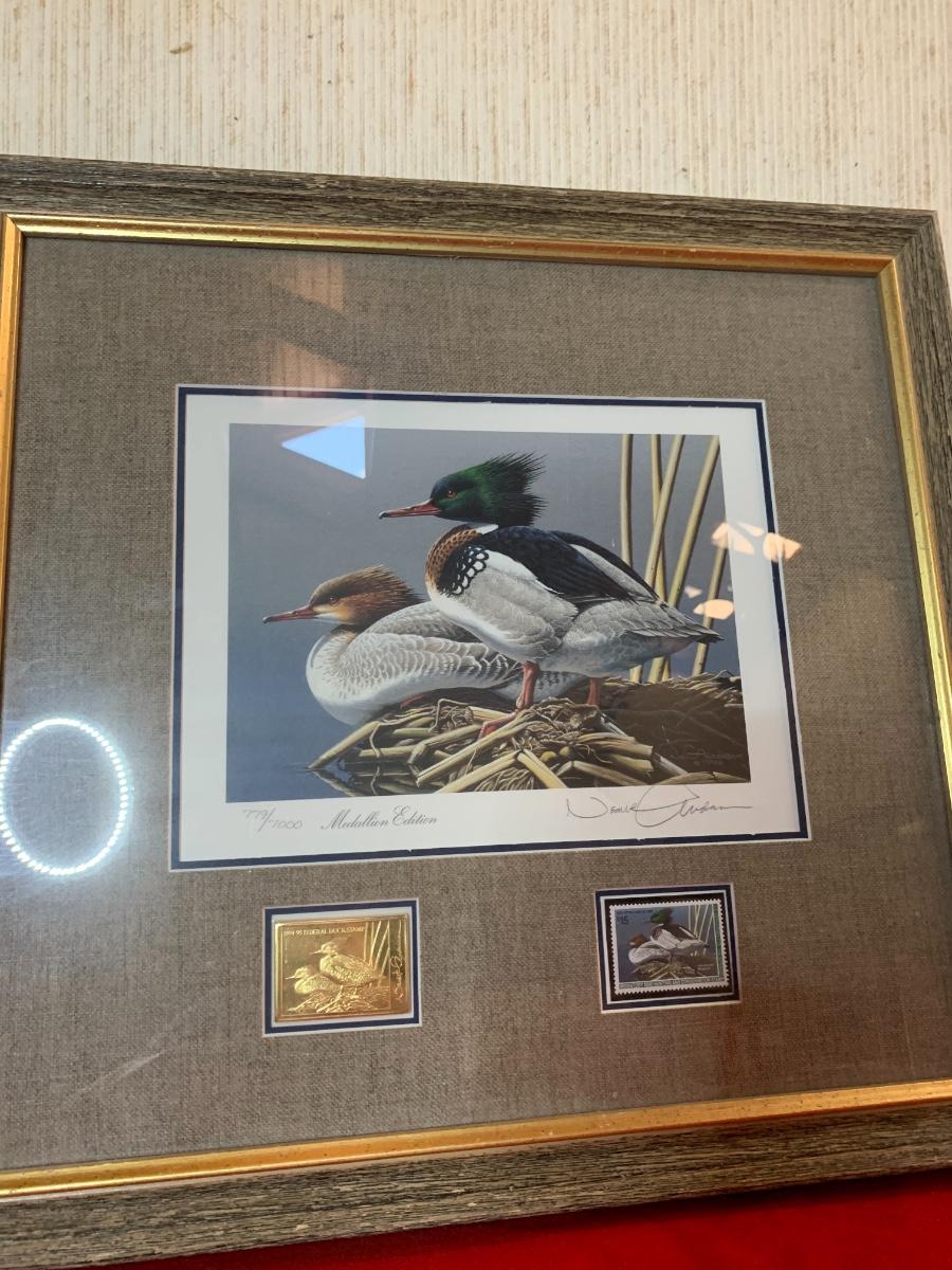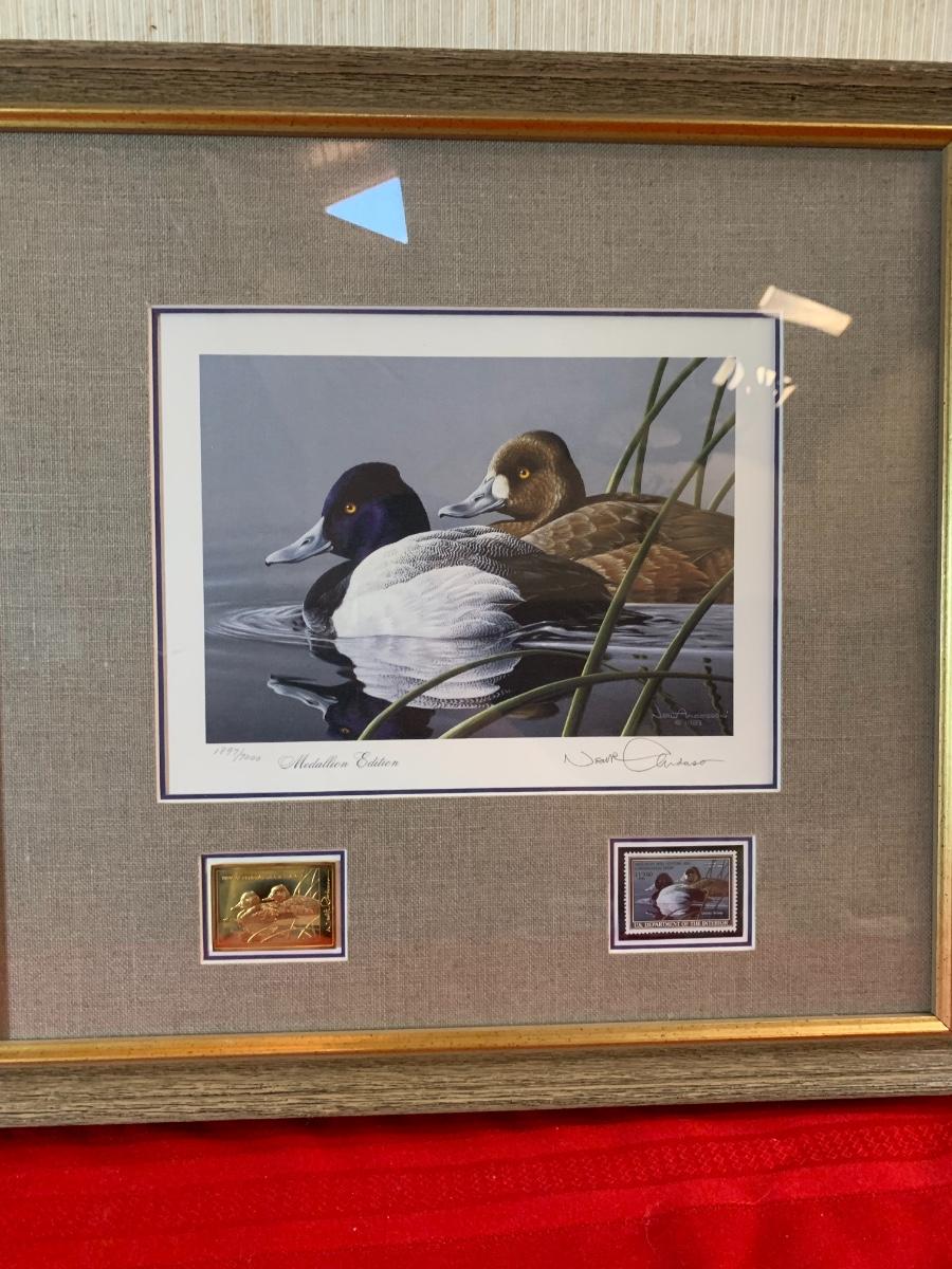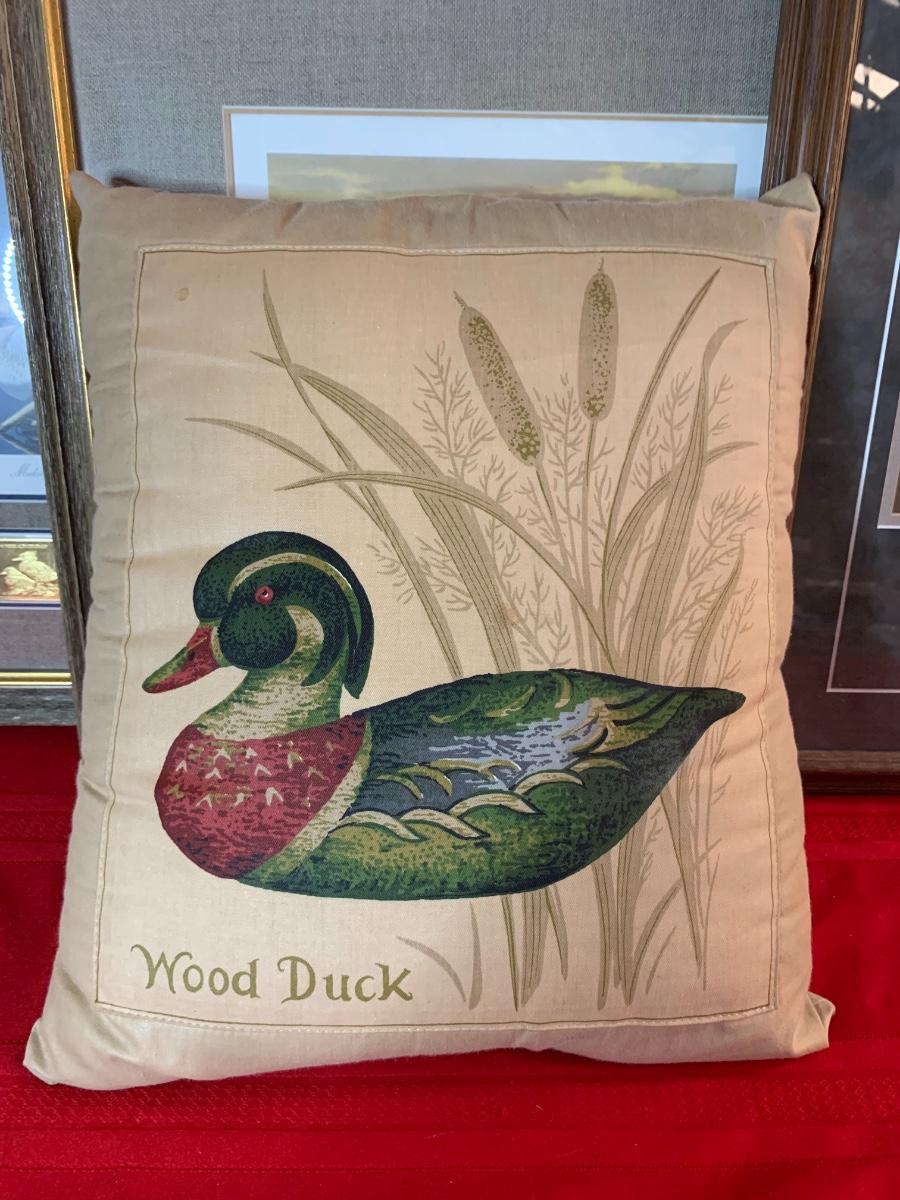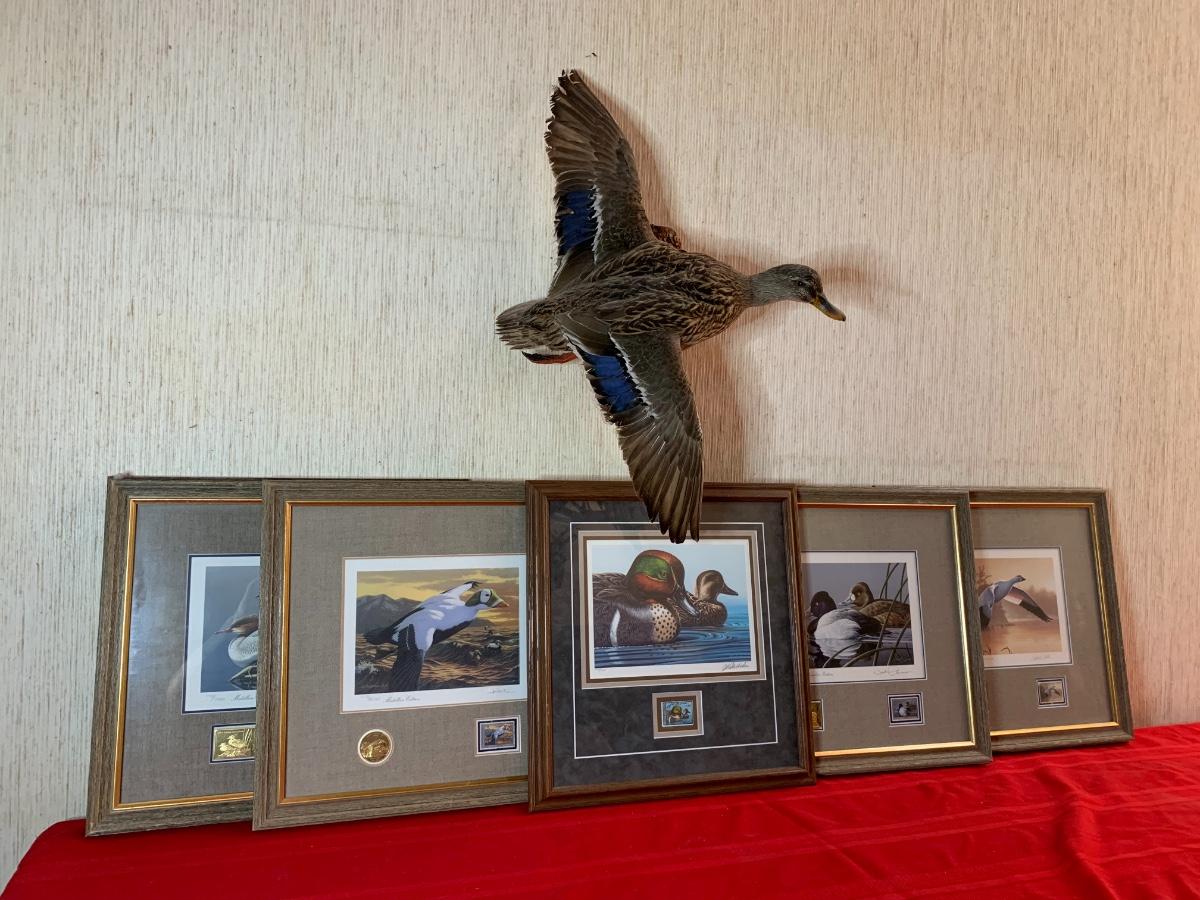 One taxidermy duck with 5 framed duck stamps with pictures and one decorative pillow