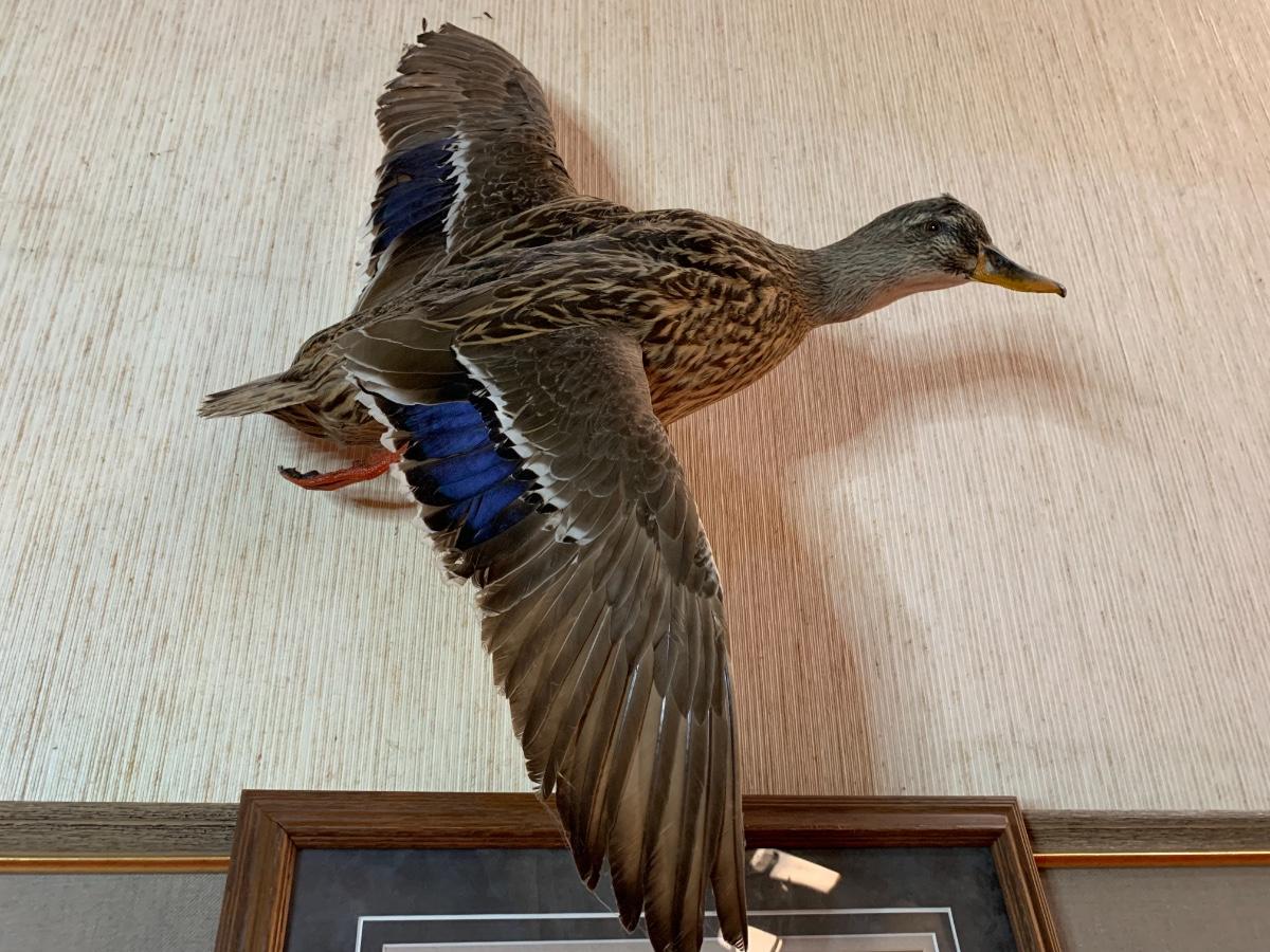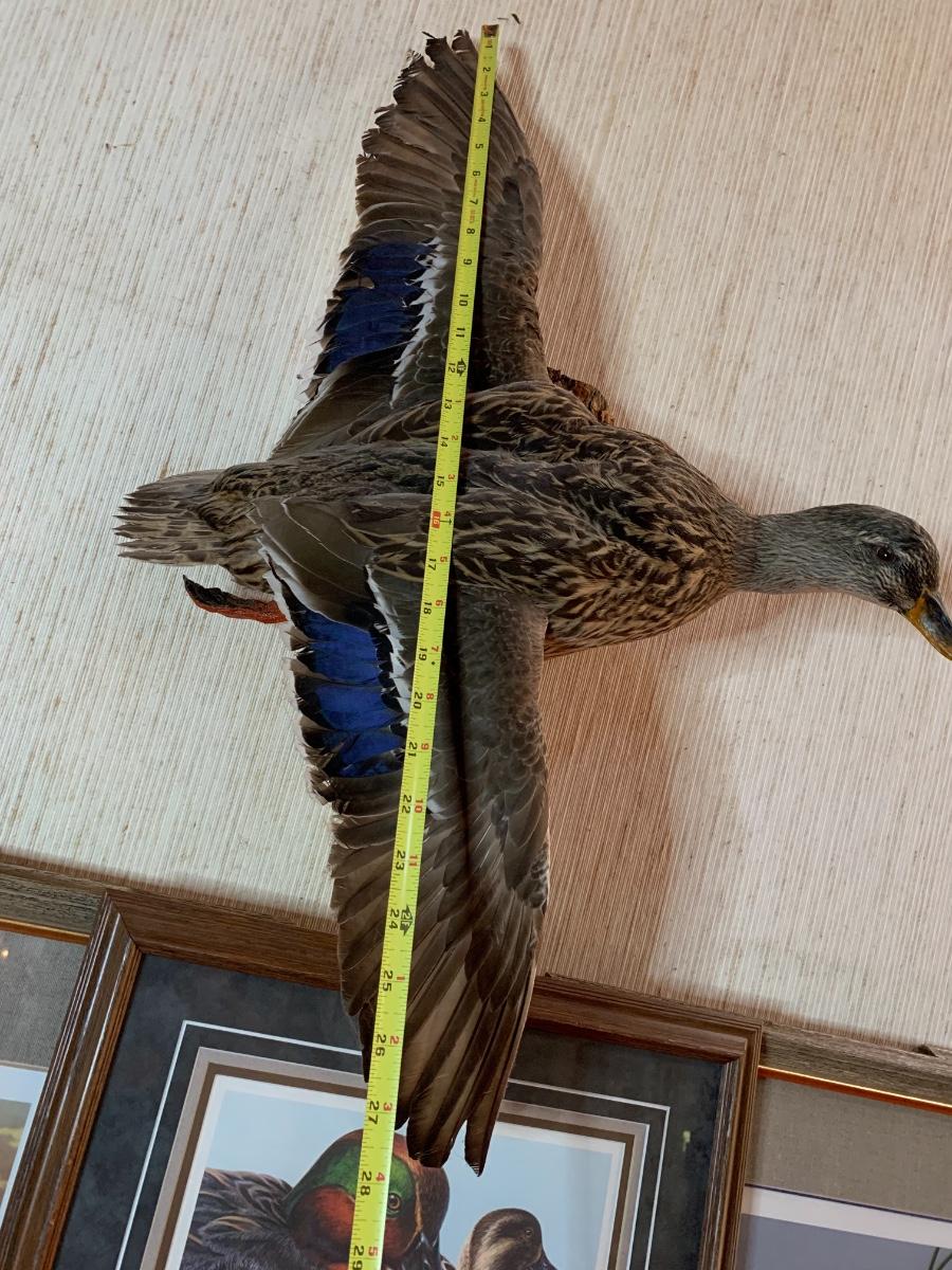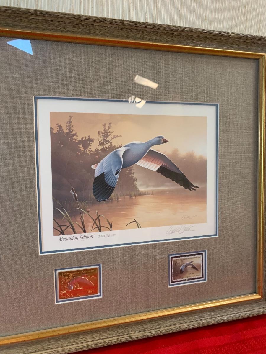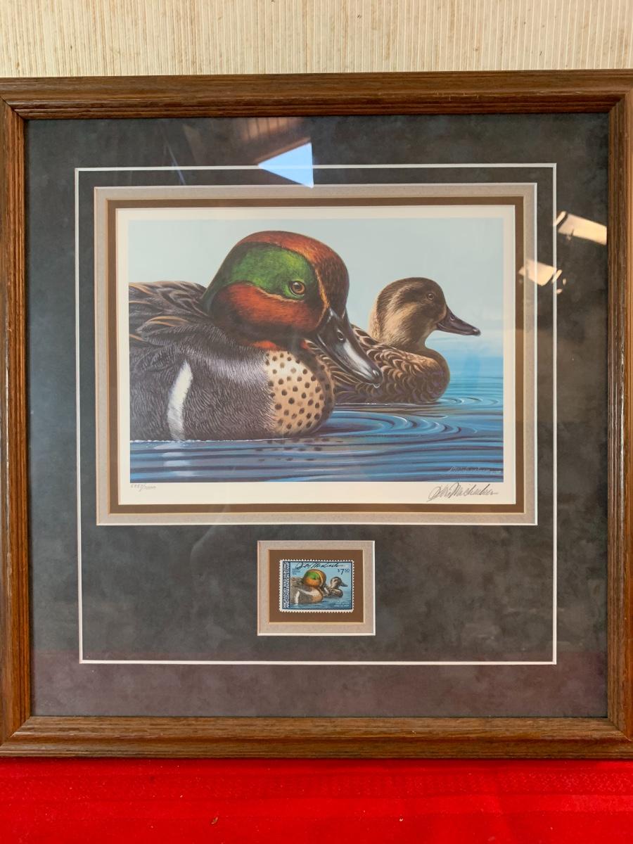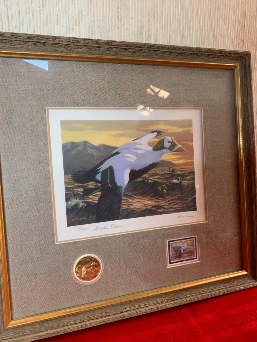 One taxidermy duck with 5 framed duck stamps with pictures and one decorative pillow