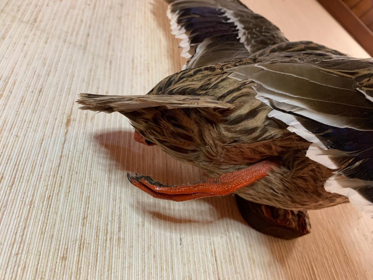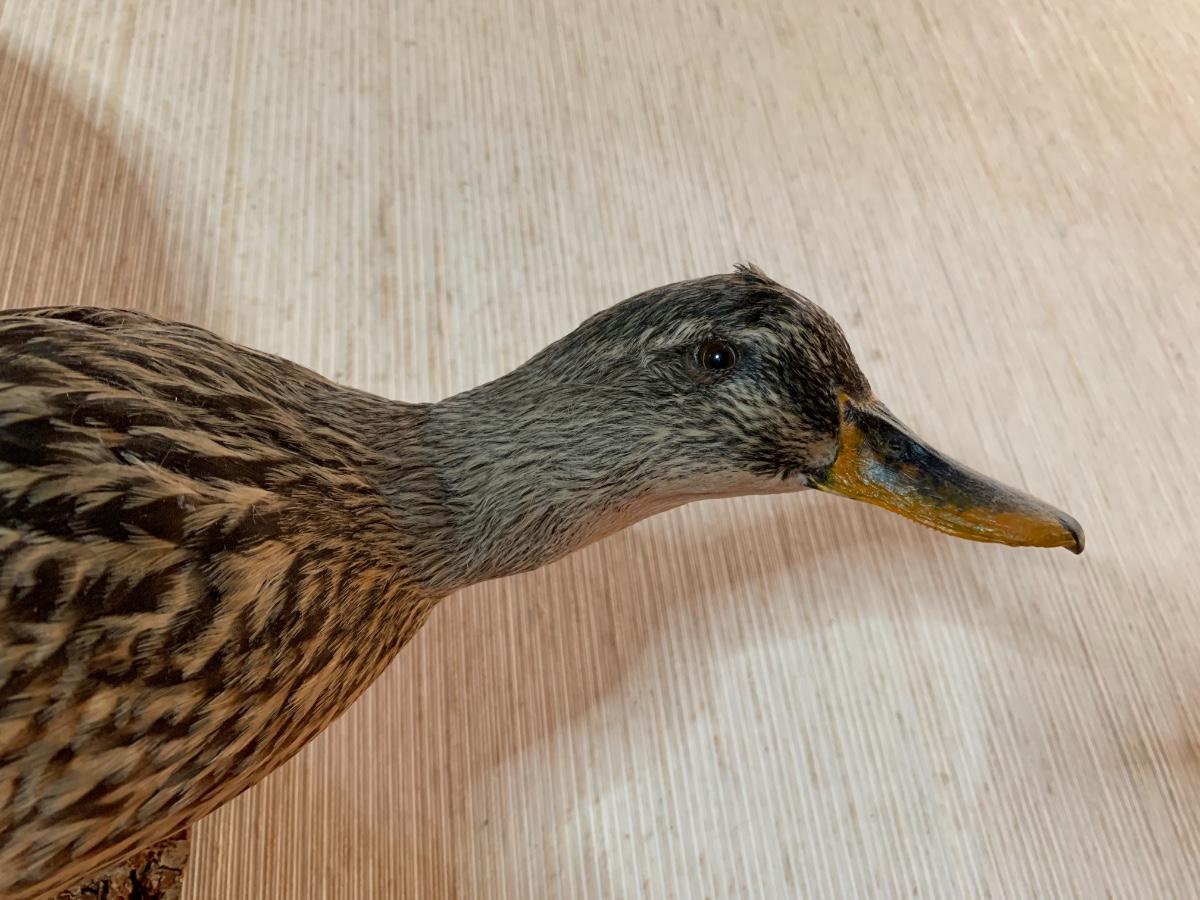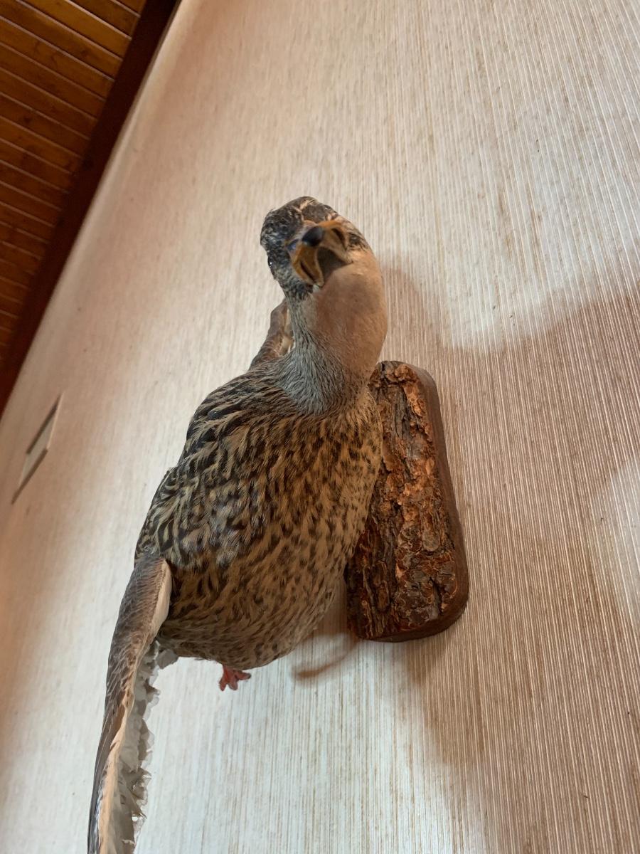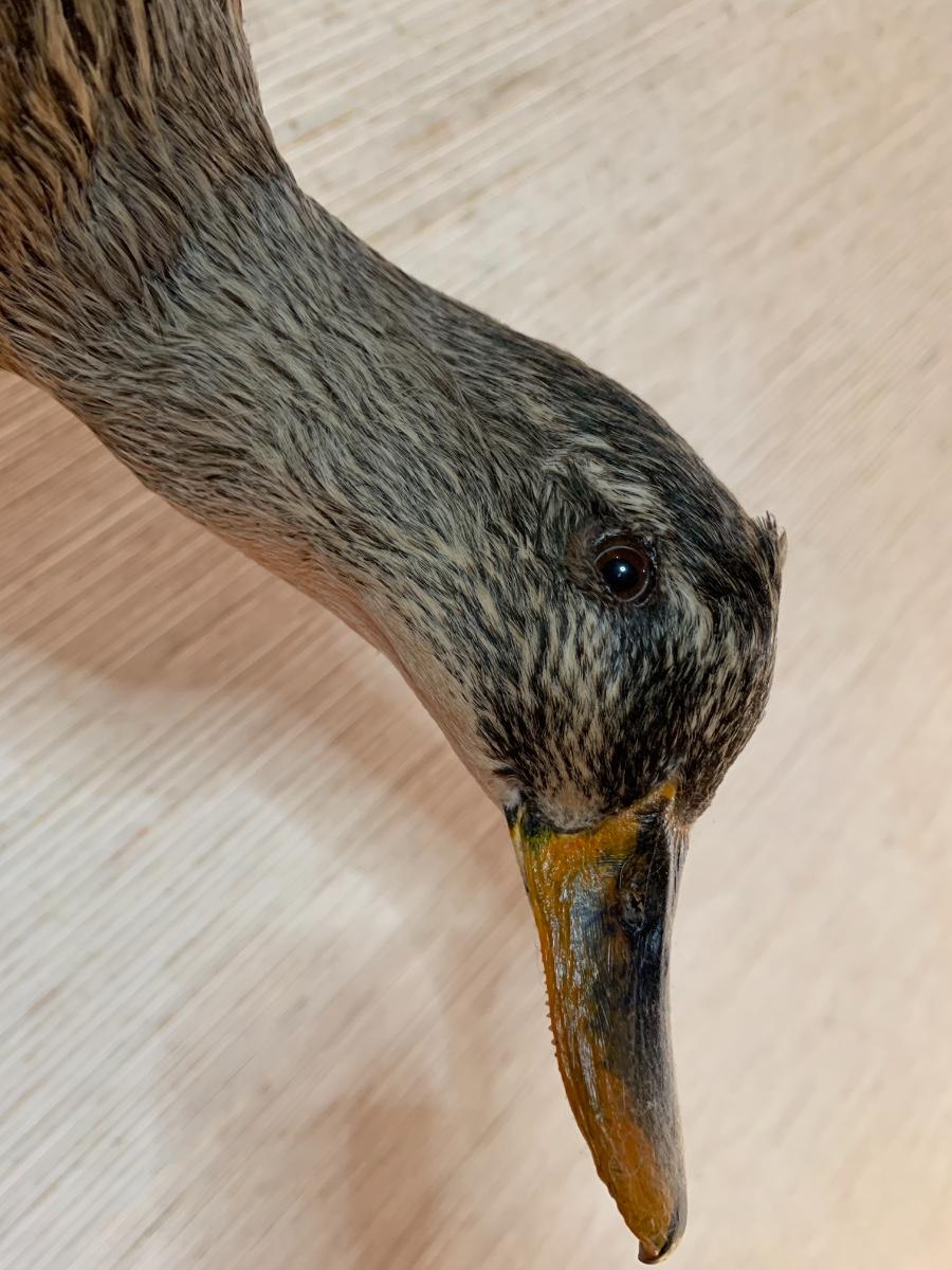 One taxidermy duck with 5 framed duck stamps with pictures and one decorative pillow