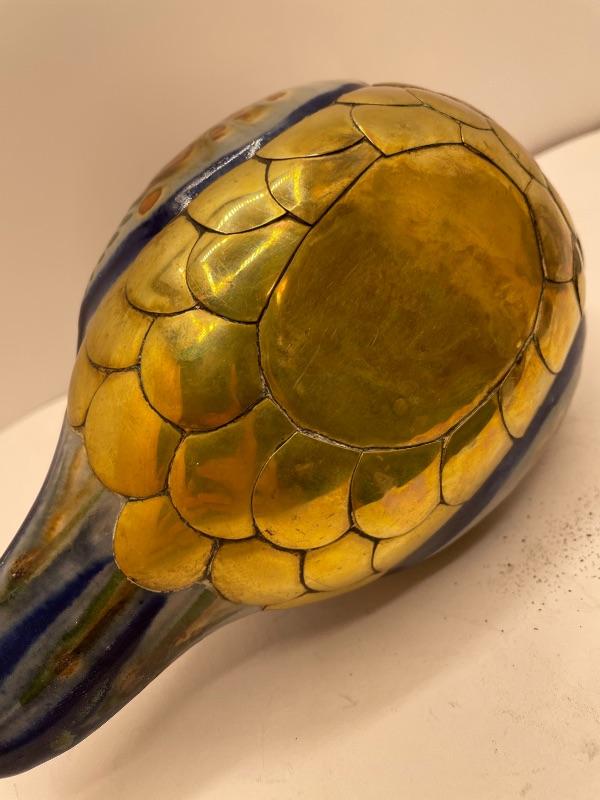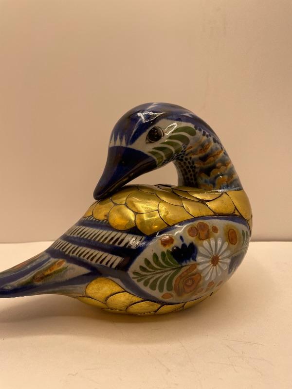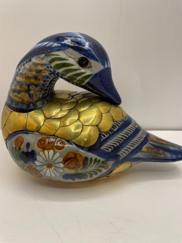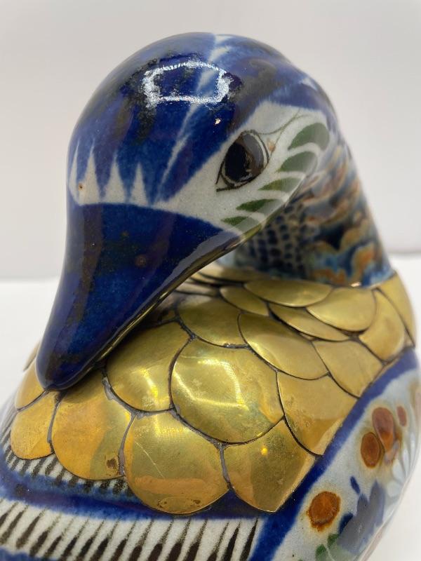 Lot #43 Vintage Mexican Tonala Pottery Duck with Brass and Enameled Paint Cobalt Blue