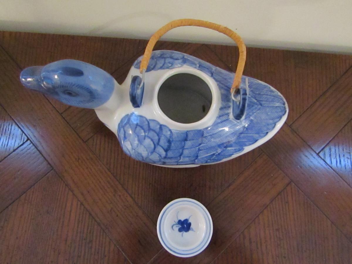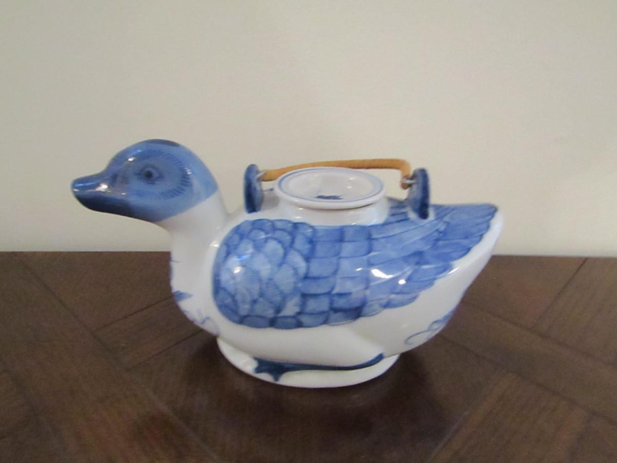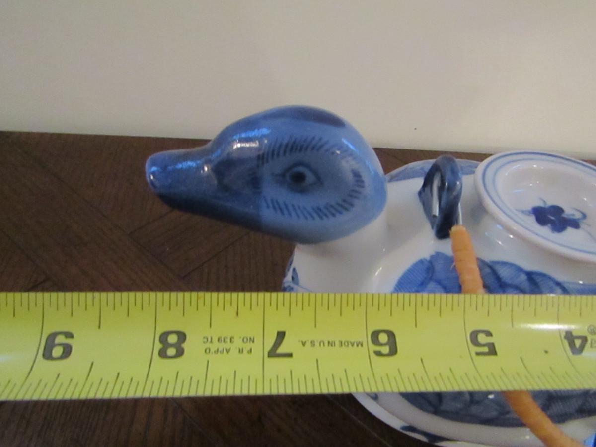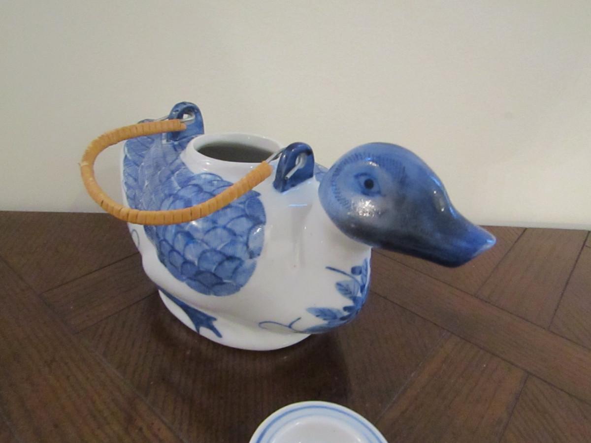 Duck Shaped Glazed Ceramic Teapot in Classic Blue and White