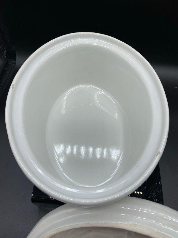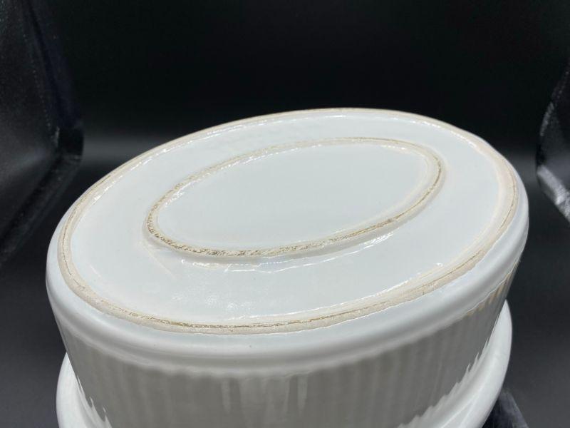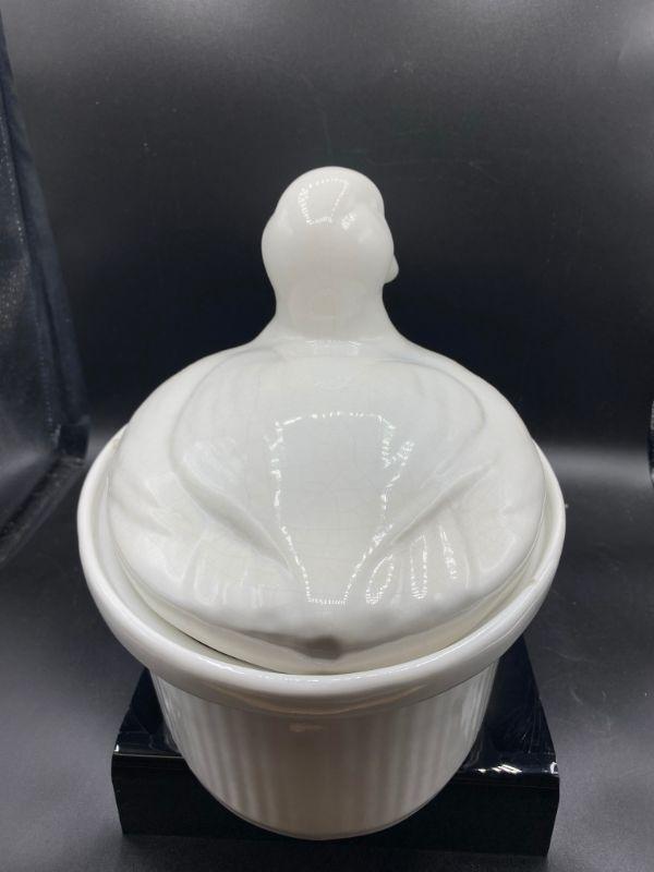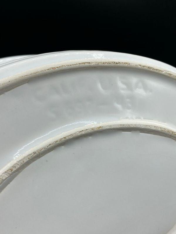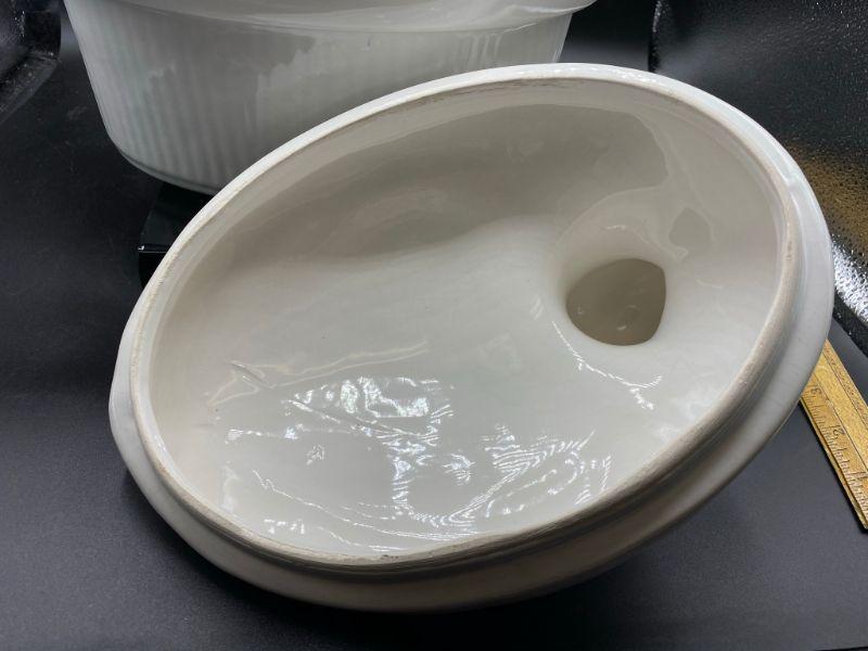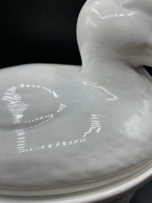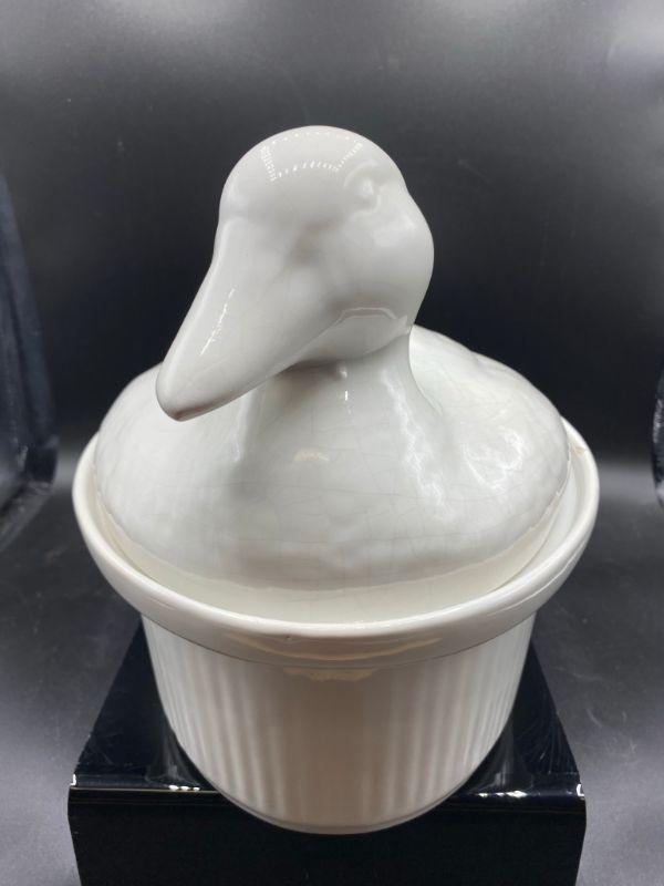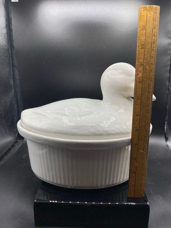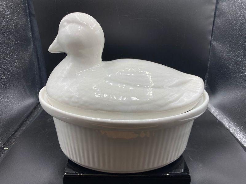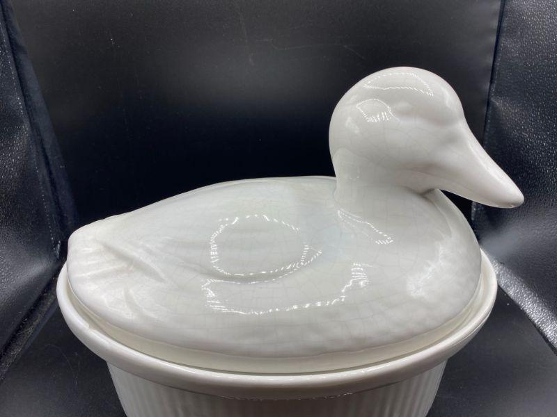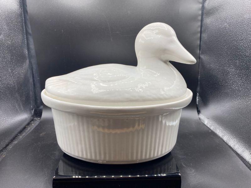 Large oval casserole dish with a duck shaped lid. Great for use or display. California pottery mark on the bottom of casserole. There is crazing to the duck but not the casserole dish. Casserole dish has two small chips on inside of rim. 11" across.