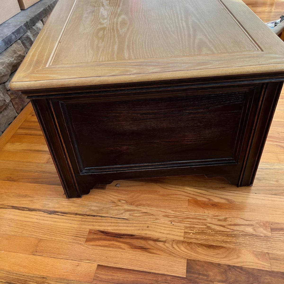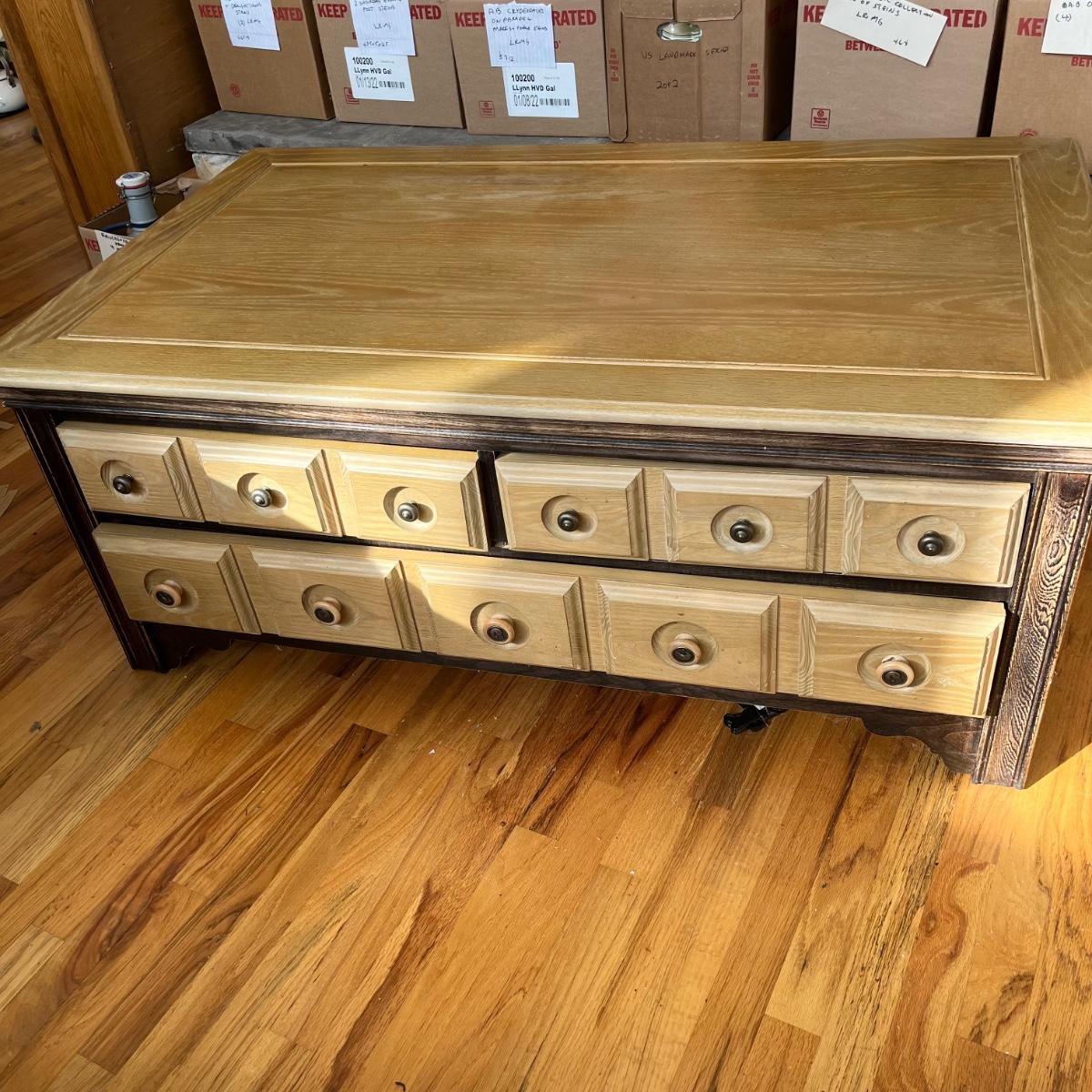Lot includes Ducks Unlimited three dovetailed drawer apothecary chest coffee table. Table measures 30” x 50” x 20”. Bring help item is substantial and Down one flight of stairs. Top has a few light spots, see pictures.