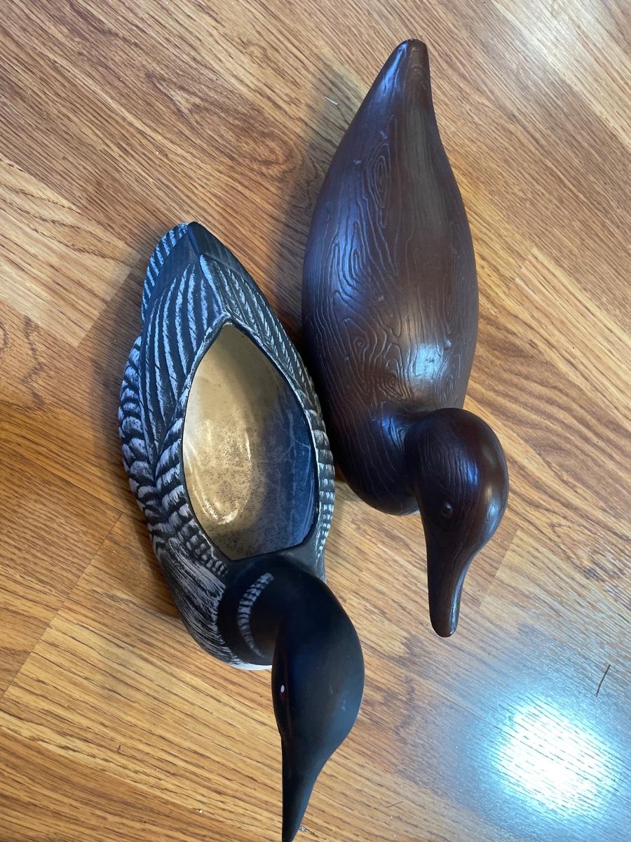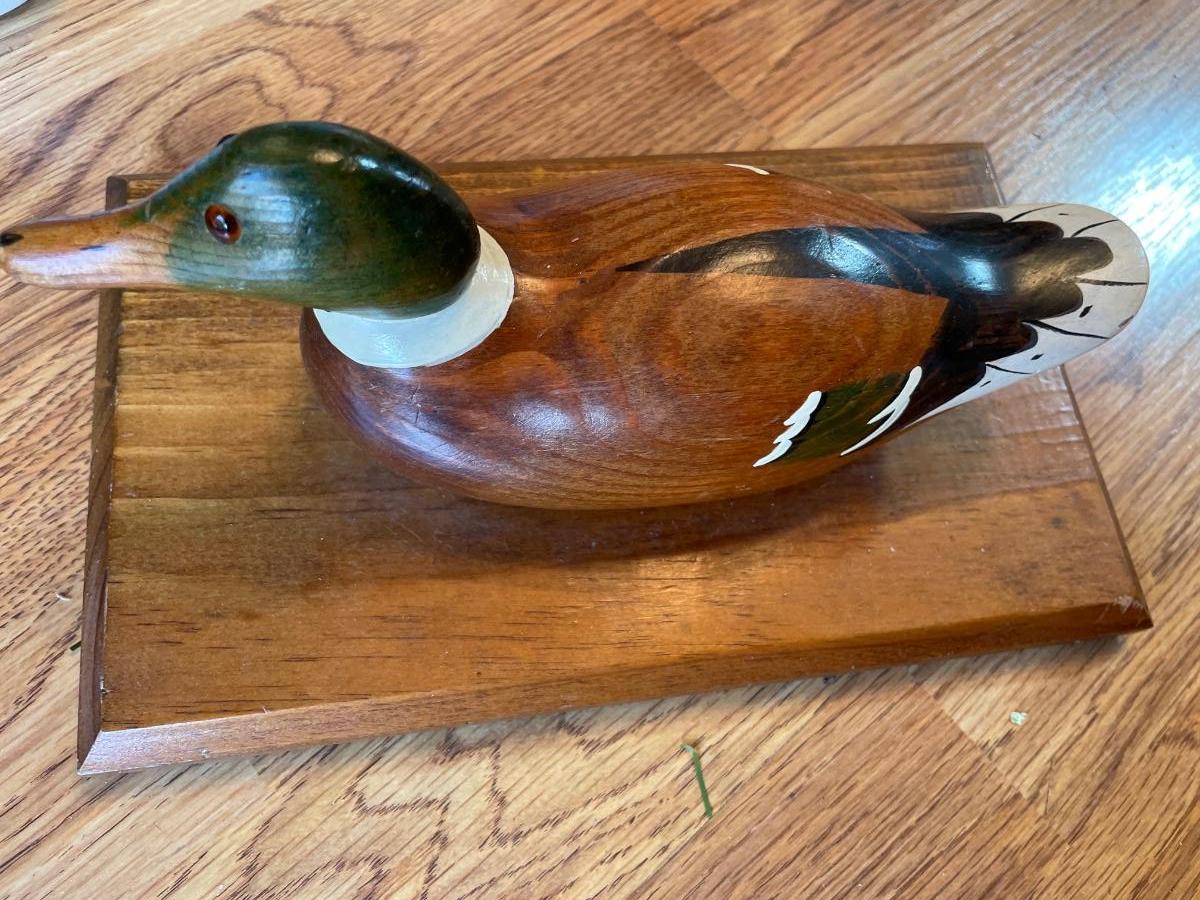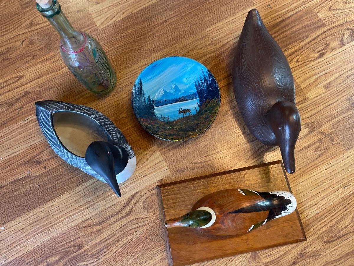 2 ceramic ducks, 1 wood duck, bottle and scene decor