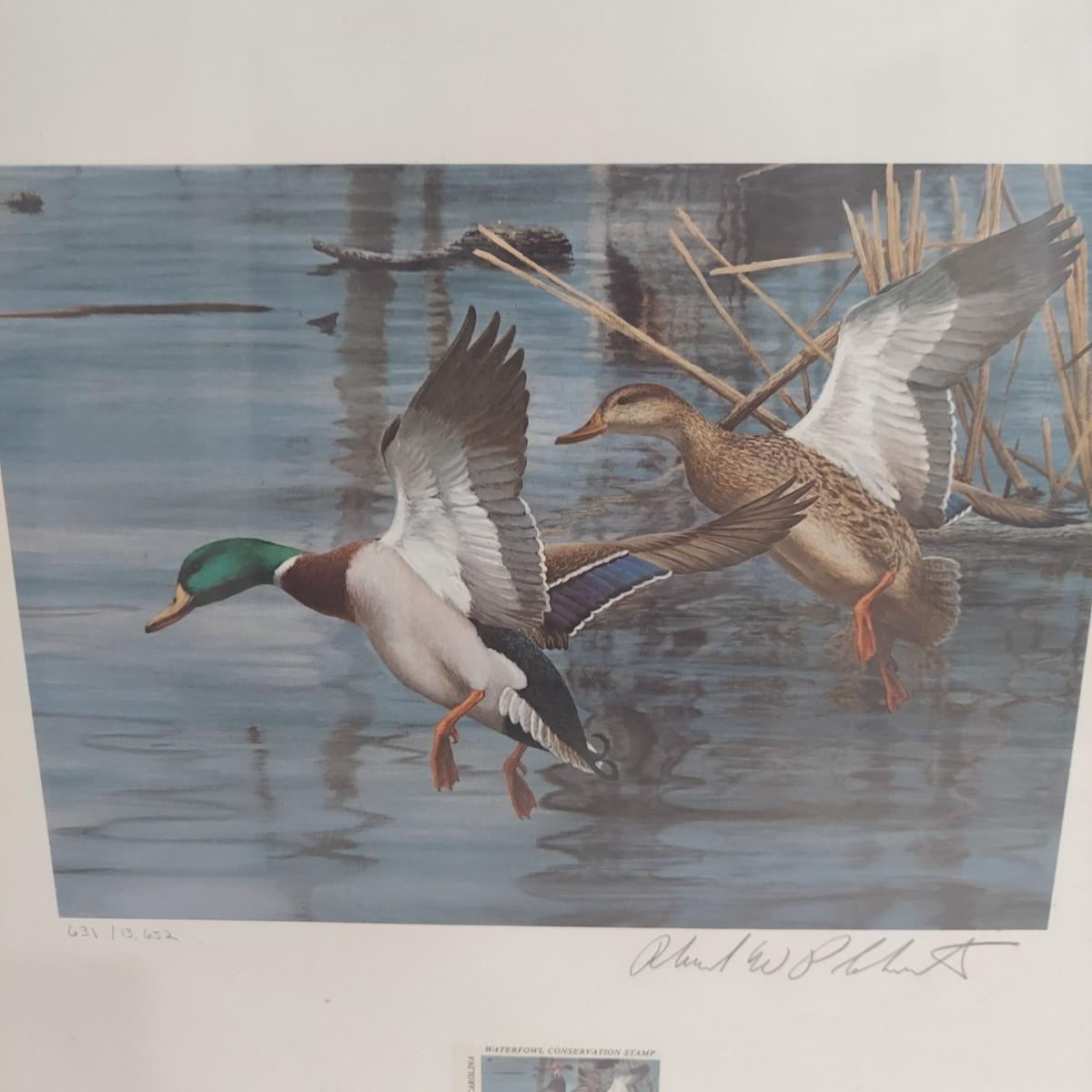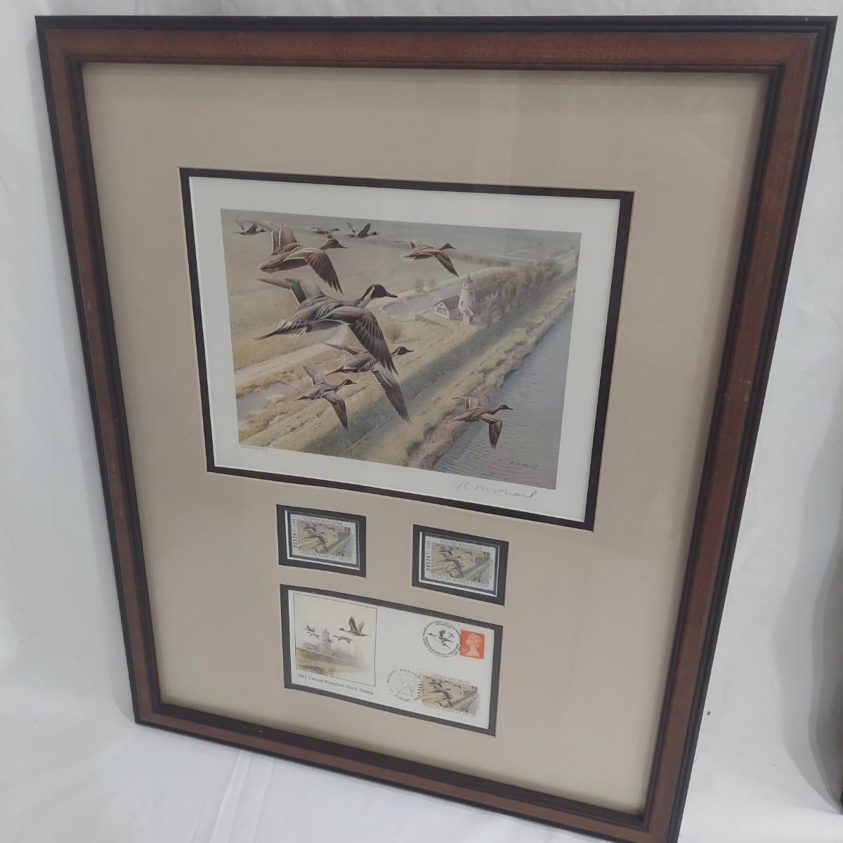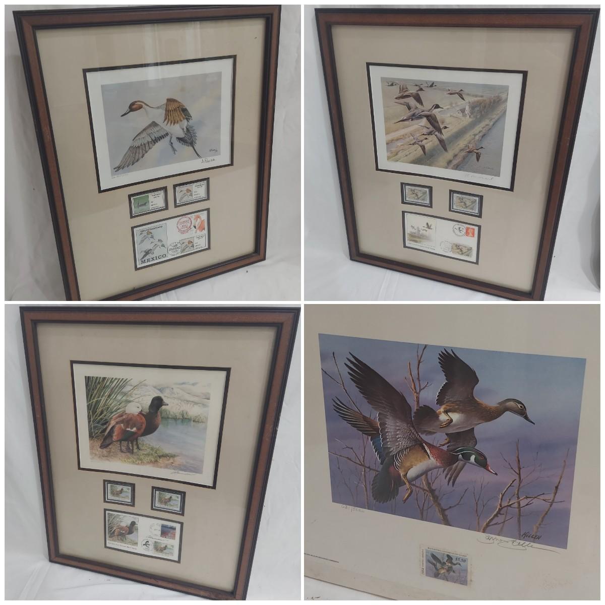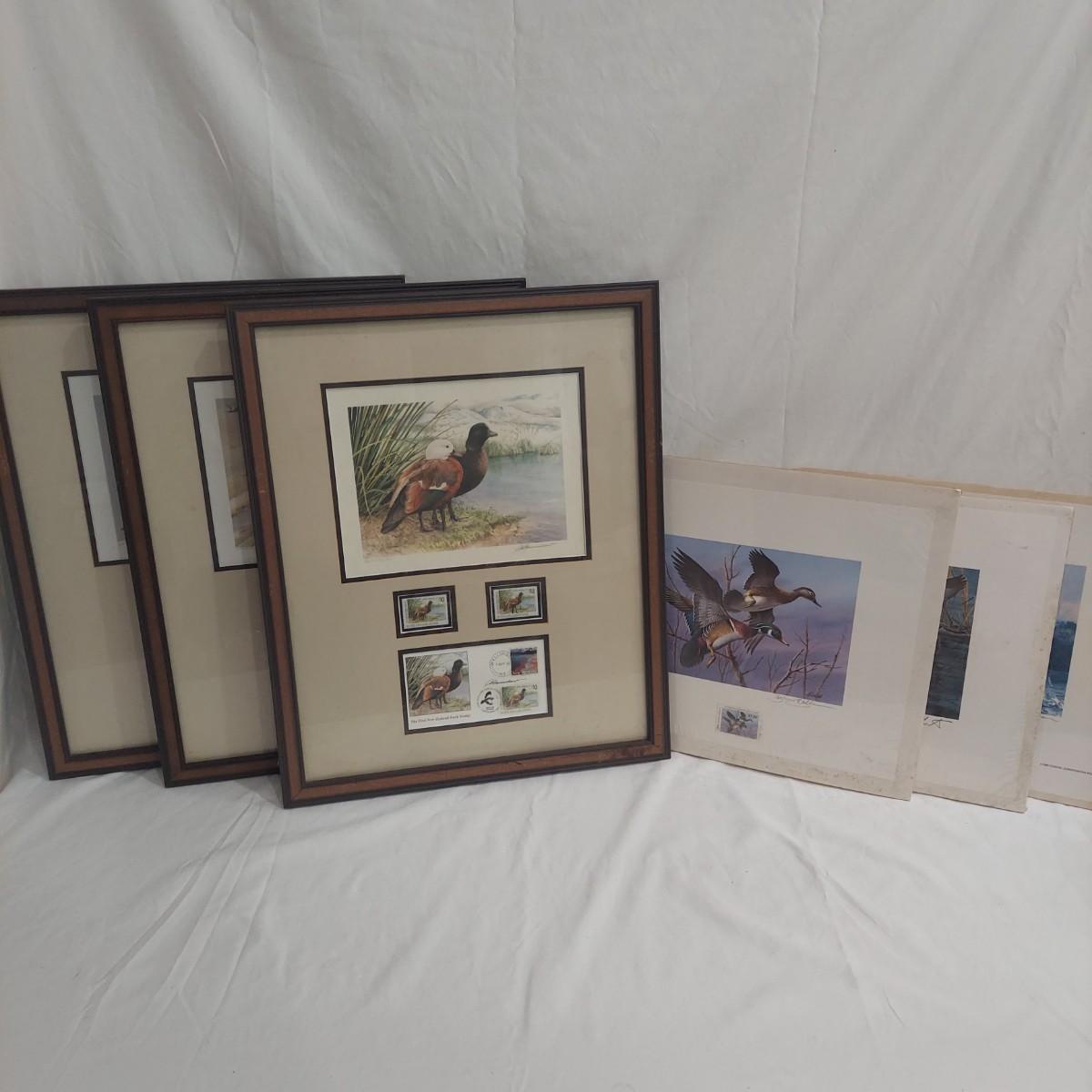 Lot includes three framed Ducks Unlimited collector stamps with their original artwork. Prints are pencil signed and numbered. Frames appear to be wooden. Also includes three unframed prints with stamps. Please see photos for details. The larger pieces individually measure 17.5” x 21.5”. Those pieces are protected under glass. Shipping available