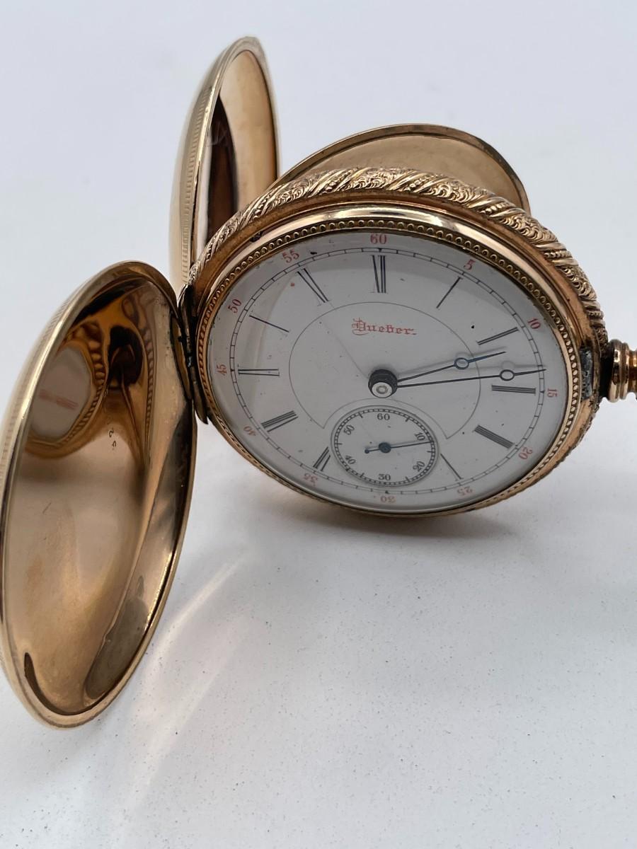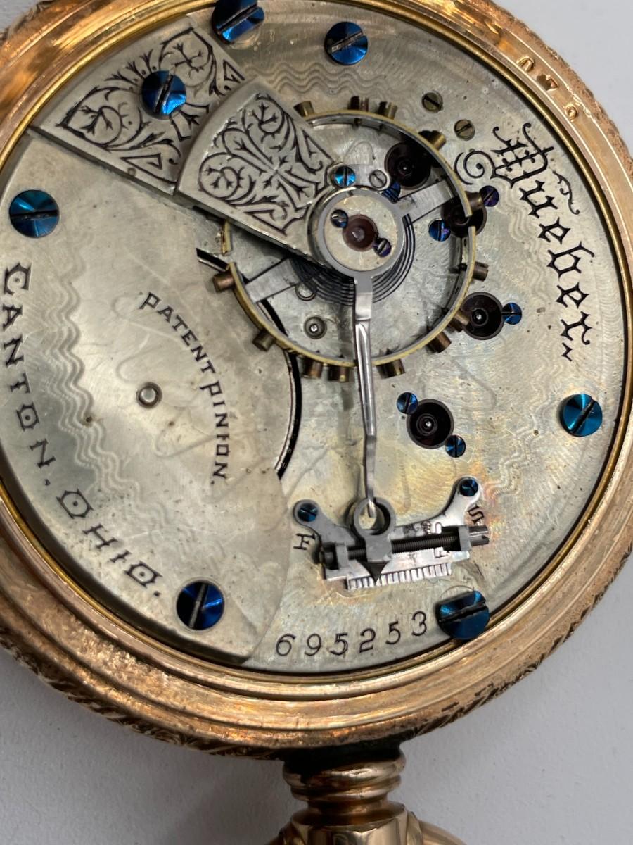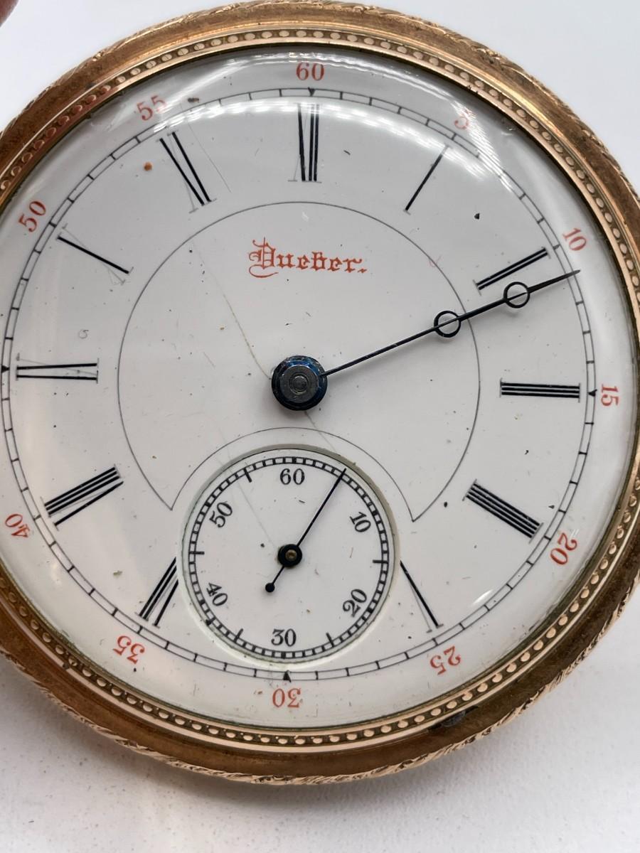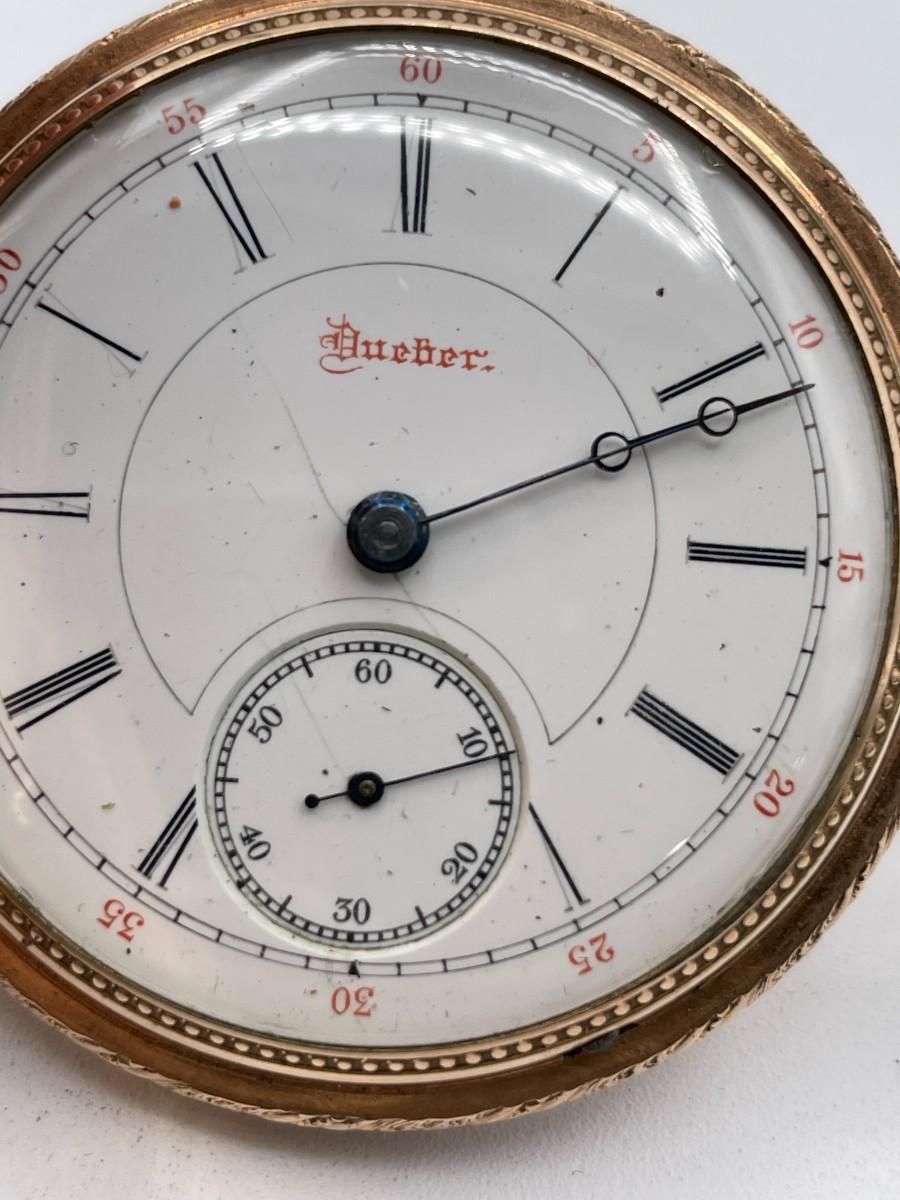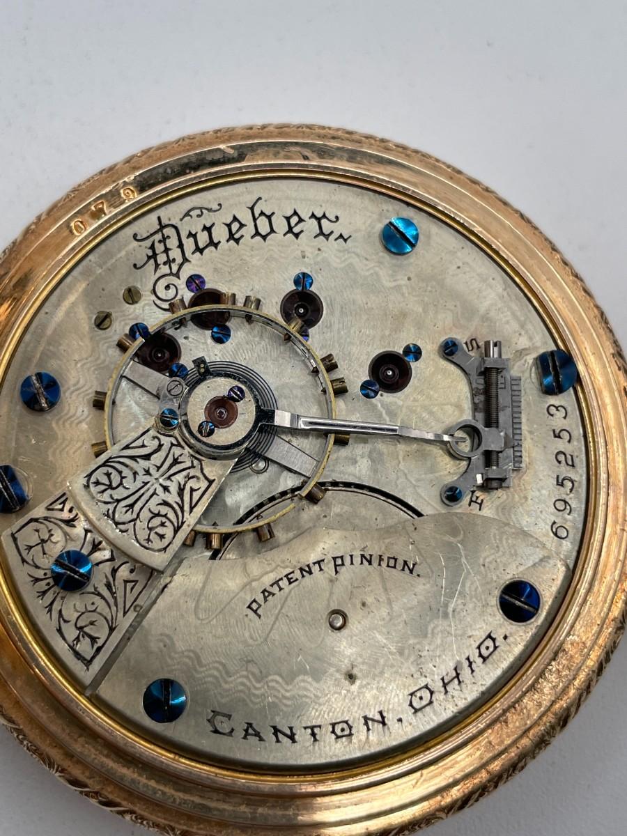 Dueber Pocket Watch, No. 695253, Size 18s. Case: Columbia No. 32079, Acie Tested 14K. Condition - Winder & watch are in working order. This is not a guarantee that all parts are original nor is the watch autheniticated.
