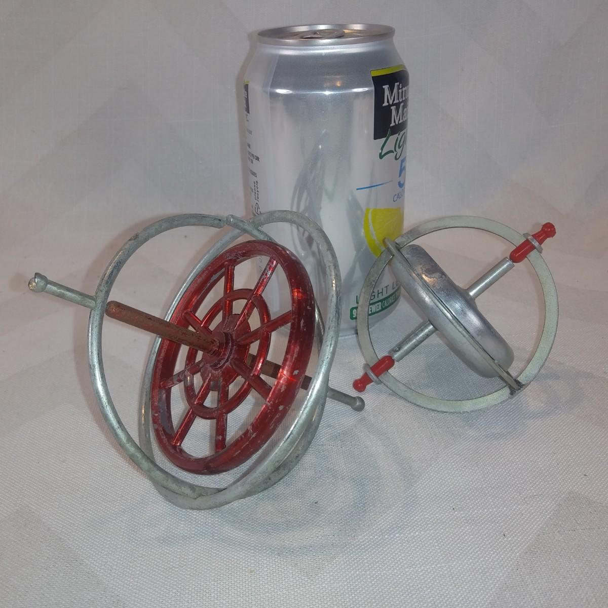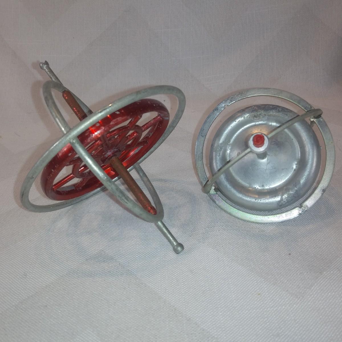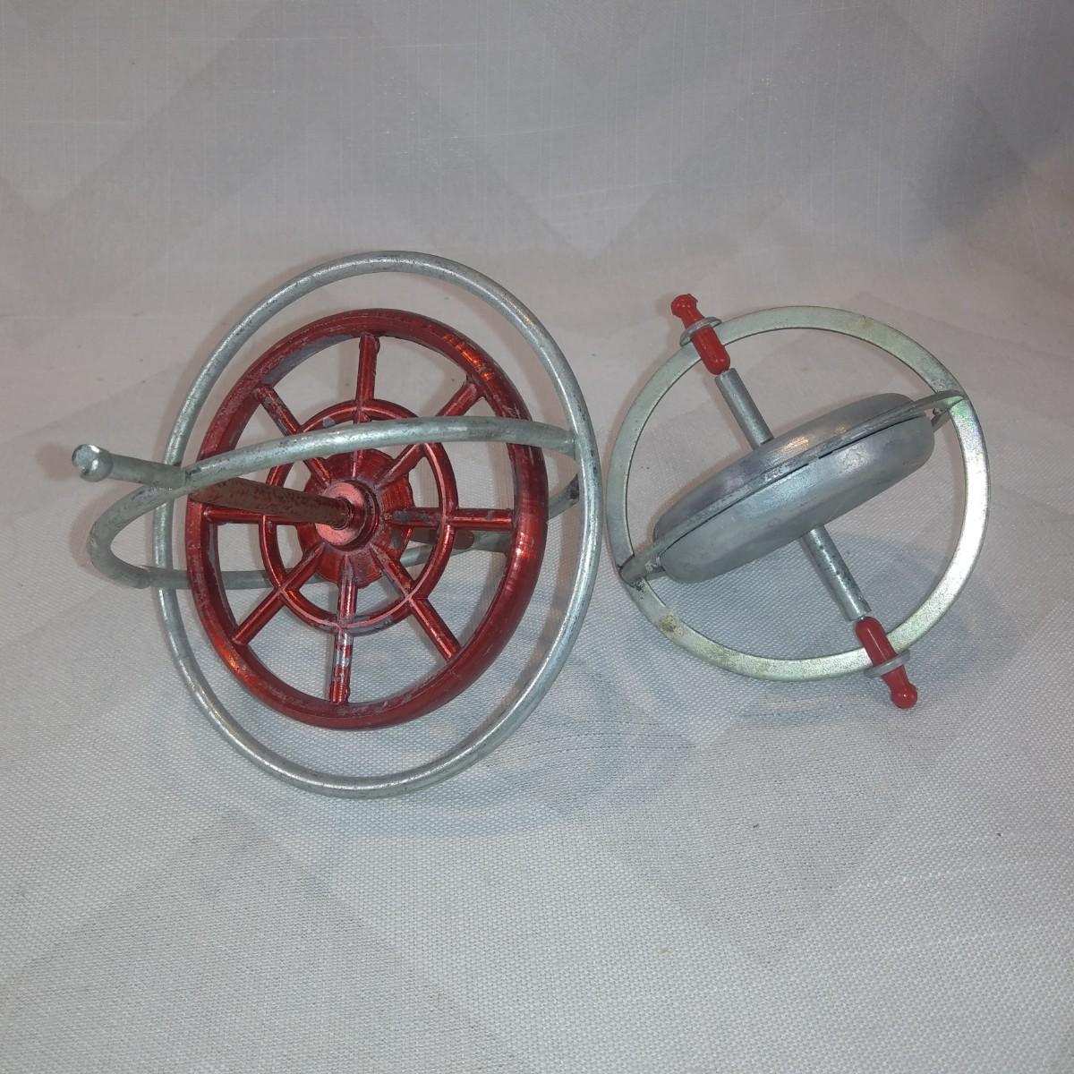 This auction lot is for a couple of Dueling Gyroscopes. This pair of vintage metal gyroscopes are a lot of fun. They do lots of tricks, spins and gravity defying feats. We don't have a book or pamphlet with them but one can be easily found on line. They are in very good used condition. A blast from our past - your grand kids will love 'em.