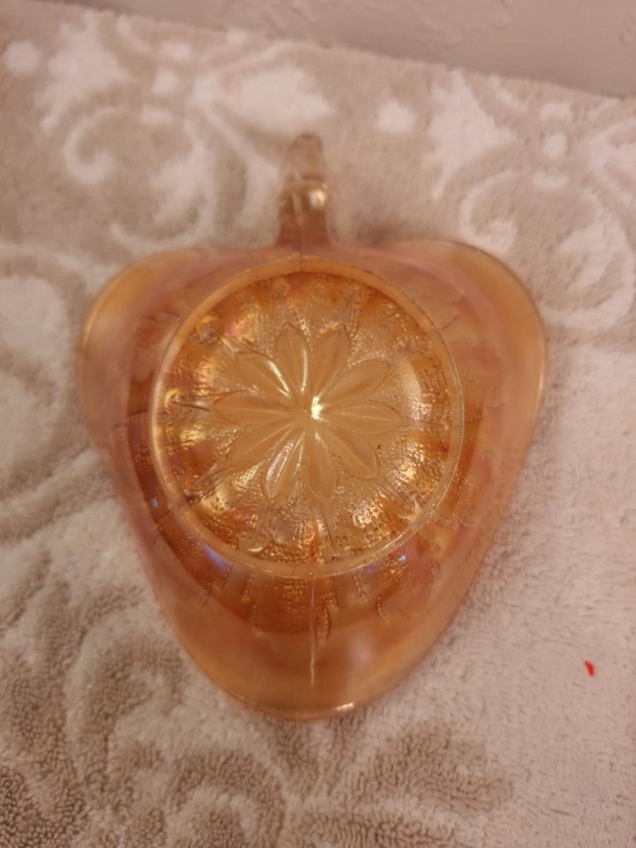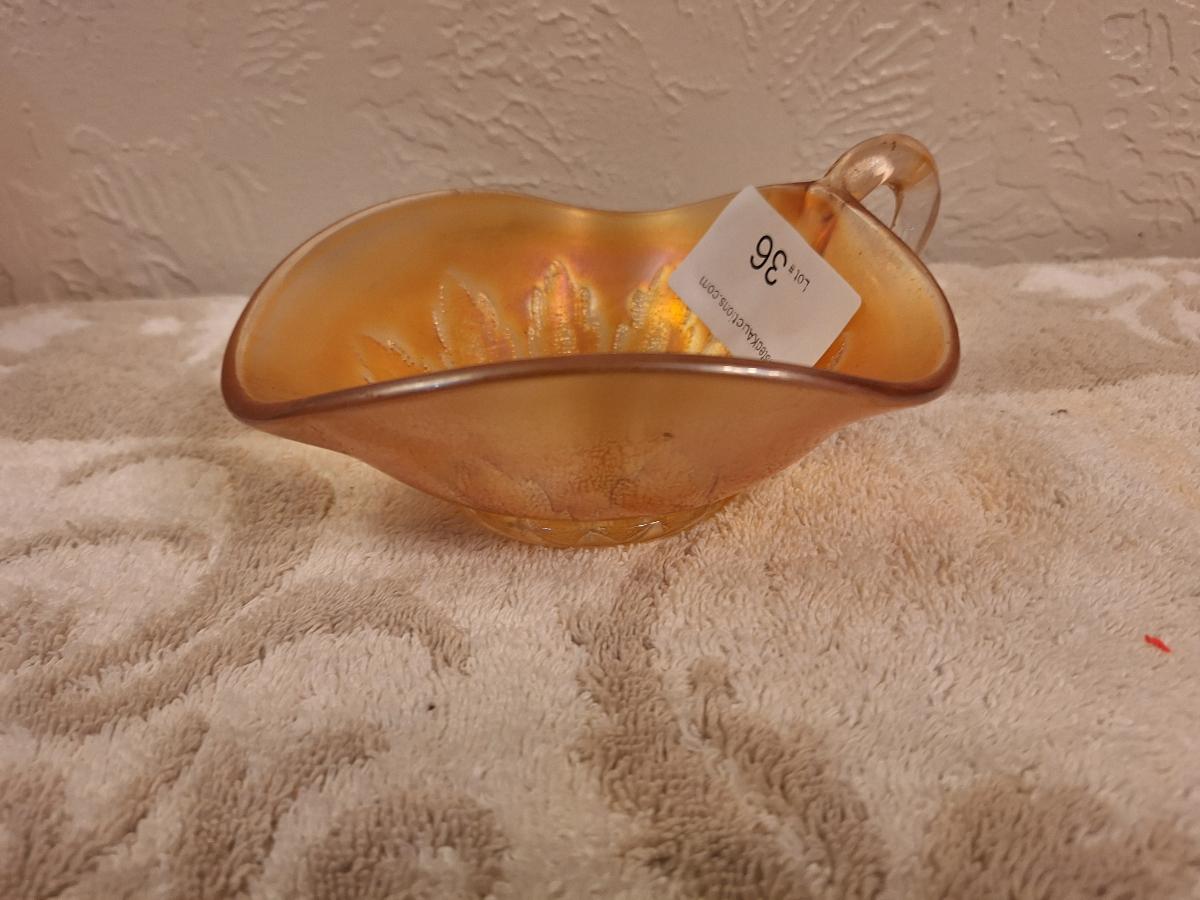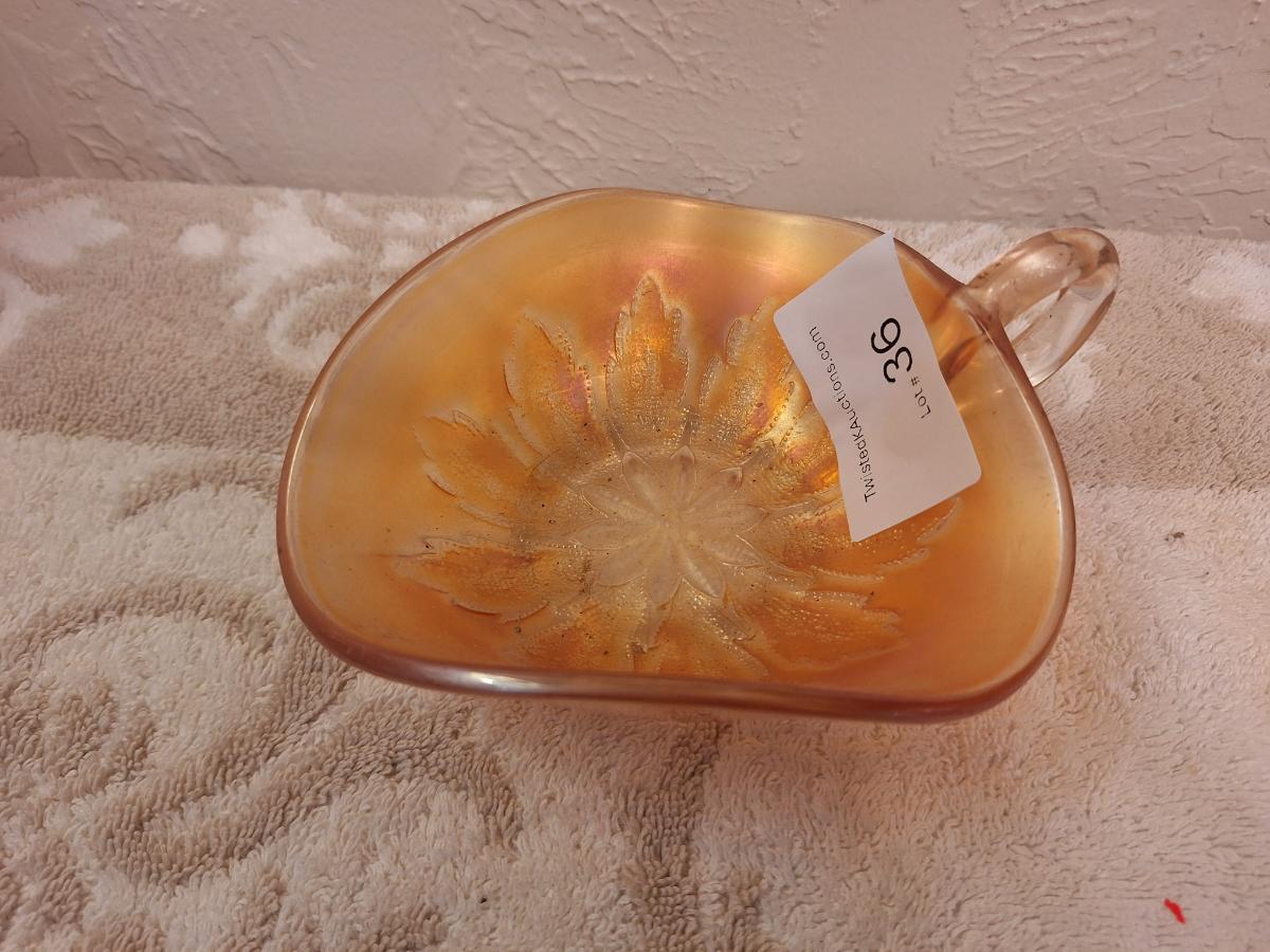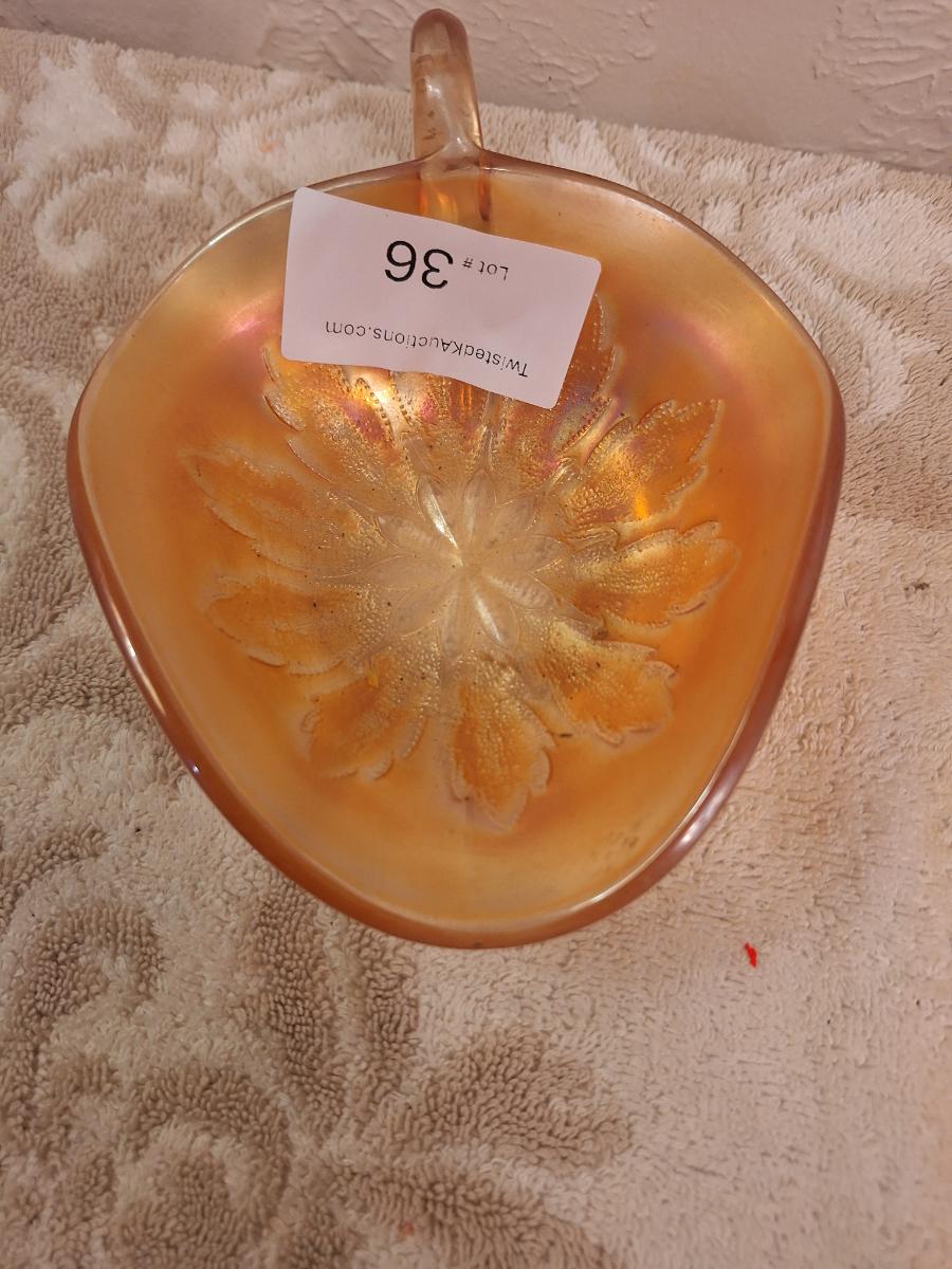 Dugan Leaf Rays peach opalescent carnival glass nappy bowl.