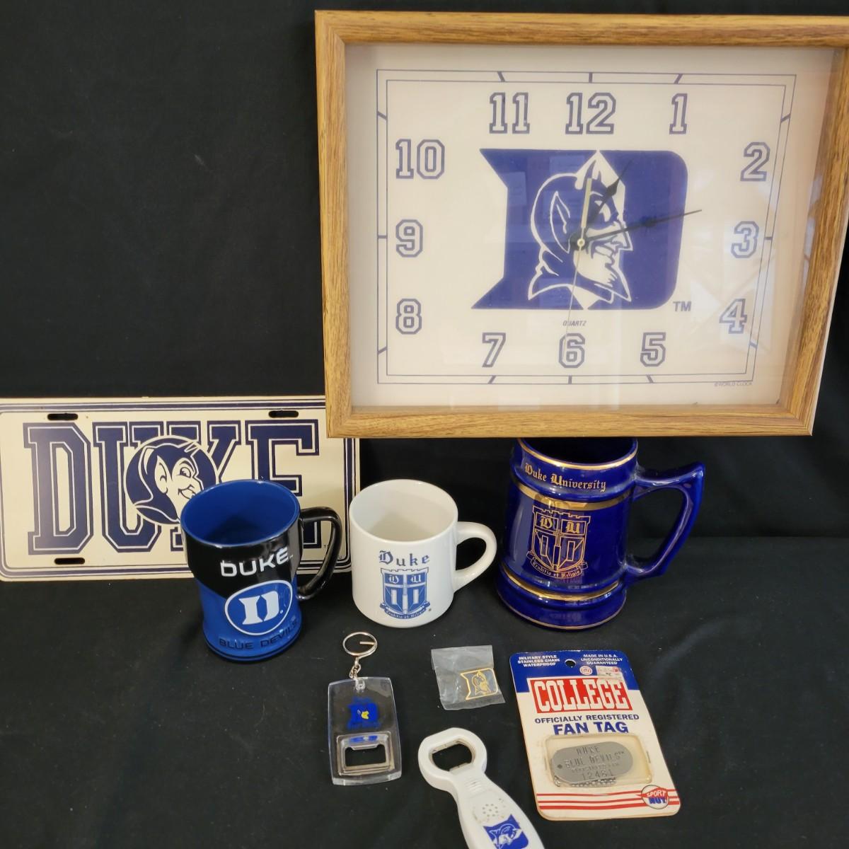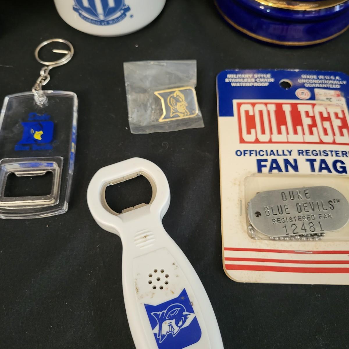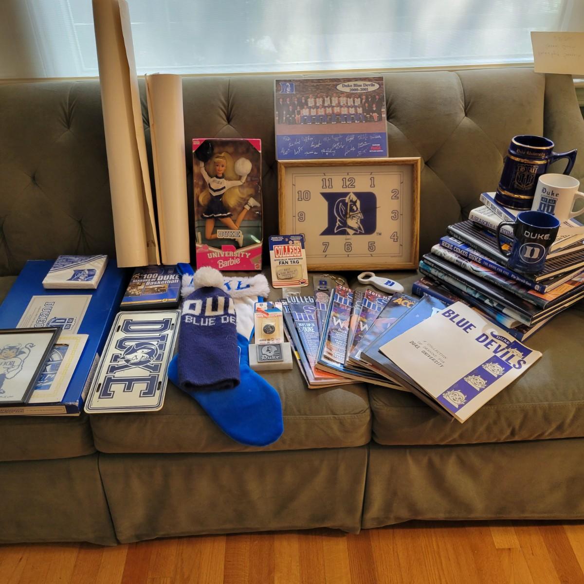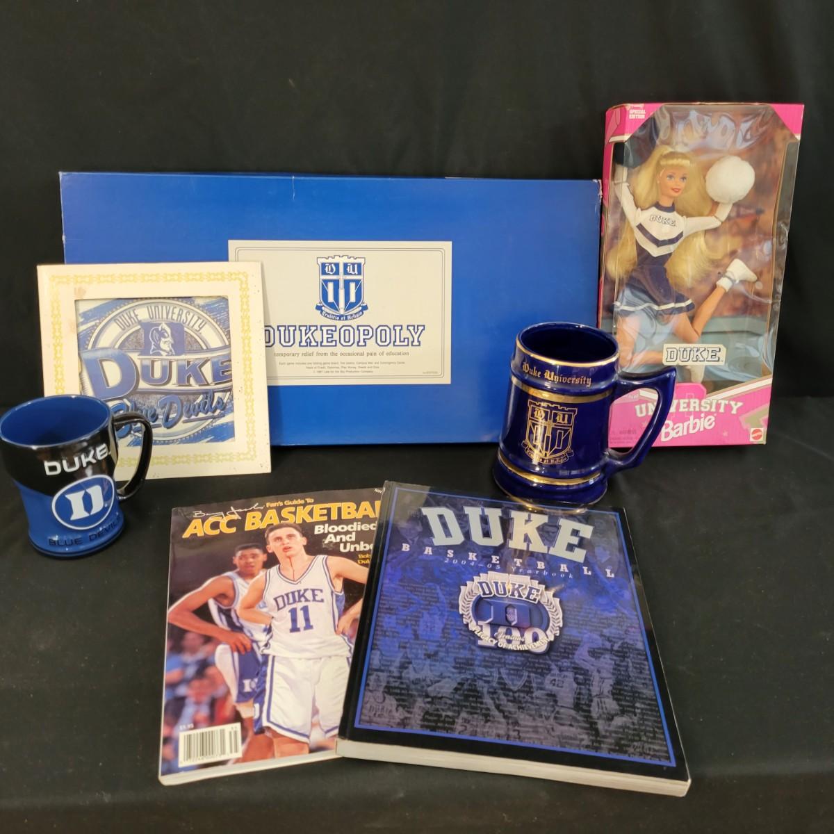 A huge lot of Duke University memorabilia that is in good condition overall. Some posters have some damage, see attached pictures for more detail. If you're a huge Duke fan, you’ll want this collection! Books, posters, magazines, pins, bottle openers, mugs, clocks, a laminated Blue Devils 2000-2001 roster photo, and much more! There's even a Duke Barbie! Largest poster measures approximately 25" x 30".