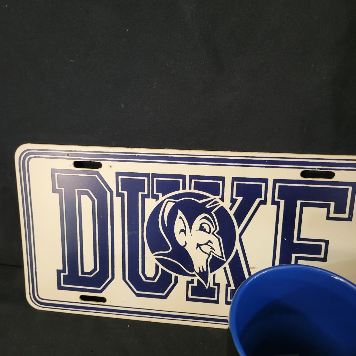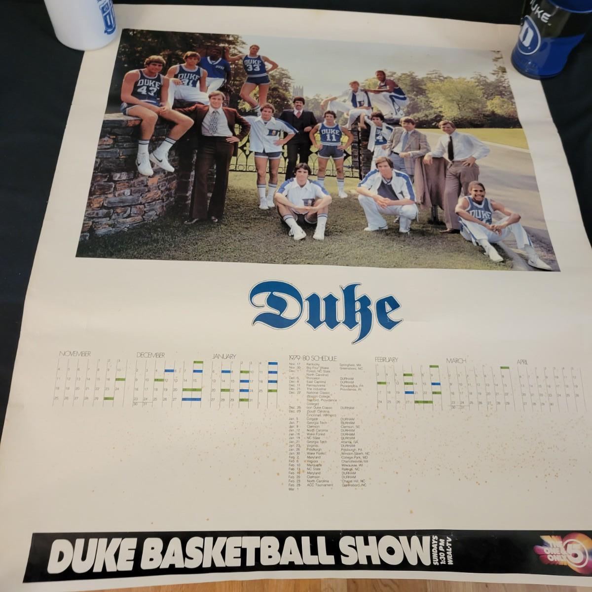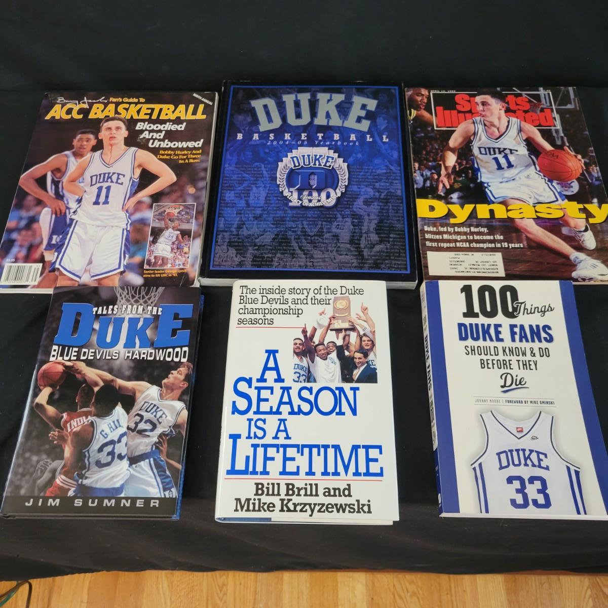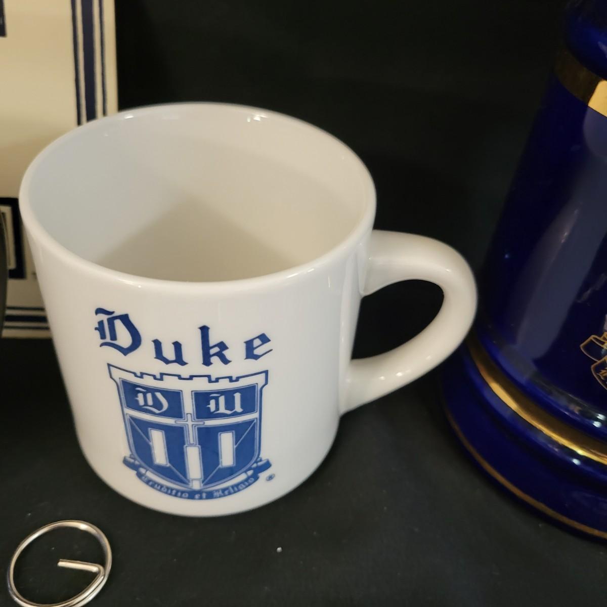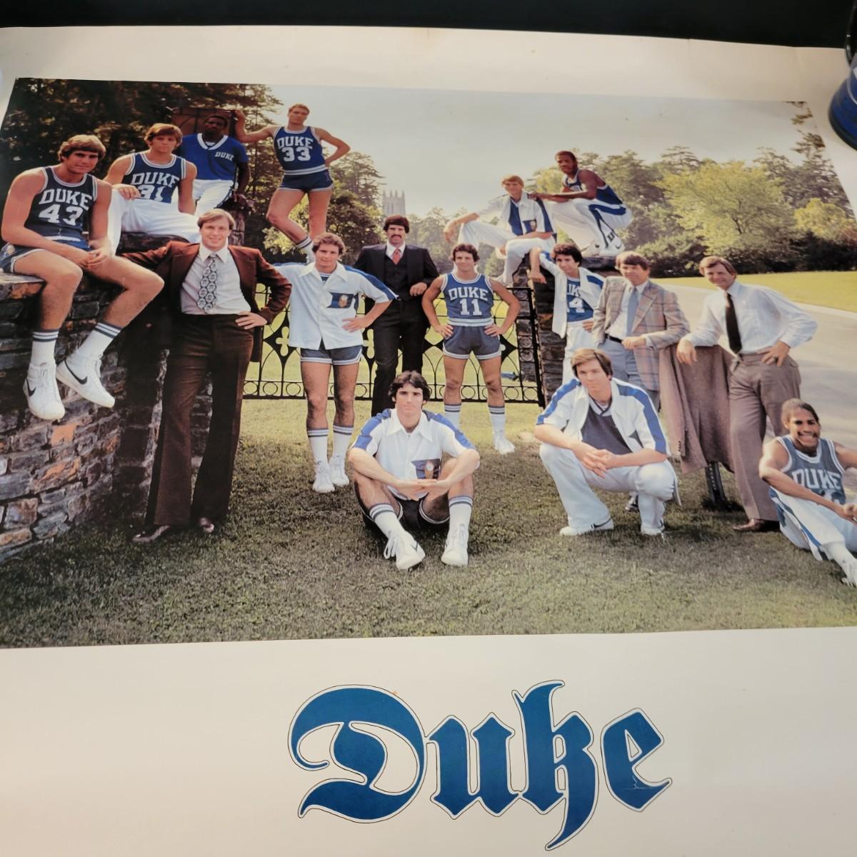 A huge lot of Duke University memorabilia that is in good condition overall. Some posters have some damage, see attached pictures for more detail. If you're a huge Duke fan, you’ll want this collection! Books, posters, magazines, pins, bottle openers, mugs, clocks, a laminated Blue Devils 2000-2001 roster photo, and much more! There's even a Duke Barbie! Largest poster measures approximately 25" x 30".