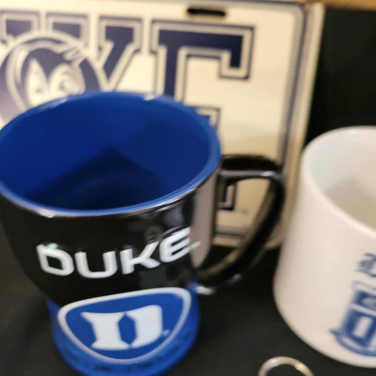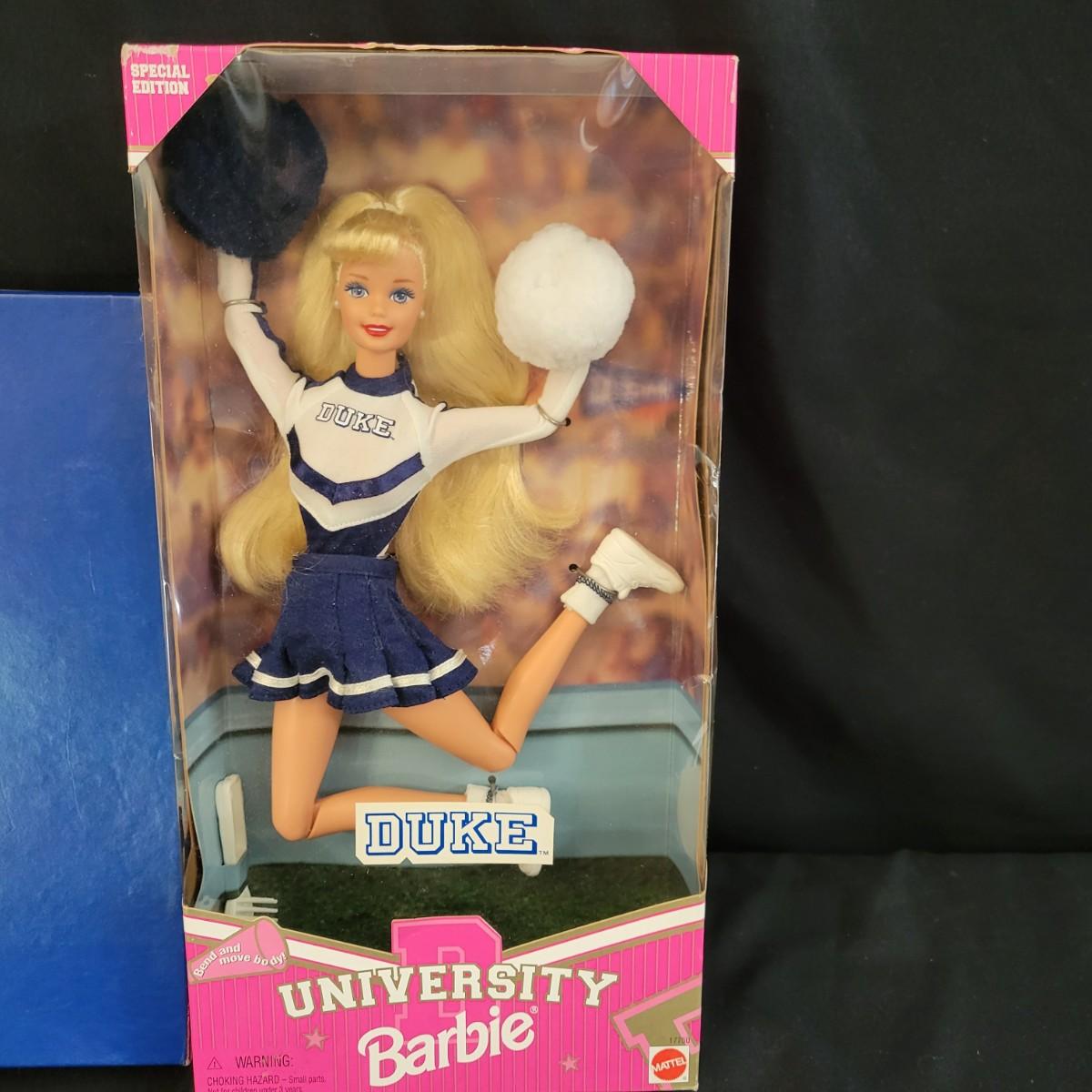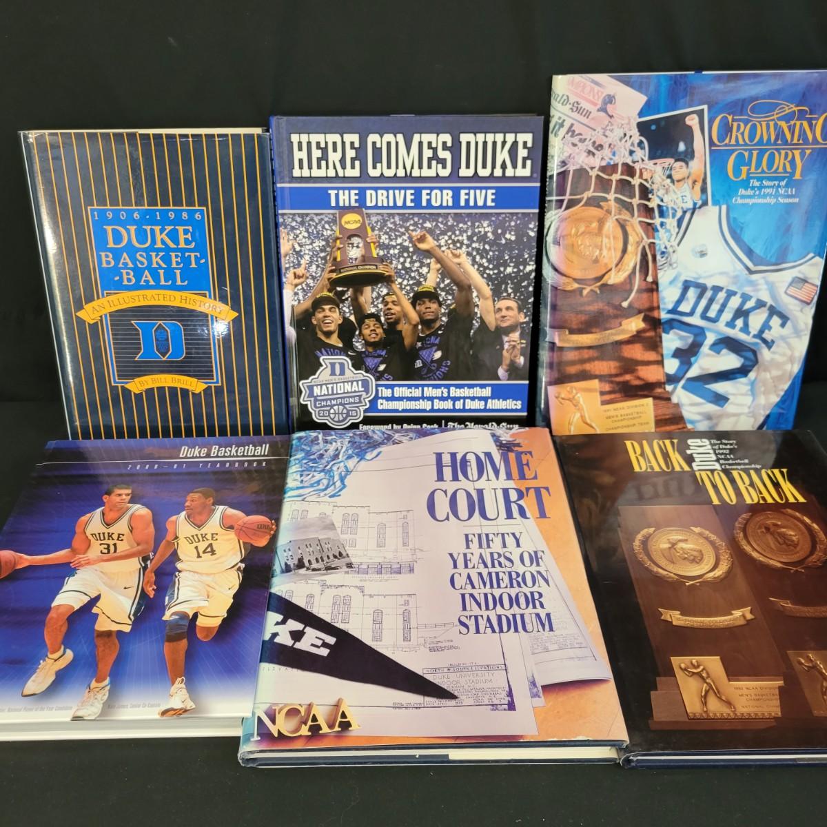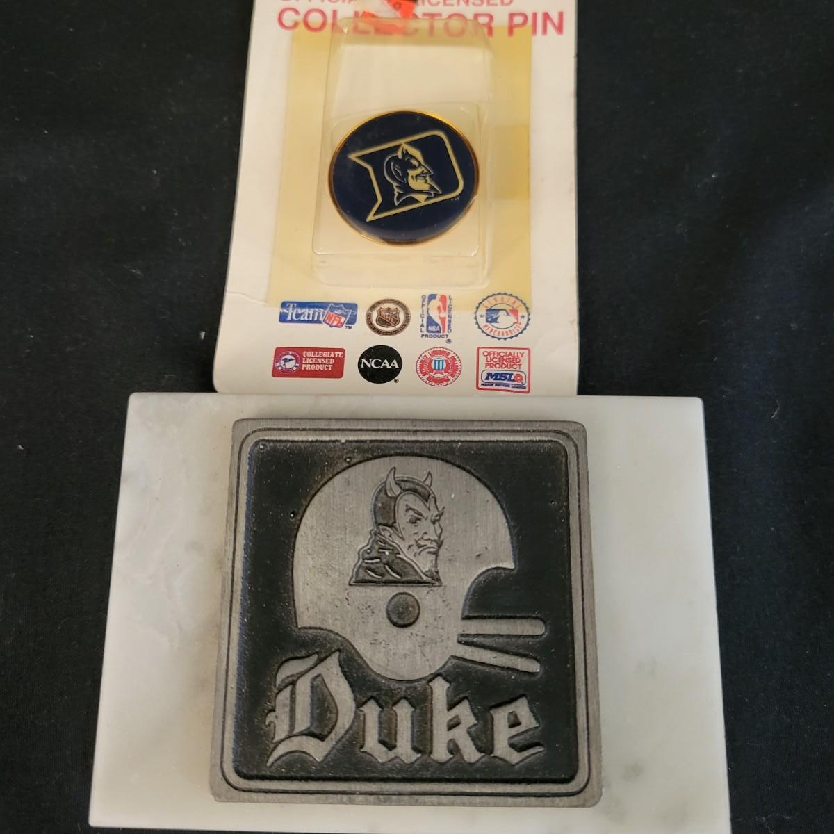 A huge lot of Duke University memorabilia that is in good condition overall. Some posters have some damage, see attached pictures for more detail. If you're a huge Duke fan, you’ll want this collection! Books, posters, magazines, pins, bottle openers, mugs, clocks, a laminated Blue Devils 2000-2001 roster photo, and much more! There's even a Duke Barbie! Largest poster measures approximately 25" x 30".