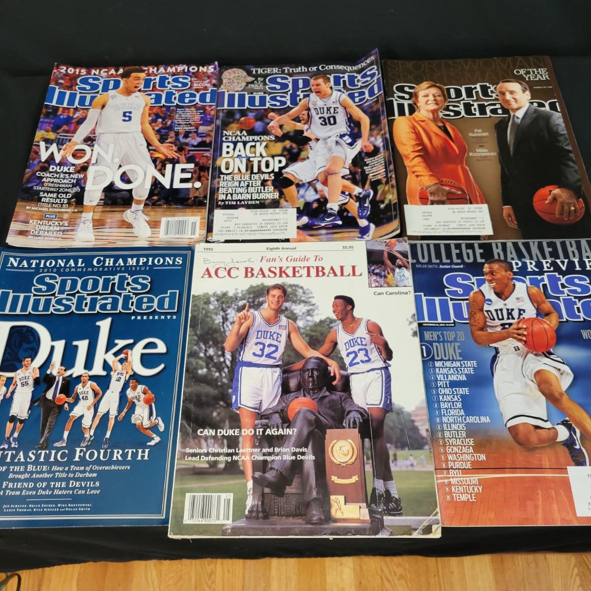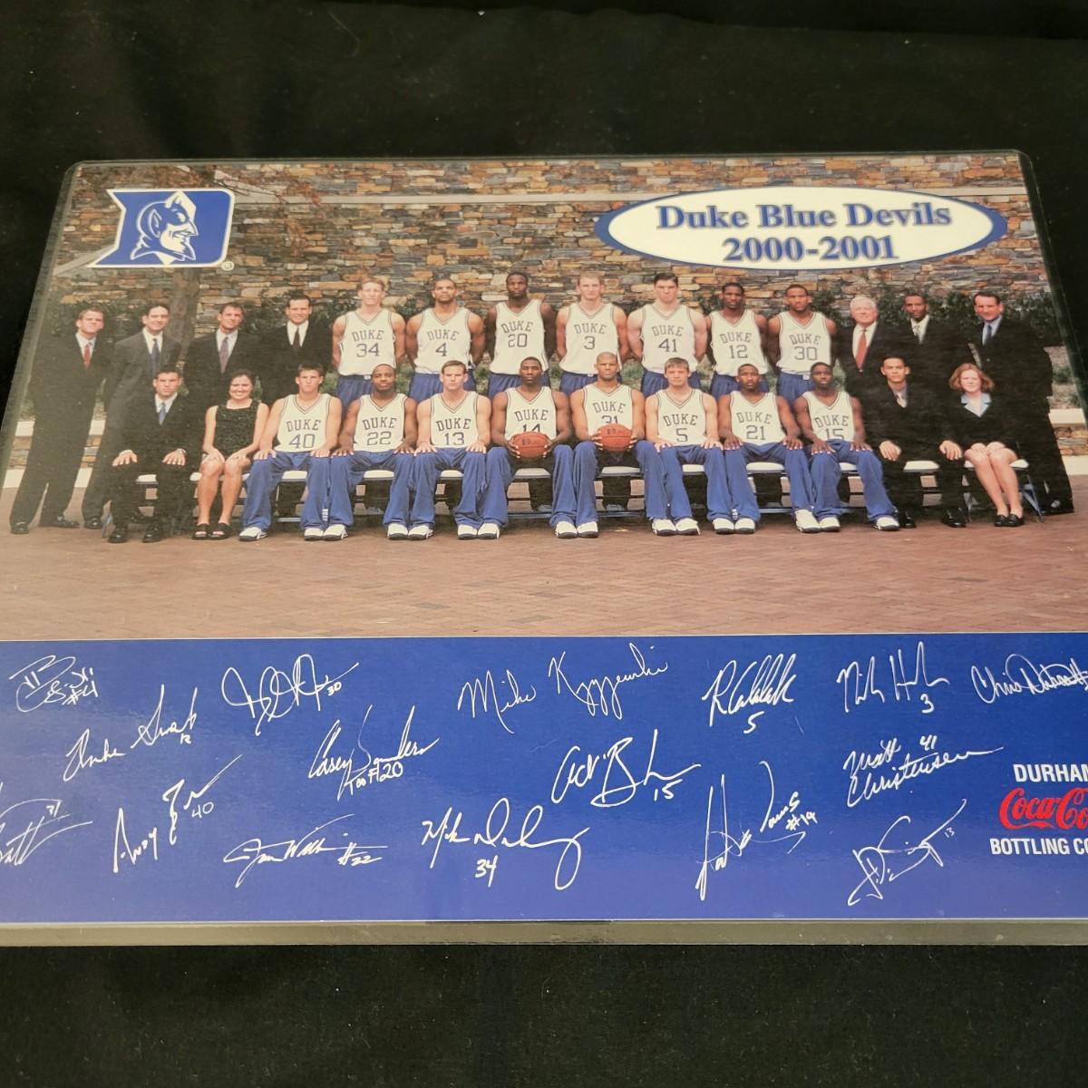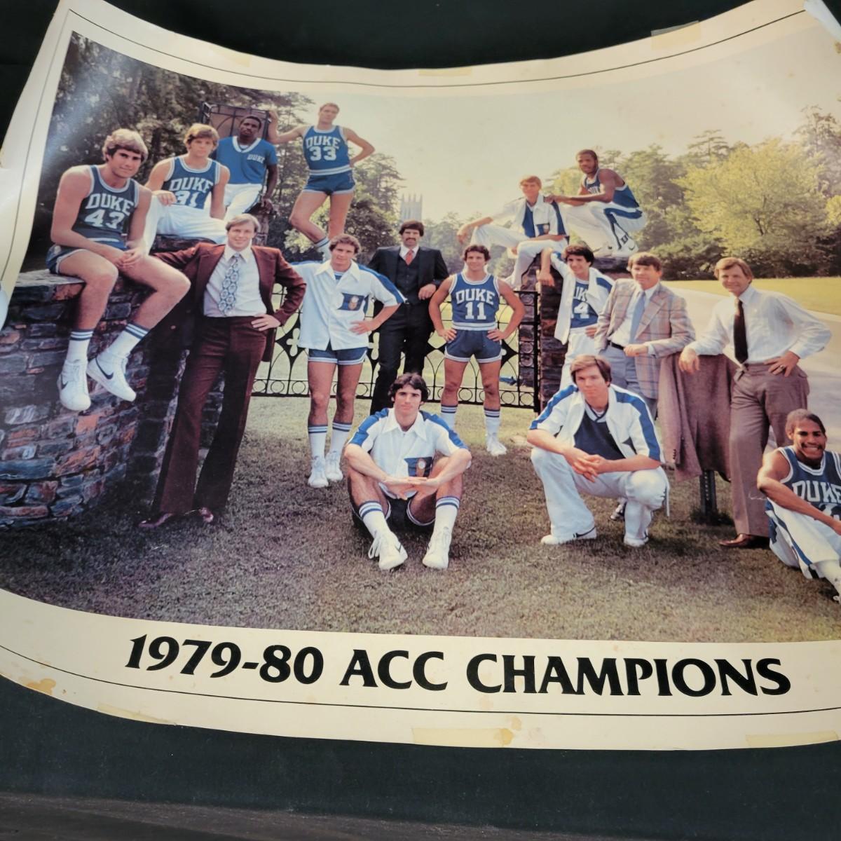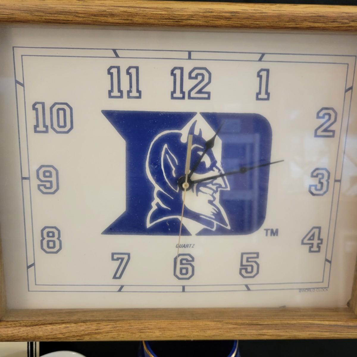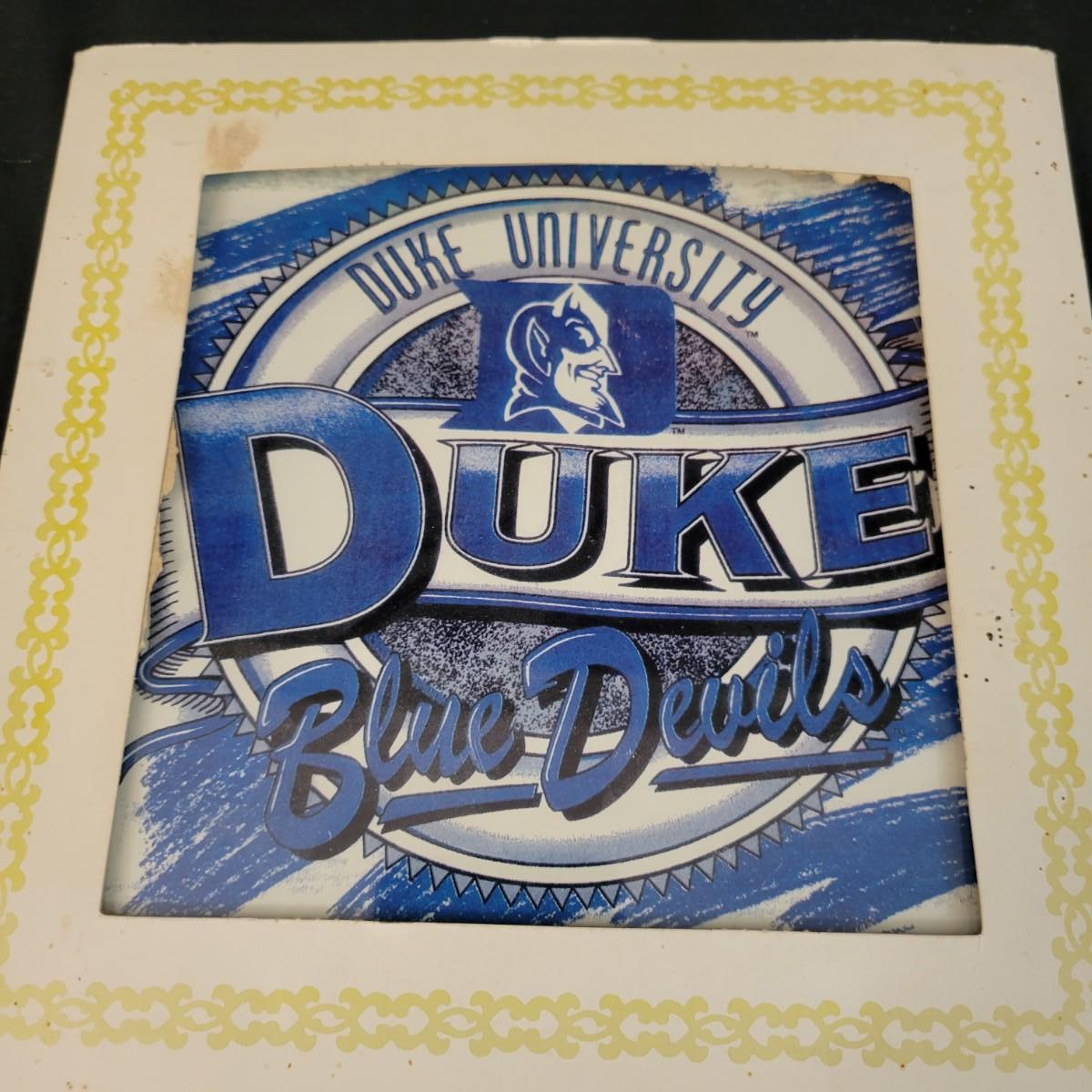A huge lot of Duke University memorabilia that is in good condition overall. Some posters have some damage, see attached pictures for more detail. If you're a huge Duke fan, you’ll want this collection! Books, posters, magazines, pins, bottle openers, mugs, clocks, a laminated Blue Devils 2000-2001 roster photo, and much more! There's even a Duke Barbie! Largest poster measures approximately 25" x 30".