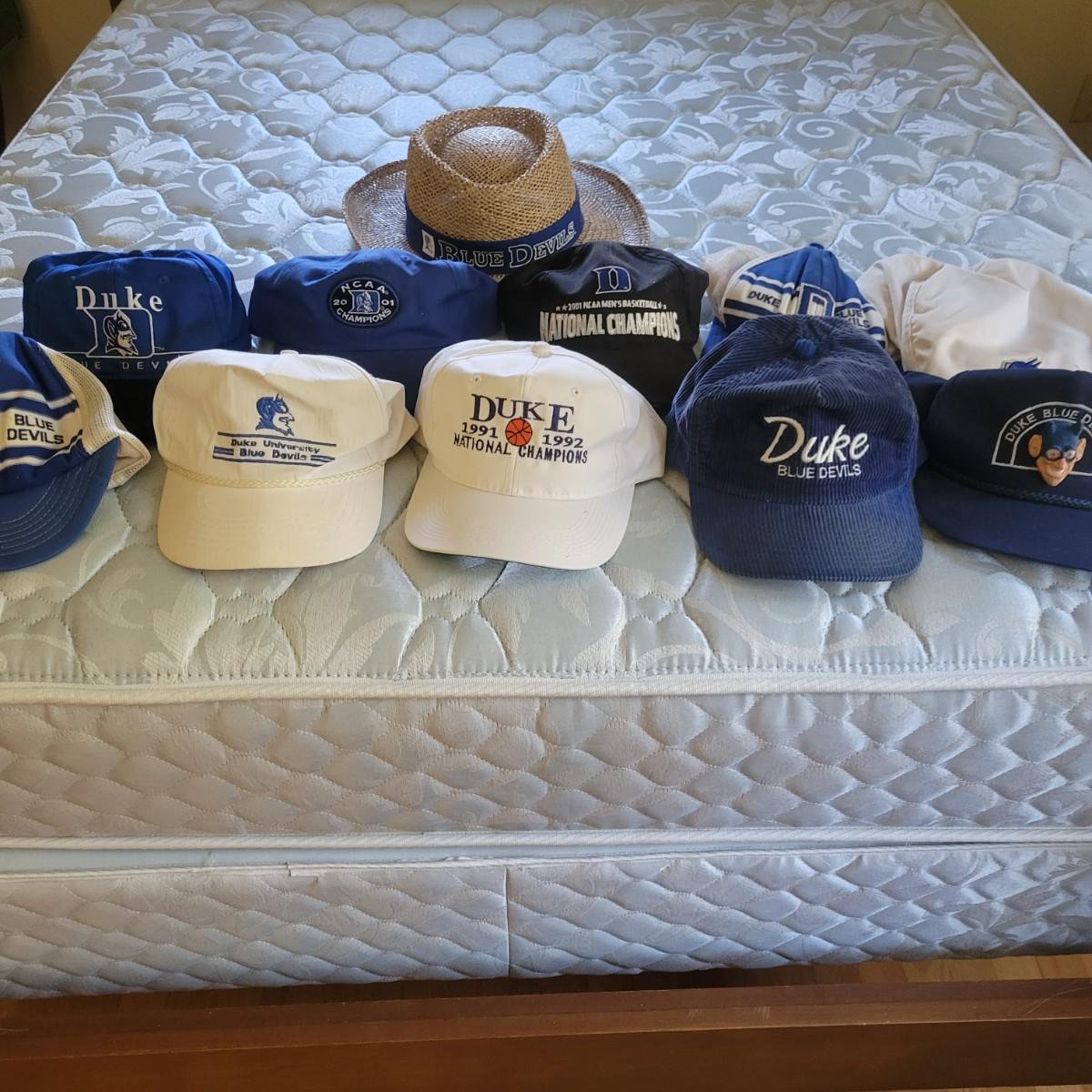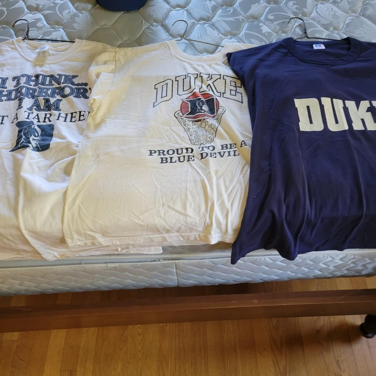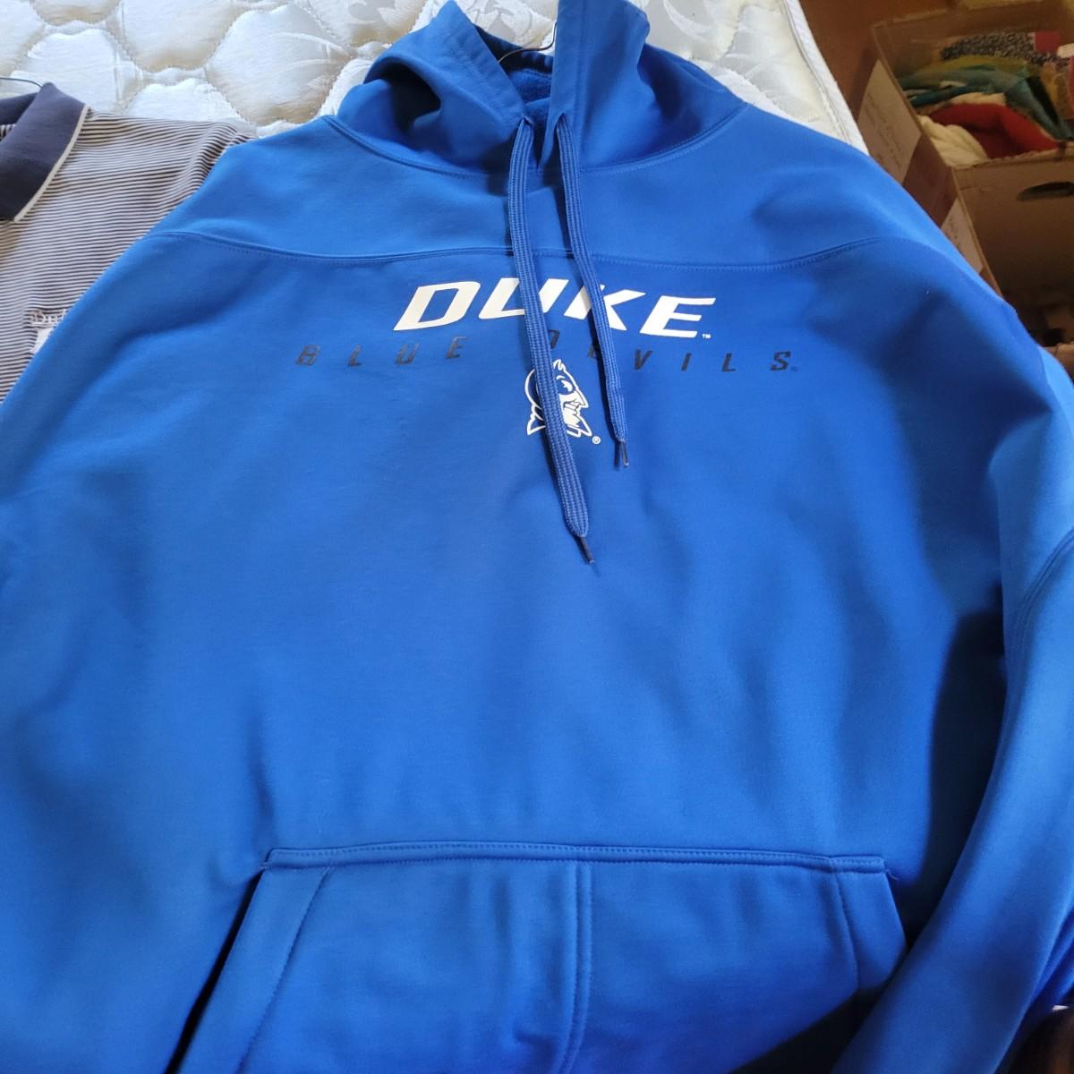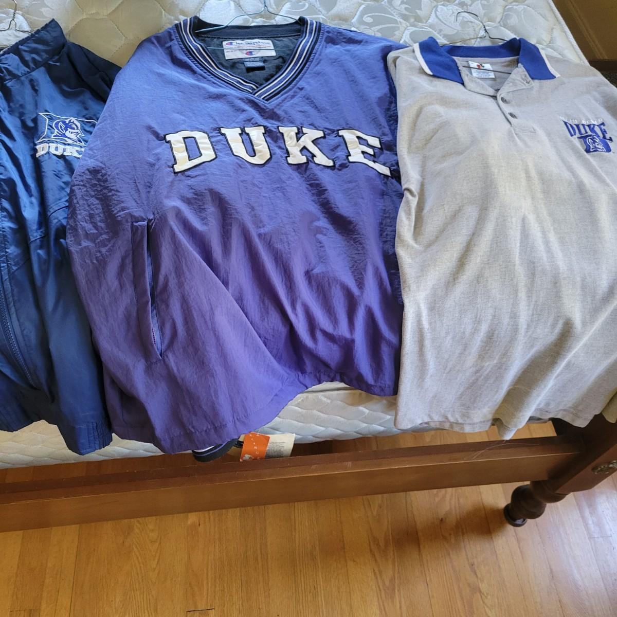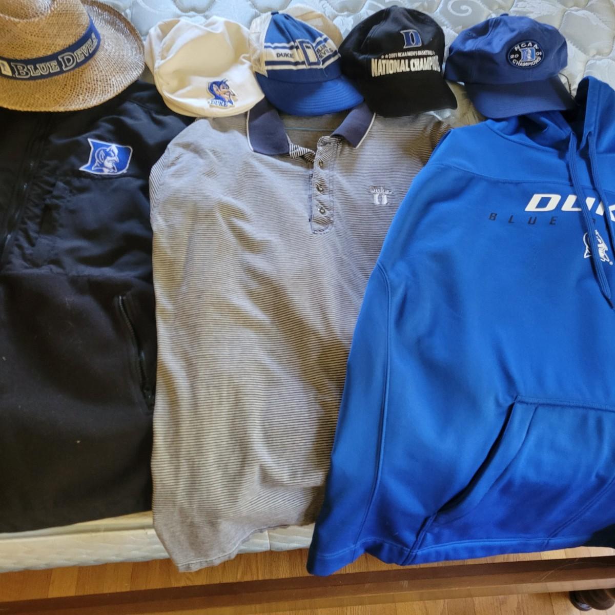 A large assortment of Duke University shirts, hoodies, Hats and more in good condition. Sizes range from sz L to XXL. Most of the Hats are one size fits all.