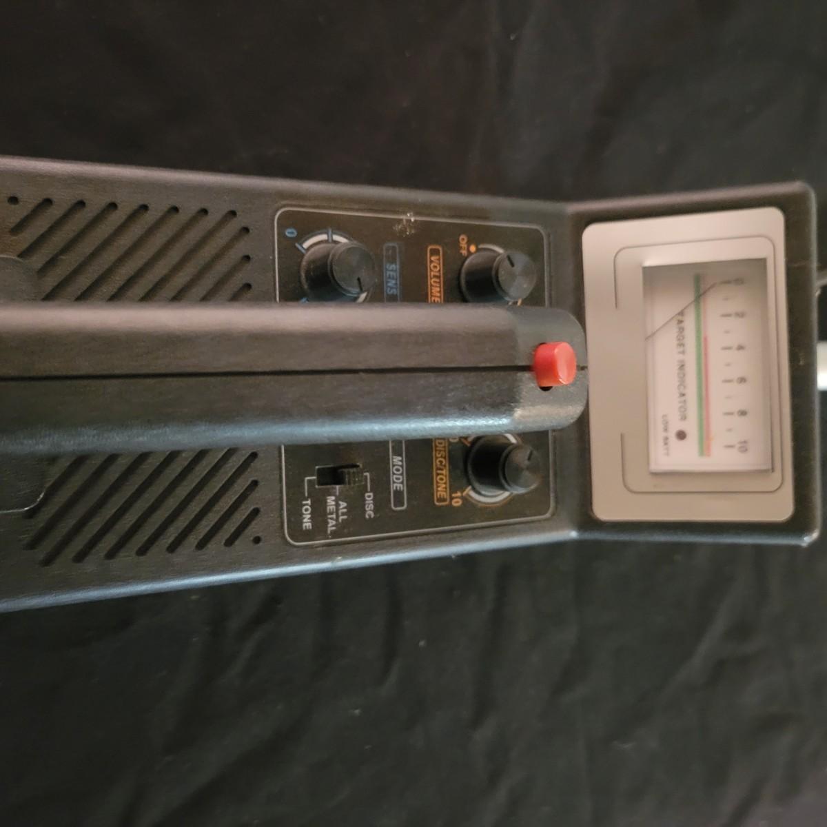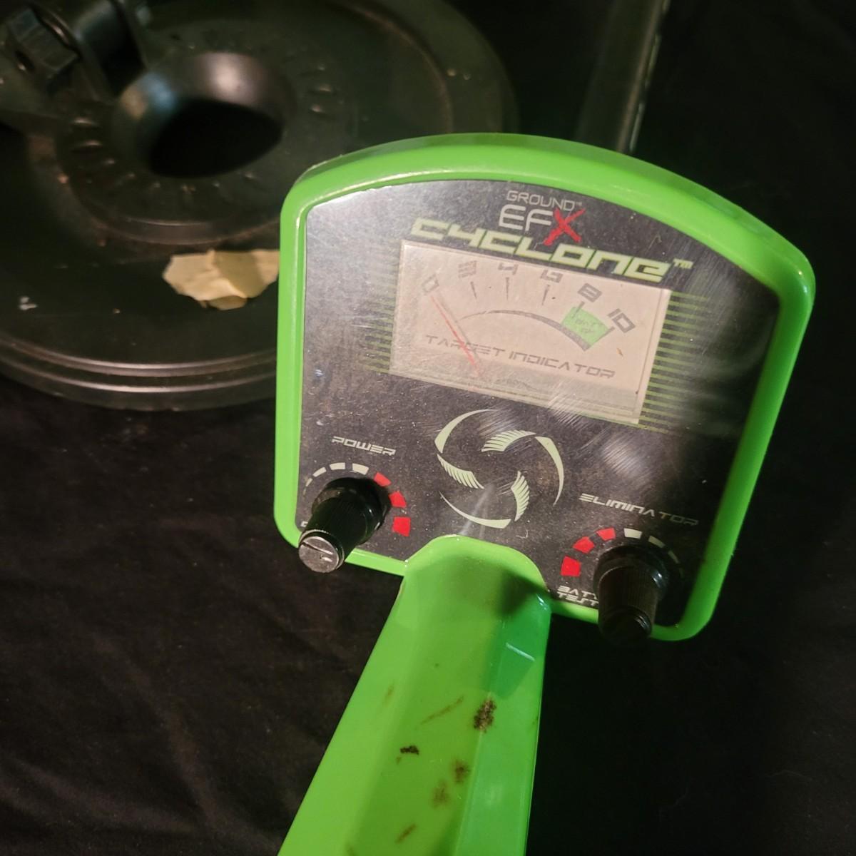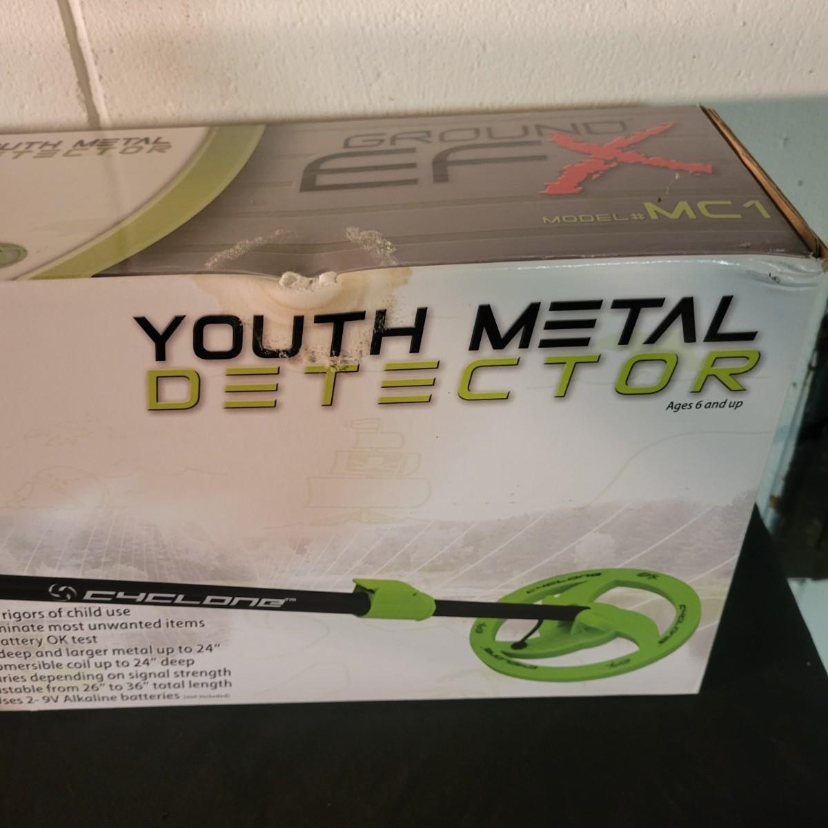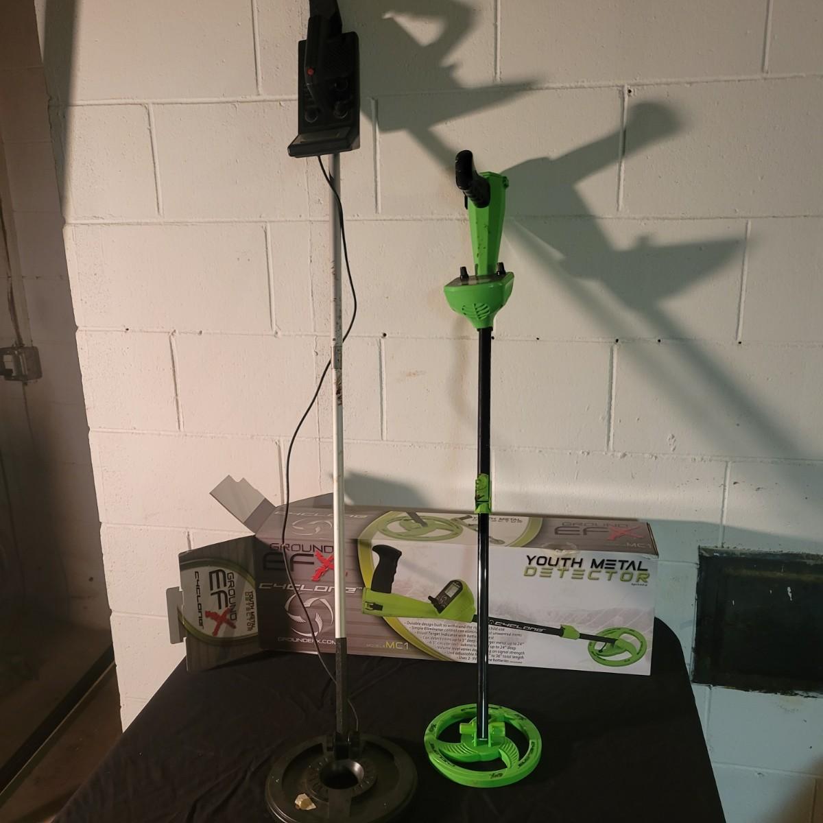 A pair of metal detectors in good condition, but could not be tested due to lacking batteries. Larger detector has no identifying manufacturer and runs off of 6 AA batteries. Measures approximately 52" tall. Youth detector is a Cyclone made by Ground EFX and is built to withstand child use. Unit is adjustable from 24" to 36" total length. Shipping available. Shipping can be costly please call UPS store at 828-252-6930 for quote
