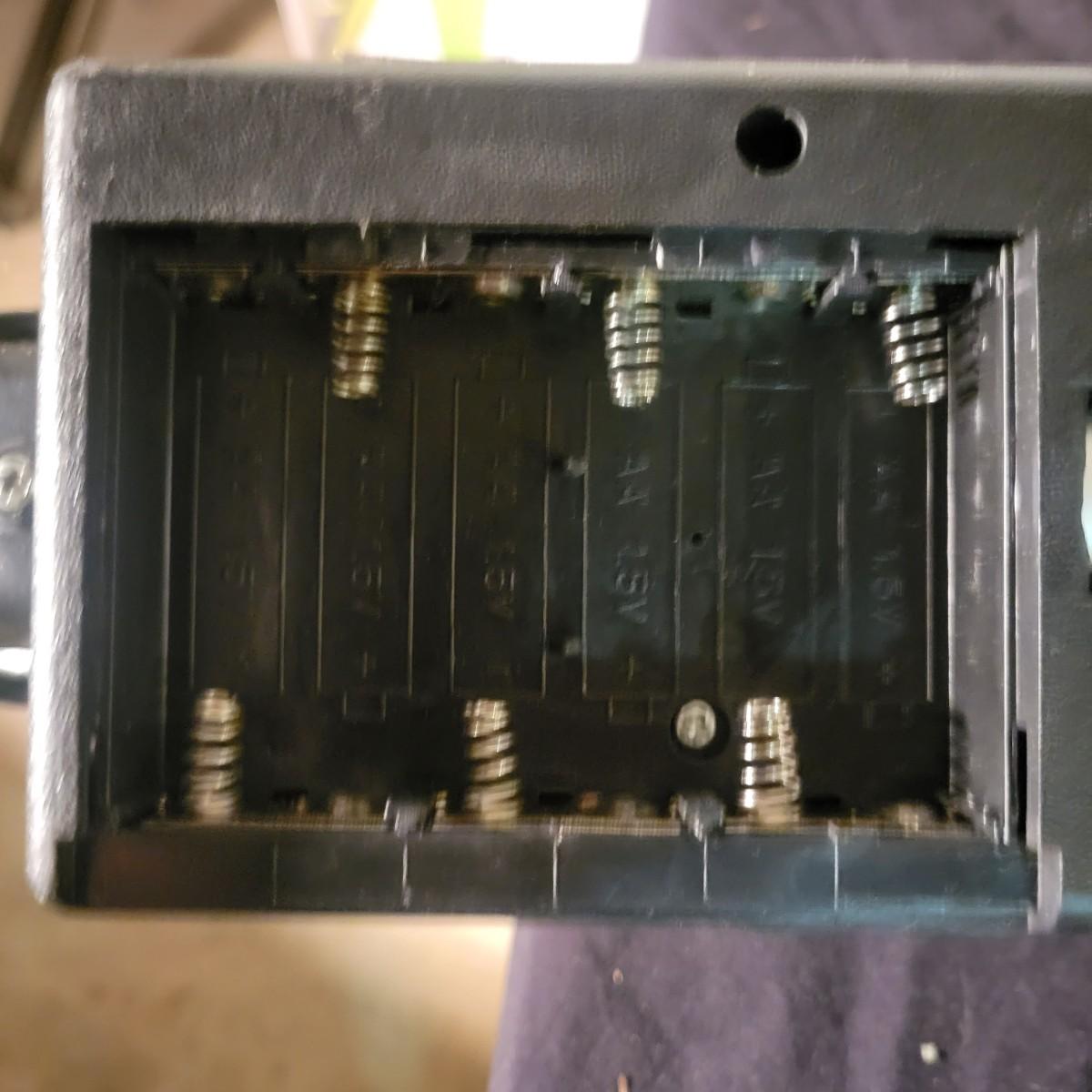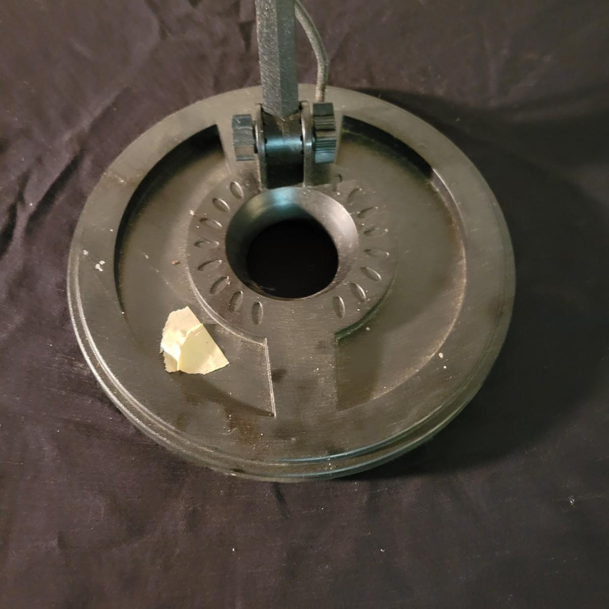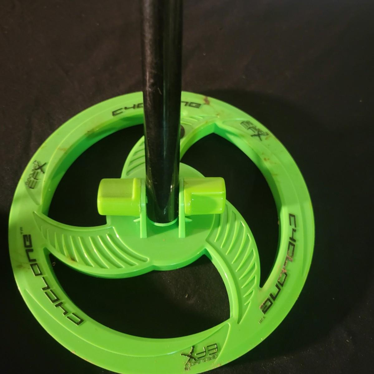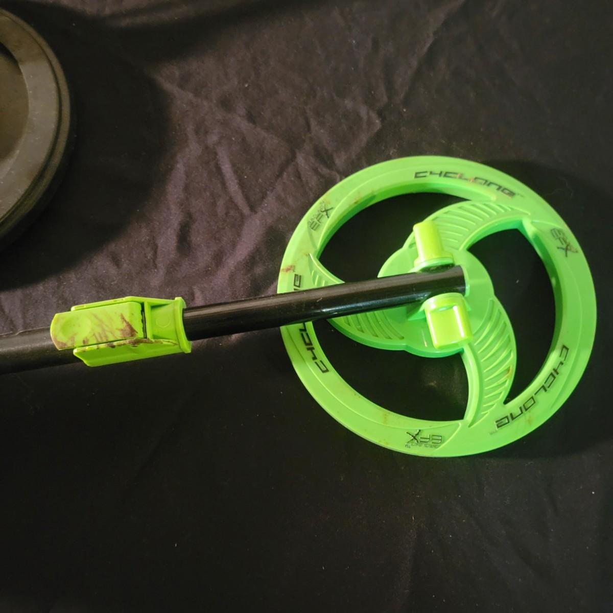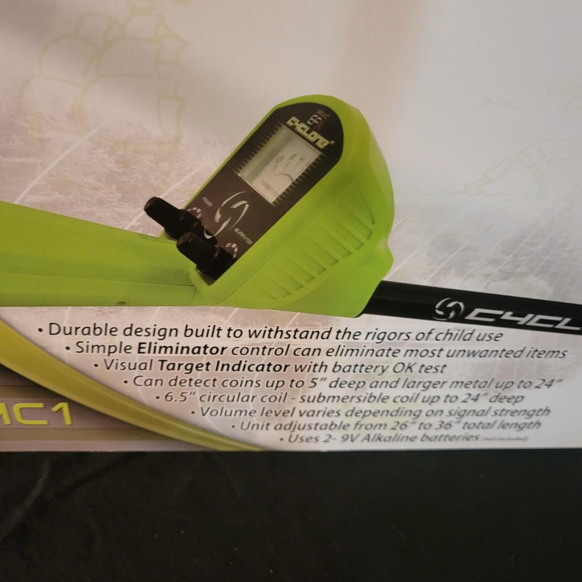 A pair of metal detectors in good condition, but could not be tested due to lacking batteries. Larger detector has no identifying manufacturer and runs off of 6 AA batteries. Measures approximately 52" tall. Youth detector is a Cyclone made by Ground EFX and is built to withstand child use. Unit is adjustable from 24" to 36" total length. Shipping available. Shipping can be costly please call UPS store at 828-252-6930 for quote