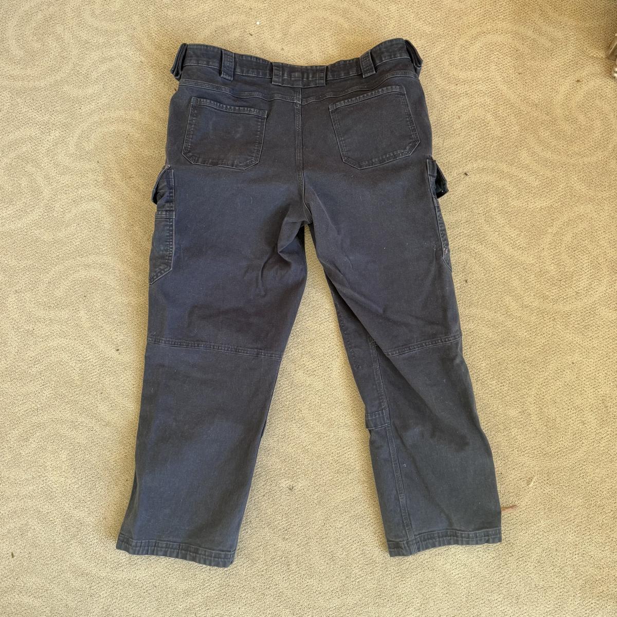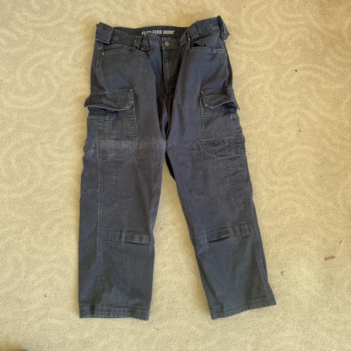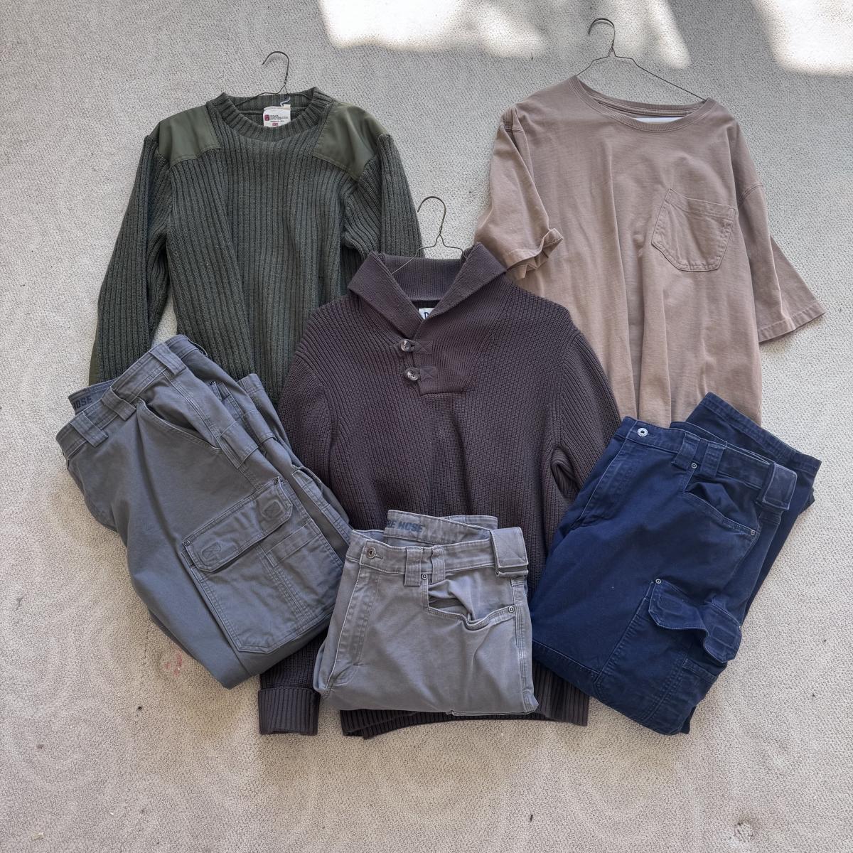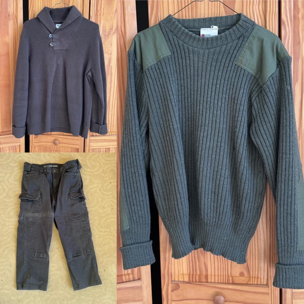 This lot includes three pairs of Duluth Flex Fire Hose pants in a size 40 x 30, one brown Duluth sweater in a size large, and one light brown Duluth t-shirt in a size XL. It also includes one green wool sweater by Brigade Quartermaster in a size 44. The back of the wool sweater has a few small holes on the top - see picture included. The Duluth pants have a few paint stains on them - see pictures. Shipping available.