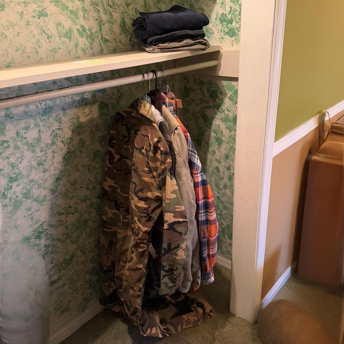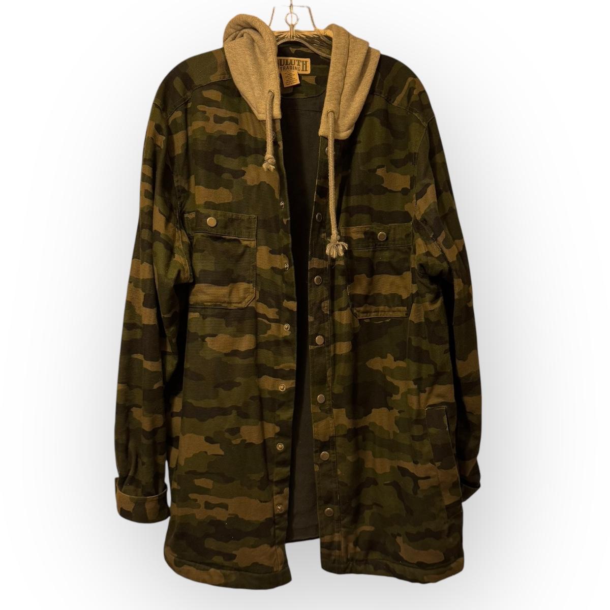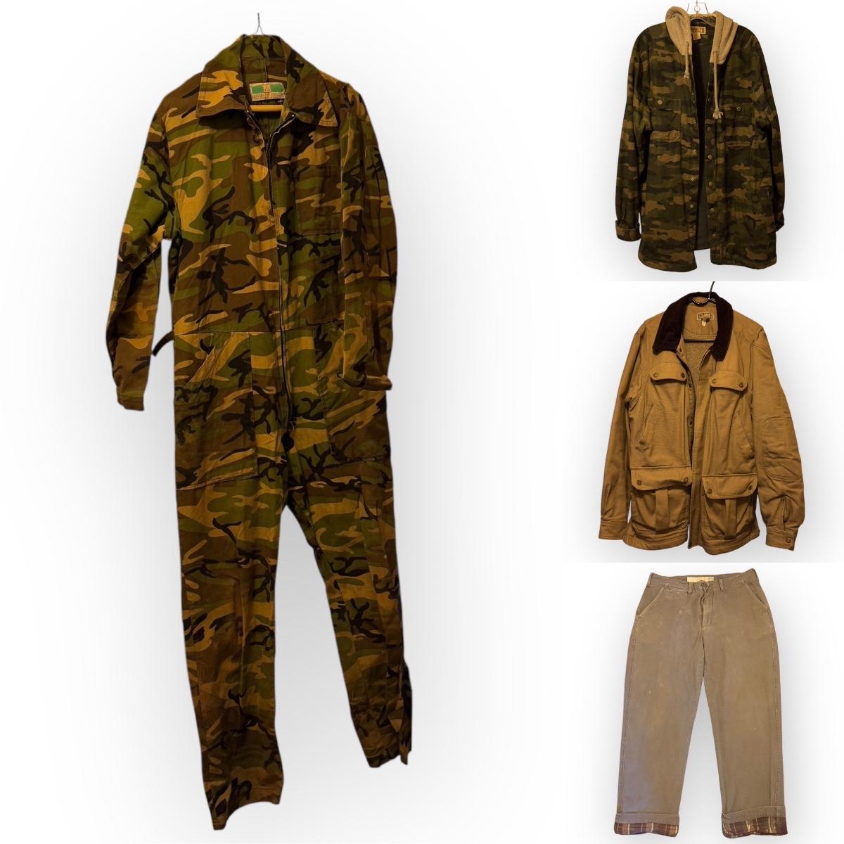 Lot includes one pair of camo coveralls by Game Winner (size large), one camo hoodie by DuLuth (size large), one khaki jacket by Duluth (size large), one DuLuth flannel (size large), and four pairs of pants. The pants are by L.L. Bean, DuLuth, and Cabela’s - all are size 34. The Cabela’s pants are lined with flannel. You’ll find a few stains on the bottom of the pants that appear to be removable - see picture included. Shipping available.